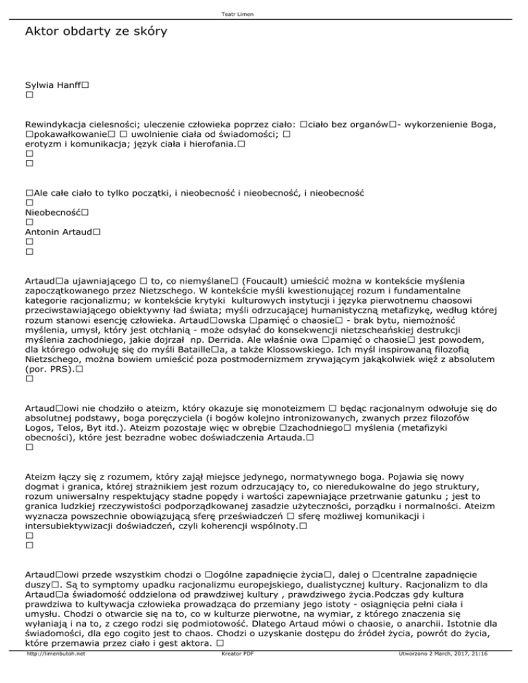 Teatr Limen Aktor obdarty ze skóry Sylwia Hanff Rewindykacja cielesności; uleczenie człowieka poprzez ciało: ciało bez organów- wykorzenienie Boga, pokawałkowanie uwolnienie ciała od świadomości; erotyzm i komunikacja; język ciała i hierofania. Ale całe ciało to tylko początki, i nieobecność i nieobecność, i nieobecność Nieobecność Antonin Artaud Artauda ujawniającego to, co niemyślane (Foucault) umieścić można w kontekście myślenia zapoczątkowanego przez Nietzschego. W kontekście myśli kwestionującej rozum i fundamentalne kategorie racjonalizmu; w kontekście krytyki kulturowych instytucji i języka pierwotnemu chaosowi przeciwstawiającego obiektywny ład świata; myśli odrzucającej humanistyczną metafizykę, według której rozum stanowi esencję człowieka. Artaudowska pamięć o chaosie - brak bytu, niemożność myślenia, umysł, który jest otchłanią - może odsyłać do konsekwencji nietzscheańskiej destrukcji myślenia zachodniego, jakie dojrzał np. Derrida. Ale właśnie owa pamięć o chaosie jest powodem, dla którego odwołuję się do myśli Bataillea, a także Klossowskiego. Ich myśl inspirowaną filozofią Nietzschego, można bowiem umieścić poza postmodernizmem zrywającym jakąkolwiek więź z absolutem (por. PRS). Artaudowi nie chodziło o ateizm, który okazuje się monoteizmem będąc racjonalnym odwołuje się do absolutnej podstawy, boga poręczyciela (i bogów kolejno intronizowanych, zwanych przez filozofów Logos, Telos, Byt itd.). Ateizm pozostaje więc w obrębie zachodniego myślenia (metafizyki obecności), które jest bezradne wobec doświadczenia Artauda. Ateizm łączy się z rozumem, który zajął miejsce jedynego, normatywnego boga. Pojawia się nowy dogmat i granica, której strażnikiem jest rozum odrzucający to, co nieredukowalne do jego struktury, rozum uniwersalny respektujący stadne popędy i wartości zapewniające przetrwanie gatunku ; jest to granica ludzkiej rzeczywistości podporządkowanej zasadzie użyteczności, porządku i normalności. Ateizm wyznacza powszechnie obowiązującą sferę przeświadczeń sferę możliwej komunikacji i intersubiektywizacji doświadczeń, czyli koherencji wspólnoty. Artaudowi przede wszystkim chodzi o ogólne zapadnięcie życia, dalej o centralne zapadnięcie duszy. Są to symptomy upadku racjonalizmu europejskiego, dualistycznej kultury. Racjonalizm to dla Artauda świadomość oddzielona od prawdziwej kultury , prawdziwego życia.Podczas gdy kultura prawdziwa to kultywacja człowieka prowadząca do przemiany jego istoty - osiągnięcia pełni ciała i umysłu. Chodzi o otwarcie się na to, co w kulturze pierwotne, na wymiar, z którego znaczenia się wyłaniają i na to, z czego rodzi się podmiotowość. Dlatego Artaud mówi o chaosie, o anarchii. Istotnie dla świadomości, dla ego cogito jest to chaos. Chodzi o uzyskanie dostępu do źródeł życia, powrót do życia, które przemawia przez ciało i gest aktora. http://limenbutoh.net Kreator PDF Utworzono 2 March, 2017, 21:16 Teatr Limen Artaudowski Teatr Okrucieństwa jest widowiskiem życia - tego, co przedpojęciowe, nieobecne. Jest otwarciem na nieskończoność i spotkaniem tego, co inne. Będąc materialną projekcją, tego, co ciemne w umyśle, pozwala poznać to, co podlega cenzurze rozumu. Odrzucając prymat tekstu na rzecz pierwotnego języka (hieroglifów), jest manifestacją tego, co Niewyrażalne - sił życia. Teatr Okrucieństwa byłby więc teatrem odmienności, teatrem myśli tragicznej - teatrem, w którym przedstawienie nie jest poznaniem - odmienności nie da się przedstawić - ale próbą uchwycenia tego, co wymyka się językowi; teatrem, w którym przedstawienie jest nadawaniem formy. Teatr jest środkiem poznania patetycznego. Destrukcji podmiotu towarzyszy próba (re)konstrukcji istoty nie-kartezjańskiej, znalezienia innego podmiotu. Teatr Alchemiczny jest pozorem, który pozwala na uczestnictwo w tajemnicy, będąc jednocześnie tworzeniem złota - koherencji szaleństwa: rytuałem osobistym pozwalającym stworzyć nowy podmiot, świadomość bez nośnika (Klossowski) - Sobowtóra. Tym samym jest dotarciem do prawdziwej tożsamości - mnogości demonów (przeciwstawionej hipostazie Jednego) - aktualizacją tkwiących w osobie natur. Teatr Okrucieństwa to okrutna inscenizacja Sobowtóra (DNA) możliwa dzięki zastąpieniu teorii mimesis teorią analogii. Teatr Artauda to Wielka Analogia tego, co rzeczywiste. Znakiem jego jest Okrucieństwo - symbol rzeczywistości, która się rozpadła, i Sobowtór symbol tego, że wielość nie oznacza szaleństwa. Klossowski i Bataille - filozofowie, do których się odwołuję - umieszczają na pierwszym planie swych rozważań figury chaosu i szaleństwa (por. PRS s.20). To właśnie Artaud urzeczony chaosem, balansując na krawędzi szaleństwa, przeżył, podobnie jak Nietzsche, problem [...] pełnego człowieka (Bataille) suwerennego, bo uwolnionego od Boga. Świadczy o tym postulat skończenia z sądem bożym, postulat, który jednak nie odnosi się do optymistycznej wizji w pełni suwerennego człowieka, który uwolnił się od boga i na racjonalnych zasadach buduje swoją rzeczywistość. Artaud wpisuje się tym samym w krąg myślenia ujawniającego niekonsekwencje ateistycznego rozumu. Czysto ateistyczny gest usunięcia Boga na rzecz Rozumu / Natury / Człowieka jest gestem pozornym, bowiem zajęły one tylko miejsce Boga (owe rewolucje szybko przechodziły do stanu, w którym przywrócone zostają normy i instytucje wywodzące się od zabitego Boga). Podstawowym zagadnieniem nasuwającym się w związku z wizją Artauda jest pytanie o Tożsamość i Sobowtóra, czyli o to, co autentyczne. Kwestia ta jest ważna w odniesieniu do teatru o tyle, o ile ta właśnie sztuka najbardziej obciążona była kategorią mimesis, rozumianą jako naśladowanie, przedstawianie rzeczywistości. Ale problem ten dotyczy tego, co autentyczne w cał