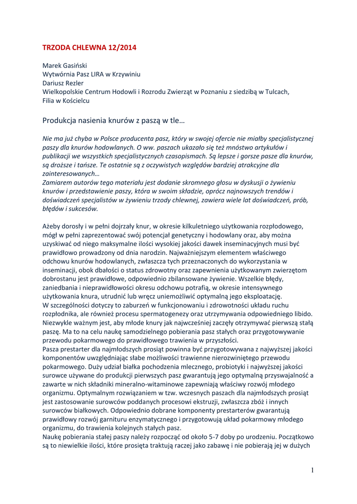 TRZODA CHLEWNA 12/2014 Marek Gasiński Wytwórnia Pasz LIRA w Krzywiniu Dariusz Rezler Wielkopolskie Centrum Hodowli i Rozrodu Zwierząt w Poznaniu z siedzibą w Tulcach, Filia w Kościelcu Produkcja nasienia knurów z paszą w tle… Nie ma już chyba w Polsce producenta pasz, który w swojej ofercie nie miałby specjalistycznej paszy dla knurów hodowlanych. O ww. paszach ukazało się też mnóstwo artykułów i publikacji we wszystkich specjalistycznych czasopismach. Są lepsze i gorsze pasze dla knurów, są droższe i tańsze. Te ostatnie są z oczywistych względów bardziej atrakcyjne dla zainteresowanych… Zamiarem autorów tego materiału jest dodanie skromnego głosu w dyskusji o żywieniu knurów i przedstawienie paszy, która w swoim składzie, oprócz najnowszych trendów i doświadczeń specjalistów w żywieniu trzody chlewnej, zawiera wiele lat doświadczeń, prób, błędów i sukcesów. Ażeby dorosły i w pełni dojrzały knur, w okresie kilkuletniego użytkowania rozpłodowego, mógł w pełni zaprezentować swój potencjał genetyczny i hodowlany oraz, aby można uzyskiwać od niego maksymalne ilości wysokiej jakości dawek inseminacyjnych musi być prawidłowo prowadzony od dnia narodzin. Najważniejszym elementem właściwego odchowu knurów hodowlanych, zwłaszcza tych przeznaczonych do wykorzystania w inseminacji, obok dbałości o status zdrowotny oraz zapewnienia użytkowanym zwierzętom dobrostanu jest prawidłowe, odpowiednio zbilansowane żywienie. Wszelkie błędy, zaniedbania i nieprawidłowości okresu odchowu potrafią, w okresie intensywnego użytkowania knura, utrudnić lub wręcz uniemożliwić optymalną jego eksploatację. W szczególności dotyczy to zaburzeń w funkcjonowaniu i zdrowotności układu ruchu rozpłodnika, ale również procesu spermatogenezy oraz utrzymywania odpowiedniego libido. Niezwykle ważnym jest, aby młode knury jak najwcześniej zaczęły otrzymywać pierwszą stałą paszę. Ma to na celu naukę samodzielnego pobierania pasz stałych oraz przygotowywanie przewodu pokarmowego do prawidłowego trawienia w przyszłości. Pasza prestarter dla najmłodszych prosiąt powinna być przygotowywana z najwyższej jakości komponentów uwzględniając słabe możliwości trawienne nierozwiniętego przewodu pokarmowego. Duży udział białka pochodzenia mlecznego, probiotyki i najwyższej jakości surowce używane do produkcji pierwszych pasz gwarantują jego optymalną przyswajalność a zawarte w nich składniki mineralno-witaminowe zapewniają właściwy rozwój młodego organizmu. Optymalnym rozwiązaniem w tzw. wczesnych paszach dla najmłodszych prosiąt jest zastosowanie surowców poddanych procesowi ekstruzji, zwłaszcza zbóż i innych surowców białkowych. Odpowiednio dobrane komponenty prestarterów gwarantują prawidłowy rozwój garnituru enzymatycznego i przygotowują układ pokarmowy młodego organizmu, do trawienia kolejnych stałych pasz. Naukę pobierania stałej paszy należy rozpocząć od około 5-7 doby po urodzeniu. Początkowo są to niewielkie ilości, które prosięta traktują raczej jako zabawę i nie pobierają jej w dużych 1 ilościach. Im częściej zadaje się im świeżą paszę, tym lepiej reagują na jej obecność a częste wymiany paszy zapewniają podawanie zwierzętom paszy o najwyższej wartości. Do chwili odsadzenia od matek powinny one zjadać samodzielnie około 0,5 kg paszy. Po odsadzeniu, w wieku ok. 30 dni, w masie ciała 7-8 kg prosięta powinny być już niemal w pełni przygotowane do samodzielnego pobierania paszy. W następnym etapie odchowu – w pomieszczeniach odchowalni paszę prestarter podaje się prosiętom „do woli” do około dwóch tygodni po odsadzeniu od matek. Zmiana z paszy prestarter na następną paszę starter powinna przeprowadzana być stopniowo, co pozwala zwierzętom na powolne przystosowanie przewodu pokarmowego do trawienia nowej mieszanki. Receptura paszy starter sporządzana się zazwyczaj na bazie bardzo dobrej jakości komponentów pochodzenia sojowego oraz zbożach, wskazane jest w tym okresie również używanie surowców ekstrudowanych. Odpowiednio dobrane składniki mineralno-witaminowy muszą zabezpieczać szybko wzrastające potrzeby bytowe i rozwojowe młodego organizmu. Kiedy zwierzęta osiągają masę ciała ok. 30 kg ich organizm jest już gotowy do trawienia wszystkich komponentów paszy. W tym okresie zwierzęta otrzymują następną paszę, jest to pasza grower, która musi być dla rosnącego organizmu, źródłem dobrze przyswajalnego białka i energii oraz pełnej dawki witamin i pozostałych składników mineralnych. Korzystnie wpływa także dodatek zakwaszaczy, które wydatnie poprawiają strawność większości składników pokarmowych i zabezpieczają organizm przed ewentualnymi zaburzeniami w prawidłowym funkcjonowaniu przewodu pokarmowego. Optymalnym rozwiązaniem jest, aby wybierane i przygotowywane do dalszej hodowli zwierzęta jak najwcześniej były karmione specjalistyczną paszą dla knurków hodowlanych, dostosowaną do ich potrzeb bytowych oraz umożliwiającą dalszy, prawidłowy rozwój organizm w kierunku ich przyszłego użytkowania. Ma ona jednocześnie nie dopuścić do nadmiernych przyrostów a jednocześnie sprostać zwiększającemu się zapotrzebowaniu mineralno-witaminowym. Najpóźniej od chwili, kiedy knury hodowlane uzyskują masę ok. 60 kg masy ciała, muszą otrzymywać specjalistyczną paszę. W tym czasie rozpoczyna się intensywniejszy wzrost a przede wszystkim rozwój somatyczny samca. Od ok. 3 miesiąca życia trwa już w proces spermatogenezy. W tym okresie średnie, dzienne przyrosty nie powinny przekraczać 650 g. Zbyt intensywne żywienie mieszankami o dużej zawartości białka a przede wszystkim zbyt wysokim poziomem energii może doprowadzić do nadmiernego ich otłuszczenia, a tym samym do wyeliminowania ich z dalszej hodowli. Do głównych czynników żywieniowych należy poziom białka