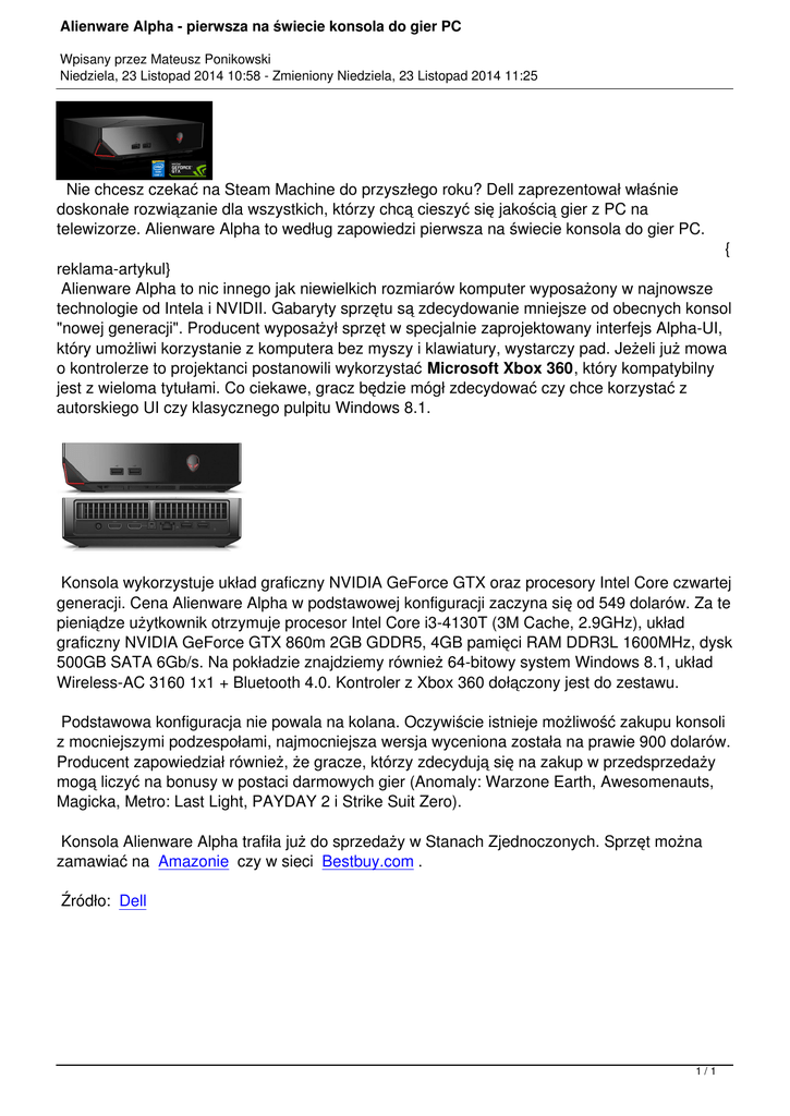 generacji. Cena Alienware Alpha w podstawowej konfiguracji zaczyna się od 549 dolarów. Za te