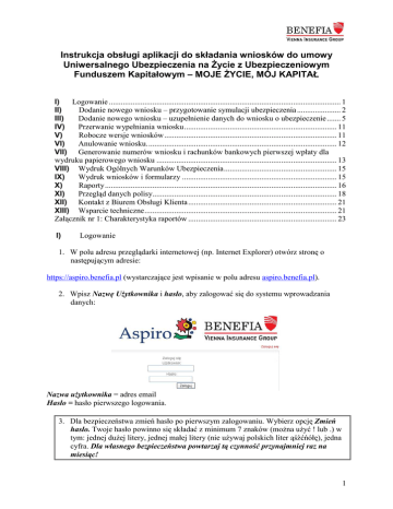 Instrukcja obsługi aplikacji do składania wniosków do umowy Uniwersalnego Ubezpieczenia na Życie z Ubezpieczeniowym Funduszem Kapitałowym – MOJE ŻYCIE, MÓJ KAPITAŁ I) Logowanie ..................................................................................................................... 1 II) Dodanie nowego wniosku – przygotowanie symulacji ubezpieczenia ...................... 2 III) Dodanie nowego wniosku – uzupełnienie danych do wniosku o ubezpieczenie ....... 5 IV) Przerwanie wypełniania wniosku ............................................................................. 11 V) Robocze wersje wniosków ....................................................................................... 11 VI) Anulowanie wniosku. ............................................................................................... 12 VII) Generowanie numerów wniosku i rachunków bankowych pierwszej wpłaty dla wydruku papierowego wniosku ........................................................................................... 13 VIII) Wydruk Ogólnych Warunków Ubezpieczenia ......................................................... 15 IX) Wydruk wniosków i formularzy .............................................................................. 15 X) Raporty ..................................................................................................................... 16 XI) Przegląd danych polisy............................................................................................. 18 XII) Kontakt z Biurem Obsługi Klienta ........................................................................... 21 XIII) Wsparcie techniczne ................................................................................................. 21 Załącznik nr 1: Charakterystyka raportów ........................................................................... 23 I) Logowanie 1. W polu adresu przeglądarki internetowej (np. Internet Explorer) otwórz stronę o następującym adresie: https://aspiro.benefia.pl (wystarczające jest wpisanie w polu adresu aspiro.benefia.pl). 2. Wpisz Nazwę Użytkownika i hasło, aby zalogować się do systemu wprowadzania danych: Nazwa użytkownika = adres email Hasło = hasło pierwszego logowania. 3. Dla bezpieczeństwa zmień hasło po pierwszym zalogowaniu. Wybierz opcję Zmień hasło. Twoje hasło powinno się składać z minimum 7 znaków (można użyć ! lub .) w tym: jednej dużej litery, jednej małej litery (nie używaj polskich liter ąśźćńółę), jedna cyfra. Dla własnego bezpieczeństwa powtarzaj tą czynność przynajmniej raz na miesiąc! 1 II) Dodanie nowego wniosku – przygotowanie symulacji ubezpieczenia 1. Po lewej stronie wybierz opcję Nowy wniosek. 2. Wypełnij wszystkie niezbędne dane do wyliczenia możliwego do wyboru zakresu sumy ubezpieczenia: Placówka Wiek ubezpieczonego (fakultatywnie do wpisania data urodzenia lub wybór wieku) Płeć Częstotliwość opłacania składki Wysokość składki regularnej 3. Naciśnij przycisk: a następnie wpisz wybraną sumę ubezpieczenia w pole Wybrana suma ubezpieczenia. Domyślnie wpisywana jest minimalna dostępna dla wprowadzonych danych suma ubezpieczenia. 4. W sekcji Lista dostępnych umów dodatkowych. zaznacz kliknięciem myszki w pole/a wyboru po lewej stronie, wnioskowane przez Ubezpieczającego umowy dodatkowe. 2 W przypadku wybrania Ubezpieczenia Uzupełniającego na wypadek Śmierci Współmałżonka Ubezpieczonego w Następstwie Nieszczęśliwego Wypadku (ADS3), wpisz jego datę urodzenia. 5. Wybierz Zakładany przyrost wartości funduszu poprzez kliknięcie myszka pola rozwijalnego i wybranie żądanej wartości (pomiędzy 4% a 15%). Wprowadzone powyżej dane umożliwiają sporządzenie symulacji przyrostu wartości funduszu UFK. 6. Aby sporządzić i zobaczyć wykres kliknij myszką na przycisk Symulacja funduszu: 3 7. Aby sporządzić i zobaczyć wykres ilustrujący okres, po jakim czasie możliwe będzie spłacenie kredytu zgromadzoną wartością funduszu UFK polisy, uzupełnij poniższe dane, a następnie kliknij myszką na przycisk Symulacja funduszu i kredytu: 8. Wypełnij wszystkie niezbędne dane do sporządzenia symulacji. Pozostałe do spłaty saldo kredytu (w walucie kredytu, np. CHF, PLN) Waluta kredytu Aktualny kurs waluty w przypadku wybrania PLN, należy wpisać 1 Liczba pozostałych do spłaty rat Aktualne oprocentowanie System płatności tj. rodzaj rat: malejące, stałe 9. Na ekranie zostanie wygenerowany plik w formacie PDF (wymagany program Acrobat Reader), prezentujący podstawowe parametry ubezpieczenia. 4 Symulację można wydrukować lub zapisać na dysku komputera. 10. Aby powrócić do poprzedniego widoku i zmienić parametry do symulacji kliknij myszką przycisk Powrót do edycji, znajdujący się w górnej części okna symulacji: 11. Wykonaj czynności opisane w punktach 2-6 jeśli chcemy sporządzić tylko symulację funduszu lub 2-9 jeśli chcemy wykonać symulację funduszu i kredytu. III) Dodanie nowego wniosku – uzupełnienie danych do wniosku o ubezpieczenie Ubezpieczającym może być osoba fizyczna lub prawna. W tym celu kliknij myszką oznaczone kolorem żółtym pole, aby wybrać odpowiednią opcję. 1. Uzupełnij sekcje: Informacje o Ubezpieczającym, uzupełniając następujące pola: Pola bezwzględnie obowiązkowe w przypadku osoby fizycznej (osoba): - Płeć - Imię - Nazwisko - Data urodzenia - Obywatelstwo - PESEL (wymagany tylko dla obywatelstwa Polskiego i rezydentów posiadających ten numer) - Nazwa dok. tożsamości - Numer dokumentu - Telefon komórkowy lub telefon domowy - Adres e-mail - Nazwa ulicy/placu - Nr domu 5 - Poczta Kod pocztowy Pola bezwzględnie obowiązkowe w przypadku w przypadku osoby prawnej (firma/organizacja): - Pełna nazwa firmy/organizacji - NIP lub REGON - Nazwa ulicy/placu - Nr domu - Poczta - Kod pocztowy 2. Określ sposób opłacania składek przez Ubezpieczającego. W przypadku wybran
