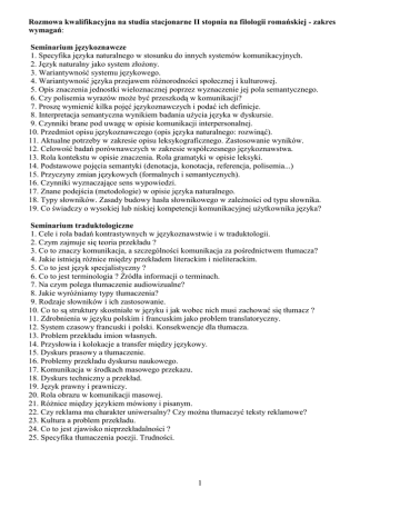 Rozmowa kwalifikacyjna na studia stacjonarne II stopnia na filologii romańskiej - zakres wymagań: Seminarium językoznawcze 1. Specyfika języka naturalnego w stosunku do innych systemów komunikacyjnych. 2. Język naturalny jako system złożony. 3. Wariantywność systemu językowego. 4. Wariantywność języka przejawem różnorodności społecznej i kulturowej. 5. Opis znaczenia jednostki wieloznacznej poprzez wyznaczenie jej pola semantycznego. 6. Czy polisemia wyrazów może być przeszkodą w komunikacji? 7. Proszę wymienić kilka pojęć językoznawczych i podać ich definicje. 8. Interpretacja semantyczna wynikiem badania użycia języka w dyskursie. 9. Czynniki brane pod uwagę w opisie komunikacji interpersonalnej. 10. Przedmiot opisu językoznawczego (opis języka naturalnego: rozwinąć). 11. Aktualne potrzeby w zakresie opisu leksykograficznego. Zastosowanie wyników. 12. Celowość badań porównawczych w zakresie współczesnego językoznawstwa. 13. Rola kontekstu w opisie znaczenia. Rola gramatyki w opisie leksyki. 14. Podstawowe pojęcia semantyki (denotacja, konotacja, referencja, polisemia...) 15. Przyczyny zmian językowych (formalnych i semantycznych). 16. Czynniki wyznaczające sens wypowiedzi. 17. Znane podejścia (metodologie) w opisie języka naturalnego. 18. Typy słowników. Zasady budowy hasła słownikowego w zależności od typu słownika. 19. Co świadczy o wysokiej lub niskiej kompetencji komunikacyjnej użytkownika języka? Seminarium traduktologiczne 1. Cele i rola badań kontrastywnych w językoznawstwie i w traduktologii. 2. Czym zajmuje się teoria przekładu ? 3. Co to znaczy komunikacja, a szczególności komunikacja za pośrednictwem tłumacza? 4. Jakie istnieją różnice między przekładem literackim i nieliterackim. 5. Co to jest język specjalistyczny ? 6. Co to jest terminologia ? Źródła informacji o terminach. 7. Na czym polega tłumaczenie audiowizualne? 8. Jakie wyróżniamy typy tłumaczenia? 9. Rodzaje słowników i ich zastosowanie. 10. Co to są struktury skostniałe w języku i jak wobec nich musi zachować się tłumacz ? 11. Zdrobnienia w języku polskim i francuskim jako problem translatoryczny. 12. System czasowy francuski i polski. Konsekwencje dla tłumacza. 13. Problem przekładu imion własnych. 14. Przysłowia i kolokacje a transfer między językowy. 15. Dyskurs prasowy a tłumaczenie. 16. Problemy przekładu dyskursu naukowego. 17. Komunikacja w środkach masowego przekazu. 18. Dyskurs techniczny a przekład. 19. Język prawny i prawniczy. 20. Rola obrazu w komunikacji masowej. 21. Różnice między językiem mówiony i pisanym. 22. Czy reklama ma charakter uniwersalny? Czy można tłumaczyć teksty reklamowe? 23. Kultura a problem przekładu. 24. Co to jest zjawisko nieprzekładalności ? 25. Specyfika tłumaczenia poezji. Trudności. 1 Seminarium glottodydaktyczne 1. Proszę omówić następujące pojęcia : tekst / dyskurs / wypowiedzenie / mowa / język. Na ile są one przydatne w rozważaniach typu dydaktycznego? 2. Proszę porównać nabywanie języka obcego w warunkach szkolnych i nabywanie języka ojczystego. Jakie wnioski dla dydaktyki obcojęzycznej można wyprowadzić z takiego porównania. 3. Jaką rolę w akwizycji języka ojczystego odgrywa samo dziecko, a jaką jego otoczenie? Jakie wynikają z tego wnioski dla dydaktyki obcojęzycznej? 4. Na ile słuszne jest twierdzenie, ze język jest kodem? Jakie są konsekwencje prezentowanej koncepcji dla dydaktyki języków obcych? 5. Czego trzeba do udanej komunikacji? Jakie czynniki negatywne mogą zakłócić czy też utrudnić prawidłowe rozumienie partnera? 6. Jak działa gramatyka wewnętrzna (implicytna)? Czy jej działanie polega raczej na automatyzmach językowych czy też na kontrolowanych działaniach komunikacyjnych? 7. Na czym polega doniosłość pojęć sytuacja / kontekst w dydaktyce języków obcych. 8. Proszę wyjaśnić pojęcie strategii i kompetencji strategicznej, a także podać przykłady różnego typu strategii. 9. Jakie są główne trudności w przeprowadzaniu ewaluacji kompetencji komunikacyjnej i jak można je ewentualnie niwelować? 10. Proszę wyjaśnić, jak przebiega proces rozmienia wypowiedzi ustnej w zwykłej komunikacji i podać przykłady omawianych cech czy zjawisk. Jakie są różnice z komunikacją obcojęzyczną? Seminarium literaturoznawcze 1. Podstawowe zagadnienia historycznoliterackie, jak: periodyzacja, warunki i instytucje życia literackiego w poszczególnych epokach, wybitni twórcy, prądy estetyczne i ideowe, poetyki, gatunki. 2. Podstawowe zagadnienia teoretycznoliterackie, jak: dzieło literackie i jego wyznaczniki, rodzaje i gatunki literackie, problemy analizy, interpretacji i przekładu dzieła literackiego. 3. Obowiązuje znajomość następujących utworów literackich: - Chanson de Roland - Le Roman de Tristan et Yseut, selon Joseph Bédier 4. Chrétien de Troyes: un roman (extraits) 5. Le Roman de Renard (extraits) 6. Roman de la Rose (extraits) 7. Villon: Le Testament 8. Rabelais: Gargantua et Pantagruel 9. Ronsard: choix de poesies 10. Du Bellay: choix de poesies 11. Montaigne: Les Essais (extraits) 12. Pascal: Les Pensées (extraits) 13. Corneille: Le Cid 14. Moliere: une comédie 15. Racine: une tragédie 16. La Fontaine: choix de Fables 17. Mme de La Fayette: La Princesse de Cleves 18. Prévost: Manon Lescaut 19. Voltaire: Candide 20. Diderot: Jacques le Fataliste 21. Rousseau: Les Confessions (extraits) 22. Laclos: Les liaisons dangereuses 23. Lamartine: choix de poesies 24. Hugo: Notre-Dame de Paris ou: Les Misérables 25. Musset: Nuit de mai ou : une pièce de théâtre 26. Balzac: un roman 2 27. Stendhal: Le Rouge et le Noir 28. Flaubert: Madame Bovary 28. Baudelaire: choix de poèmes 29. Verlaine: choix de poèmes 30. Rimbaud: Bateau ivre 31. Zola: un roman 32. Apollinaire: choix de poèmes 33. Proust: A la Recherche du temps perdu (Ière partie: Du côté de chez Swann) 34. Gide: un roman 