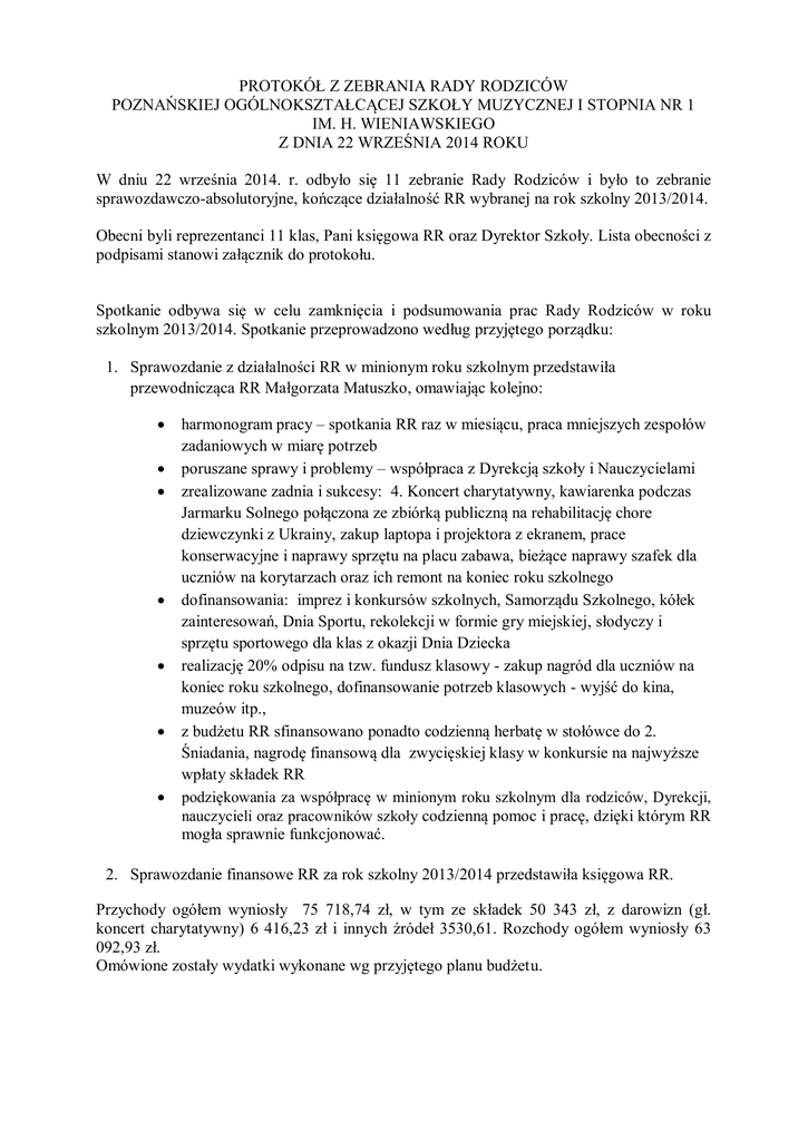 PROTOKÓŁ Z ZEBRANIA RADY RODZICÓW POZNAŃSKIEJ OGÓLNOKSZTAŁCĄCEJ SZKOŁY MUZYCZNEJ I STOPNIA NR 1 IM. H. WIENIAWSKIEGO Z DNIA 22 WRZEŚNIA 2014 ROKU W dniu 22 września 2014. r. odbyło się 11 zebranie Rady Rodziców i było to zebranie sprawozdawczo-absolutoryjne, kończące działalność RR wybranej na rok szkolny 2013/2014. Obecni byli reprezentanci 11 klas, Pani księgowa RR oraz Dyrektor Szkoły. Lista obecności z podpisami stanowi załącznik do protokołu. Spotkanie odbywa się w celu zamknięcia i podsumowania prac Rady Rodziców w roku szkolnym 2013/2014. Spotkanie przeprowadzono według przyjętego porządku: 1. Sprawozdanie z działalności RR w minionym roku szkolnym przedstawiła przewodnicząca RR Małgorzata Matuszko, omawiając kolejno: harmonogram pracy – spotkania RR raz w miesiącu, praca mniejszych zespołów zadaniowych w miarę potrzeb poruszane sprawy i problemy – współpraca z Dyrekcją szkoły i Nauczycielami zrealizowane zadnia i sukcesy: 4. Koncert charytatywny, kawiarenka podczas Jarmarku Solnego połączona ze zbiórką publiczną na rehabilitację chore dziewczynki z Ukrainy, zakup laptopa i projektora z ekranem, prace konserwacyjne i naprawy sprzętu na placu zabawa, bieżące naprawy szafek dla uczniów na korytarzach oraz ich remont na koniec roku szkolnego dofinansowania: imprez i konkursów szkolnych, Samorządu Szkolnego, kółek zainteresowań, Dnia Sportu, rekolekcji w formie gry miejskiej, słodyczy i sprzętu sportowego dla klas z okazji Dnia Dziecka realizację 20% odpisu na tzw. fundusz klasowy - zakup nagród dla uczniów na koniec roku szkolnego, dofinansowanie potrzeb klasowych - wyjść do kina, muzeów itp., z budżetu RR sfinansowano ponadto codzienną herbatę w stołówce do 2. Śniadania, nagrodę finansową dla zwycięskiej klasy w konkursie na najwyższe wpłaty składek RR podziękowania za współpracę w minionym roku szkolnym dla rodziców, Dyrekcji, nauczycieli oraz pracowników szkoły codzienną pomoc i pracę, dzięki którym RR mogła sprawnie funkcjonować. 2. Sprawozdanie finansowe RR za rok szkolny 2013/2014 przedstawiła księgowa RR. Przychody ogółem wyniosły 75 718,74 zł, w tym ze składek 50 343 zł, z darowizn (gł. koncert charytatywny) 6 416,23 zł i innych źródeł 3530,61. Rozchody ogółem wyniosły 63 092,93 zł. Omówione zostały wydatki wykonane wg przyjętego planu budżetu. WYDATKI 2013/2014 w okresie 1.09.2013 do 31.08.2014 1. Pomoc materialna i rzeczowa dla dzieci - dofinansowanie herbaty 2. Dofinansowanie imprez i konkursów ogólnoszkolnych 3. Dofinansowanie imprez i wydatków klasowych w wysokości 20% sumy składek w danej klasie, zakup nagród na koniec roku 4. Dofinansowanie dodatkowych zajęć pozalekcyjnych i kół zainteresowań (samorząd, zuchy, kółko plastyczne) 5. Zakup książek, pomocy dydaktycznych i sprzętu technicznego (m.in. książki, laptop dla kl. 4-6, projektor z ekranem do s. 216) 6. Wydatki administracyjne Rady Rodziców (obsługa księgowa, organizacyjna, int. rejestr wpłat) 7. Ksero i wydruki (zakup papieru) 8. Dofinansowanie wydatków niezbędnych do funkcjonowania szkoły po uprzednim każdorazowym pisemnym wniosku Dyrekcji szkoły (w tym zabudowa szafy do Sali rytmicznej 57b, wakacyjny remont szafek uczniów na korytarzach) 9. Finansowanie własnych projektów Rady Rodziców (zatwierdzonych) - m.in. 4 koncert charytatywny, świetlica, plac zabaw - konserwacja i naprawy, kamizelki odblaskowe na wyjścia klas 1-3 10. Inne drobne wydatki (m.in. opłaty bankowe, środki opatrunkowe, poczta, druki) PLN 3 500,00 7 388,98 16 560,98 2 909,41 5 055,41 7 800,00 2 554,42 5 521,84 8 506,66 inne specjalne, fund. docel. 1 525,23 1 770,00 RAZEM WYDATKI: 63 092,93 Bilans Zamknięcia: 12 625,81 zł W minionym roku z budżetu RR sfinansowano: szereg organizowanych przez szkołę konkursów wewnątrzszkolnych z przedmiotów ogólnokształcących i muzycznych oraz konkursów muzycznych o szerszym zasięgu. m.in. Wielkopolski Konkurs Instrumentów Dętych i Konkurs Wykonawczy, konkurs Lubimy Śpiewać, szkolny konkurs czytania a’vista, Jarmark Solny, rekolekcje wielkopostne, nagrody w konkursach klas I-III i konkursach przedmiotowych, szkolny konkurs na budowę instrumentu perkusyjnego wg własnego pomysłu, nagrody sportowe dla klas w konkursie na fraszkę o dobrym zachowaniu działalność Samorządu szkolnego i wydawanie gazetki szkolnej, kółko plastyczne i zuchy z tzw. funduszu klasowego - zakup nagród dla uczniów na koniec roku szkolnego, wycieczki klasowe, wyjścia do kina, teatru, muzeum itp. nagrodę dla klasy 6a za najwyższą procentowo wpłatę składek na RR zabudowę szafy do Sali rytmicznej 57b zakup koszy do segregacji śmieci zakup kamizelek odblaskowych dla dzieci wychodzących poza teren szkoły gry przygotowujące do zdawania na kartę rowerową, zakup gier planszowych do Sali dyżurów 214 naprawę zjeżdżalni na placu zabaw zakupy do biblioteki szkolnej zakup projektora z ekranem i laptop dla klas 4-6 bieżące naprawy szafek dla uczniów na korytarzach oraz ich remont w czasie wakacji codzienną herbatę dla uczniów, słodycze na Dzień Dziecka, słodycze na DEN i koniec roku W bilansie wykazana została kwota niewykorzystanego funduszu klasowego 2013/2014 – w wysokości 8631,26 zł, z apelem do klas o jego wykorzystywanie w bieżącym roku szkolnym. Przedstawiono wysokość funduszu klasowego w poszczególnych klasach do wykorzystania w nast. roku szkolnym: obecna klasa 2a 2b 3a 3b 4a 4b 5a 5b 6a 6b kwota 944,60 zł 842,00 zł 898,00 zł 358,32 zł 139,87 zł 755,45 zł 1 220,74 zł 1 418,41 zł 620,86 zł 1 433,01 zł 8 631,26 zł Przedstawiony został również bilans dot. Basenu 2013/2014, rozliczający wszystkie wpływy i wydatki związane z uczęszczaniem dzieci na pływalnię. Każdy uczeń został rozliczony indywidualnie, co znajduje odzwierciedlenie w klasowych rejestrach wpłat (przypomnienie: rejestry dostępne w wersji elektronicz