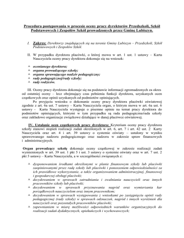 Procedura postępowania w procesie oceny pracy dyrektorów Przedszkoli, Szkół Podstawowych i Zespołów Szkół prowadzonych przez Gminę Lubiszyn. I. Zakres: Dyrektorzy znajdujących się na terenie Gminy Lubiszyn – Przedszkoli, Szkół Podstawowych i Zespołów Szkół. II. W przypadku dyrektora placówki, o której mowa w art. 1 ust. 1 ustawy – Karta Nauczyciela oceny pracy dyrektora dokonuje się na wniosek: ocenianego dyrektora; organu prowadzącego szkołę; organu sprawującego nadzór pedagogiczny; rady pedagogicznej/rady szkoły; rady rodziców. III. Oceny pracy dyrektora dokonuje się na podstawie informacji zgromadzonych za okres od ostatniej oceny – lecz obejmujący czas pełnienia funkcji dyrektora, uzyskanych ocen cząstkowych oraz opinii uzyskanych od podmiotów opiniujących. Po przyjęciu wniosku o dokonanie oceny pracy dyrektora placówki oświatowej zgodnie z art. 6a ust. 7 ustawy – Karta Nauczyciela organ, o którym mowa w art. 6a ust. 6 ustawy - Karta Nauczyciela występuje o pisemne opinie na temat pracy dyrektora do podmiotów opiniujących, którymi w tym przypadku są rada pedagogiczna/rada szkoły oraz zakładowe organizacje związkowe działające w danej placówce oświatowej. IV. Ustalanie ocen cząstkowych pracy dyrektora: Kryterium oceny pracy dyrektora szkoły stanowi stopień realizacji zadań określonych w art. 6, art. 7 i art. 42 ust. 2 Karty Nauczyciela oraz art. 4 i art. 39 ustawy o systemie oświaty – ustalony w wyniku sprawowanego nadzoru pedagogicznego oraz nadzoru w zakresie spraw finansowych ihadministracyjnych. Organ prowadzący szkołę dokonuje oceny cząstkowej w zakresie realizacji zadań wymienionych w art. 39 ust. 1 pkt 5 i ust. 3 ustawy o systemie oświaty oraz w art. 7 ust. 2 pkt 5 ustawy – Karta Nauczyciela, a w szczególności związanych z: dysponowaniem środkami określonymi w planie finansowym szkoły lub placówki zaopiniowanymi przez radę szkoły lub placówki i ponoszeniem odpowiedzialności za ich prawidłowe wykorzystanie, a także organizowaniem administracyjnej, finansowej i gospodarczej obsługi placówki; decydowaniem w sprawach zatrudniania i zwalniania nauczycieli oraz innych pracowników szkoły lub placówki; decydowaniem w sprawach przyznawania nagród oraz wymierzania kar porządkowych nauczycielom oraz innym pracownikom; decydowaniem w sprawach występowania z wnioskami po zasięgnięciu opinii rady pedagogicznej (rady szkoły) w sprawach odznaczeń, nagród i innych wyróżnień dla nauczycieli oraz pozostałych pracowników placówki; zapewnianiem w miarę możliwości odpowiednich warunków organizacyjnych do realizacji zadań dydaktycznych, opiekuńczych i wychowawczych; Organ sprawujący nadzór pedagogiczny nad szkołą dokonuje oceny cząstkowej w zakresie realizacji zadań wymienionych w art. 4 i art. 39 ust. 1 pkt 2 i 7 ustawy o systemie oświaty oraz w art. 7 ust. 2 pkt 1 i art. 42 ust. 2 ustawy – Karta Nauczyciela, a w szczególności związanych z: kierowaniem się w swojej działalności dydaktycznej, wychowawczej i opiekuńczej dobrem uczniów, troską o ich zdrowie, postawę moralną i obywatelską z poszanowaniem godności osobistej ucznia; sprawowanie nadzoru pedagogicznego; współdziałanie ze szkołami wyższymi i zakładami kształcenia nauczycieli w organizacji praktyk pedagogicznych; ponoszenie odpowiedzialności za dydaktyczny i wychowawczy poziom placówki; realizowanie zajęć dydaktycznych, wychowawczych i opiekuńczych bezpośrednio z uczniami i wychowankami; realizowanie innych zajęć i czynności wynikających z zadań statutowych placówki, w tym zajęć opiekuńczych i wychowawczych uwzględniających potrzeby i zainteresowania uczniów; realizowanie zadań i czynności związanych z przygotowaniem się do zajęć, samokształceniem i doskonaleniem zawodowym. Oceny cząstkowej w zakresie realizacji zadań wymienionych w art. 39 ust. 1 pkt 1, 3, 4 i 6 ustawy o systemie oświaty i w art. 6 oraz 7 ust. 2 pkt 2-4 ustawy – Karta Nauczyciela dokonuje organ sprawujący nadzór pedagogiczny nad szkołą w porozumieniu z organem prowadzącym szkołę, a w przypadku gdy organ sprawujący nadzór pedagogiczny jest jednocześnie organem prowadzącym szkołę – oceny tej dokonuje organ sprawujący nadzór pedagogiczny nad szkołą, a w szczególności związanych z: kierowaniem działalnością placówki i reprezentowaniem jej na zewnątrz; sprawowaniem opieki nad uczniami oraz stwarzanie warunków harmonijnego rozwoju psychofizycznego poprzez działania prozdrowotne; realizowaniem uchwał rady pedagogicznej, podjętych w ramach ich kompetencji stanowiących; wykonywaniem innych zadań wynikających z przepisów szczególnych, w tym m. in. dokonywaniem ocen pracy nauczycieli i przestrzeganiem okresów dokonywania tych ocen zgodnie z przepisami, wykonywaniem czynności związanych z awansem zawodowym nauczycieli; rzetelnym realizowaniem zadań związanych z powierzonym mu stanowiskiem oraz podstawowymi funkcjami placówki: dydaktyczną, wychowawczą i opiekuńczą; wspieraniem każdego ucznia i wychowanka w rozwoju; dążeniem do pełni własnego rozwoju osobowego; kształceniem i wychowaniem dzieci i młodzieży w poszanowaniu Konstytucji Rzeczypospolitej Polskiej, szacunku dla każdego człowieka; dbaniem o kształtowanie u uczniów i wychowanków postaw moralnych i obywatelskich zgodnie z ideą demokracji, pokoju i przyjaźni między ludźmi różnych narodów, ras i światopoglądów; ponoszeniem odpowiedzialności za realizację zadań zgodnie z uchwałami rady pedagogicznej, podjętymi w ramach ich kompetencji stanowiących oraz zarządzeniami organów nadzorujących szkołę; tworzeniem warunków do rozwijania samorządnej i samodzielnej pracy uczniów i wychowanków. Wartość oceny cząstkowej dokonywanej w porozumieniu z organem sprawującym nadzór pedagogiczny nad szkołą oraz wartość ostatecznej oceny pracy dyrektora szkoły lub placówki ustala się podczas s
