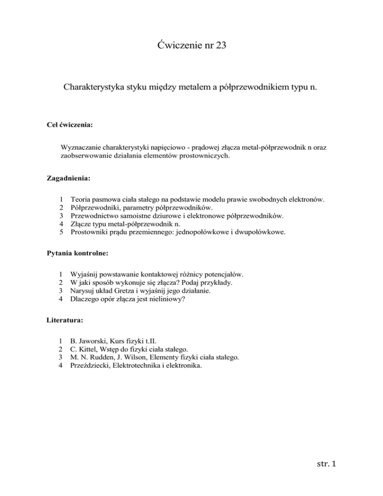 Ćwiczenie nr 23 Charakterystyka styku między metalem a półprzewodnikiem typu n. Cel ćwiczenia: Wyznaczanie charakterystyki napięciowo - prądowej złącza metal-półprzewodnik n oraz zaobserwowanie działania elementów prostowniczych. Zagadnienia: 1 2 3 4 5 Teoria pasmowa ciała stałego na podstawie modelu prawie swobodnych elektronów. Półprzewodniki, parametry półprzewodników. Przewodnictwo samoistne dziurowe i elektronowe półprzewodników. Złącze typu metal-półprzewodnik n. Prostowniki prądu przemiennego: jednopołówkowe i dwupołówkowe. Pytania kontrolne: 1 2 3 4 Wyjaśnij powstawanie kontaktowej różnicy potencjałów. W jaki sposób wykonuje się złącza? Podaj przykłady. Narysuj układ Gretza i wyjaśnij jego działanie. Dlaczego opór złącza jest nieliniowy? Literatura: 1 2 3 4 B. Jaworski, Kurs fizyki t.II. C. Kittel, Wstęp do fizyki ciała stałego. M. N. Rudden, J. Wilson, Elementy fizyki ciała stałego. Przeździecki, Elektrotechnika i elektronika. str. 1 Wprowadzenie. Po zetknięciu metalu z półprzewodnikiem typu n strumień elektronów z półprzewodnika do metalu będzie przeważał nad strumieniem elektronów z metalu do półprzewodnika. Warstwa przystykowa półprzewodnika traci część elektronów i ładuje się dodatnio, natomiast metal uzyskuje nadmiarowy ładunek ujemny. Między metalem i półprzewodnikiem powstaje podwójna warstwa ładunku elektrycznego. Utworzy się kontaktowa różnica potencjału. W warstwie przystykowej półprzewodnika niemal całkowicie brak swobodnych elektronów, w związku z czym opór elektryczny warstwy jest znacznie większy niż pozostałej części półprzewodnika. Warstwę taką nazywamy warstwą zaporową. Przyłożenie zewnętrznego napięcia elektrycznego Uz do złącza wpływa na rozmiary warstwy zaporowej i wysokość bariery potencjału, a więc i opór. Jeśli zewnętrzne pole elektryczne skierowane jest od metalu (+) do półprzewodnika (-), to elektrony z całej objętości półprzewodnika wciągane są do warstwy przystykowej. Powoduje to zmniejszenie grubości warstwy zaporowej, zmniejszenie bariery potencjału i powiększenie przewodności złącza. W tym kierunku, zwanym kierunkiem przewodzenia, może płynąć stosunkowo duży prąd. a) Metal Półprz ewodni k b) Metal Półprz ewodni k c) Półprz ewodni Rys. 1. Rozkład potencjału wzdłuż złącza. k Metal Jeśli zewnętrzne pole ma kierunek przeciwny, metal(-), półprzewodnik(+), następuje dalsze zubożenie warstwy przystykowej w elektrony, wzrasta jej grubość i bariera potencjałów, a zatem opór. Mówimy, że złącze jest spolaryzowane w kierunku zaporowym. str. 2 Zależność prądu od napięcia zewnętrznego dla elementu obwodu zawierającego złącze, przedstawia poniższy rysunek. kierunek przewodzenia kierunek zaporowy Rys. 2. Charakterystyka prądowo-napięciowa złącza prostującego. Duże zmiany oporu w zależności od napięcia, przedstawić można we współrzędnych InR, U. Rys. 3. Zależność oporu złącza prostującego od napięcia. Przebieg ćwiczenia. A. Wyznaczanie charakterystyki napięciowo-prądowej złącza metał-półprzewodnik typu n. Zestawić obwód jak na rys.4. Zasilacz regulowany typNDN Rys. 4. Schemat układu pomiarowego do wyznaczania charakterystyki złącza prostującego. Z - zasiłącz prądu stałego z regulacją co 0,1 V, P -płytka żelazna pokryta selenem (prostownik jednopołówkowy). 2. Ustawiając na zasilaczu napięcia : - w kierunku przewodzenia str. 3 Od 0,3V do 2,1 co 0,3V i od 3V do l0V co 1V - w kierunku zaporowym od 0 do 30 V co 5 V odczytywać natężenie prądu I w obwodzie i napięcie U na styku. 3. Dane zestawić w tabelach: a) dla kierunku przewodzenia Tob. 1. Wynikł pomiarów - kierunek przewodzenia. U ΔU I Δl R ΔR lnR [V] [V] [mA] [mA] [kΩ] [kΩ] dla R w [Ω b) dla kierunku zaporowego Tab. 2. Wyniki pomiarów - kierunek zaporowy. U ΔU I Δl R ΔR lnR [V] [V] [μA] [μA] [MΩ] [MΩ] dla R w [Ω] B. Zastosowanie styku metal-półprzewodnik jako prostownika prądu przemiennego. 1. Z zasilacza prądu przemiennego „Tr” przyłożyć na oscyloskop napięcie ok. 6 V. Zaobserwować obraz prądu zmiennego. 2. Zbudować układ według rys. 5. str. 4 Rys. 5. Schemat połączeń obwodu prostownika jednopołówkowego z oscyloskopem. Tr - zasilacz prądu przemiennego R - opornica suwakowa (20 O - 3A) P - prostownik jednopołówkowy Zdjąć z oscyloskopu zaobserwowane przebiegi. W celu wykorzystania dwu połówek prostowanej sinusoidy stosuje się układ Graetza. Po zbudowaniu poniższego układu zdjąć z oscyloskopu zaobserwowane przebiegi prądu. Rys. 6. Schemat połączeń obwodu prostownika dwupołówkowego z oscyloskopem. 5. W oparciu o powyższe wyjaśnić działanie prostowników. W opracowaniu umieścić zdjęte przebiegi prąciu przemiennego przed i po wyprostowaniu. B. Opracowanie wyników. 1. Na podstawie tabel wykonać wykresy: I = f(U) lnR = f(U) Wyciągnąć wnioski z powyższych wykresów. 2. Obliczyć błąd maksymalny oporności R (tabela 1 i tabela 2) metodą różniczki zupełnej lub pochodnej logarytmicznej dla początkowych i końcowych pomiarów. str. 5