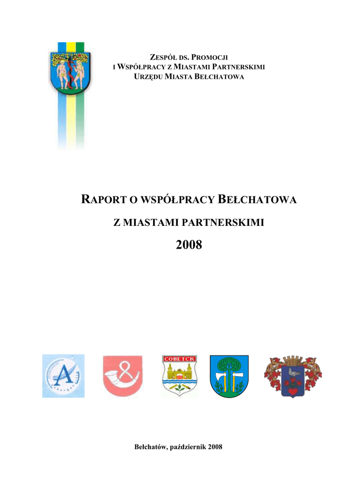 ZESPÓŁ DS. PROMOCJI I WSPÓŁPRACY Z MIASTAMI PARTNERSKIMI URZĘDU MIASTA BEŁCHATOWA RAPORT O WSPÓŁPRACY BEŁCHATOWA Z MIASTAMI PARTNERSKIMI 2008 Bełchatów, październik 2008 PIP.0724-1/08 Miasto Bełchatów podpisało umowy o współpracy partnerskiej z miastami: Aubergenville, Francja (1997r.) Taurogi, Litwa (2001r.) Sowieck, Rosja (2001r.) Myślenice, Polska (2003r.) Csongrád, Węgry (2005r.) W niniejszym raporcie przedstawiamy Państwu bliższe informacje, na temat realizacji współpracy z tymi miastami w 2008 roku. Bełchatów nie ogranicza się jednakże tylko do współpracy z miastami partnerskimi. Warto dodać, iż w kwietniu 2006 roku rozpoczęliśmy współpracę z niemieckim miastem Lindau, a w 2008 roku podjęliśmy działania na gruncie współpracy kulturalnej z Gródkiem – miastem ukraińskim. SPIS TREŚCI: 1. FERIE ZIMOWE MŁODZIEŻY Z CSONGRÁDU ………………………………… 3 2. WYSTAWA „MIĘDZY WSCHODEM A ZACHODEM – RAZEM” ………...…… 4 3. SEMINARIUM W NIEMIECKIM MIEŚCIE LINDAU………..…………………… 4 4. UDZIAŁ W DNIACH AUBERGENVILLE ………………………………………... 6 5. UDZIAŁ W DNIACH TAUROGÓW ……………………………………………….. 9 6. DNI BEŁCHATOWA …………………………………….………………………… 10 7. LETNIA WYPRAWA ROWEROWA ………….………………………………….. 18 8. UDZIAŁ W FESTIWALU CHLEBA I WINA – CSONGRÁD …………………… 19 9. UDZIAŁ W FESTIWALU MIAST PARTNERSKICH – MYŚLENICE …………. 21 2 FERIE ZIMOWE MŁODZIEŻY Z CSONGRÁDU Współpraca pomiędzy nauczycielami z węgierskiego gimnazjum i bełchatowskich szkół – III LO A. Mickiewicza oraz VI LO im. Z. Herberta została nawiązana w 2005 roku i realizowana jest głównie poprzez projekty oparte na wymianie młodzieży. W tym roku, ze strony miasta partnerskiego, udział w wymianie wzięło czternastu uczniów i troje opiekunów – nauczycieli języka angielskiego. Grupa ta, na zaproszenie Prezydenta Miasta Bełchatowa i Prezesa Bełchatowskiego Społecznego Towarzystwa Oświatowego, przebywała w naszym mieście w dniach 3 – 8 lutego bieżącego roku. W programie Węgrów znalazły się lekcje tematyczne i spotkania z rówieśnikami. Zorganizowany został również konkurs wiedzy o krajach niemieckojęzycznych, a także zajęcia sportowe. Przybyli goście zwiedzili nasze miasto i jego okolice, m.in. bełchatowską kopalnię. Młodzież z zagranicy podkreślała, że pobyt w Bełchatowie to dla niej okazja do poznania polskiej kultury i obyczajowości, a także próba przełamywania barier i nauka otwartości. Bełchatowianie z kolei mogli wykazać się gościnnością oraz sprawdzić swą znajomość języka angielskiego w bezpośrednich kontaktach interpersonalnych. www.ebelchatow.pl 3 WYSTAWA „MIĘDZY WSCHODEM A ZACHODEM – RAZEM” Wystawa ta miała miejsce w Muzeum Regionalnym w Bełchatowie i została zorganizowana ze względu na obchodzony w tym roku jubileusz pięciolecia współpracy partnerskiej pomiędzy Myślenicami, a Bełchatowem. Otwarcie wystawy odbyło się 2 marca bieżącego roku, a udział w nim wzięli przedstawiciele Myślenic, członkowie Międzynarodowych Warsztatów Artystycznych z Myślenic, a także artyści z Gródka (ukraińskiego miasta, z którym współpracują Myślenice), których prace zostały wyeksponowane. Wśród dzieł ukraińskich twórców znalazły się prace między innymi Romana Opalińkiego, Bogdana Różaka i Wasyla Łuciwa. Ich zbiór, składający się z rzeźb, malarstwa i kowalstwa artystycznego stanowił fascynującą, sakralną wystawę, pozostawiającą po sobie niezapomniane wrażenie. Na fotografii jedna z prezentowanych na wystawie prac, autorstwa B. Rożaka. SEMINARIUM W NIEMICKIM MIEŚCIE LINDAU W dniach 21 – 25 kwietnia 2008 r. w niemieckim mieście Lindau (Bodensee) odbyło się seminarium dla delegacji z Bełchatowa. Uczestniczyli w nim przedstawiciele Urzędu Miasta Bełchatowa, Rady Miejskiej w Bełchatowie, Miejskiego Centrum Kultury, Miejskiej i Powiatowej Biblioteki Publicznej, Miejskiego Ośrodka Pomocy Społecznej, Regionalnego Stowarzyszenia Społeczno – Kulturalnego, dyrektorzy bełchatowskich szkół, a także klubów żeglarskich działających przy PGE KWB Bełchatów S.A. i PGE Elektrowni Bełchatów S.A. Dwa dni pobytu w Lindau upłynęły na spotkaniach tematycznych. Uczestnicy seminarium zostali podzieleni na trzy grupy. Pierwsza z nich wizytowała spółki miejskie – Zakład Komunikacji Miejskiej, Zakład Uzdatniania Wody i Zakład Zaopatrzenia w Energię, Muzeum Pokoju, biuro regionalne Izby Przemysłowo – Handlowej oraz siedziby klubów żeglarskich miasta Lindau. 4 Druga grupa spotkała się z przedstawicielami Stowarzyszenia „Kulturbrücke” (Mosty Kultury) zajmującego się udzielaniem pomocy uchodźcom oraz prezesem Stowarzyszenia Muzeów będącego organizacją społeczno – kulturalną. Odwiedzili także Muzeum Miasta Lindau, Teatr Miejski, scenę Teatru Marionetek oraz Bibliotekę Miejską. Trzecia z grup, w której skład weszli przedstawiciele oświaty, wizytowała szkoły: gimnazjalną, podstawową, Prywatną Szkołę Państwową i Realną Szkołę Główną. Nawiązane zostały kontakty z dyrektorem Szkoły Muzycznej oraz dyrektorem Volkshochschule – partnerem dla stowarzyszeń, jednostek organizujących kształcenie ustawiczne dla dorosłych. Następnego dnia wszyscy uczestnicy wyjazdu spotkali się z panią nadburmistrz Lindau, z kierownikami administracji samorządowej oraz przedstawicielami stowarzyszeń w Urzędzie Miasta Lindau, a po południu zwiedzili okoliczne miejscowości. Przedstawiciele naszego miasta zauważyli wiele różnic pomiędzy Lindau a Bełchatowem. Na uwagę zasługuje według nich sytuacja gospodarcza i rozwiązania stosowane w spółkach i firmach niemieckiego miasta, które są przemyślane i funkcjonalne, aczkolwiek n