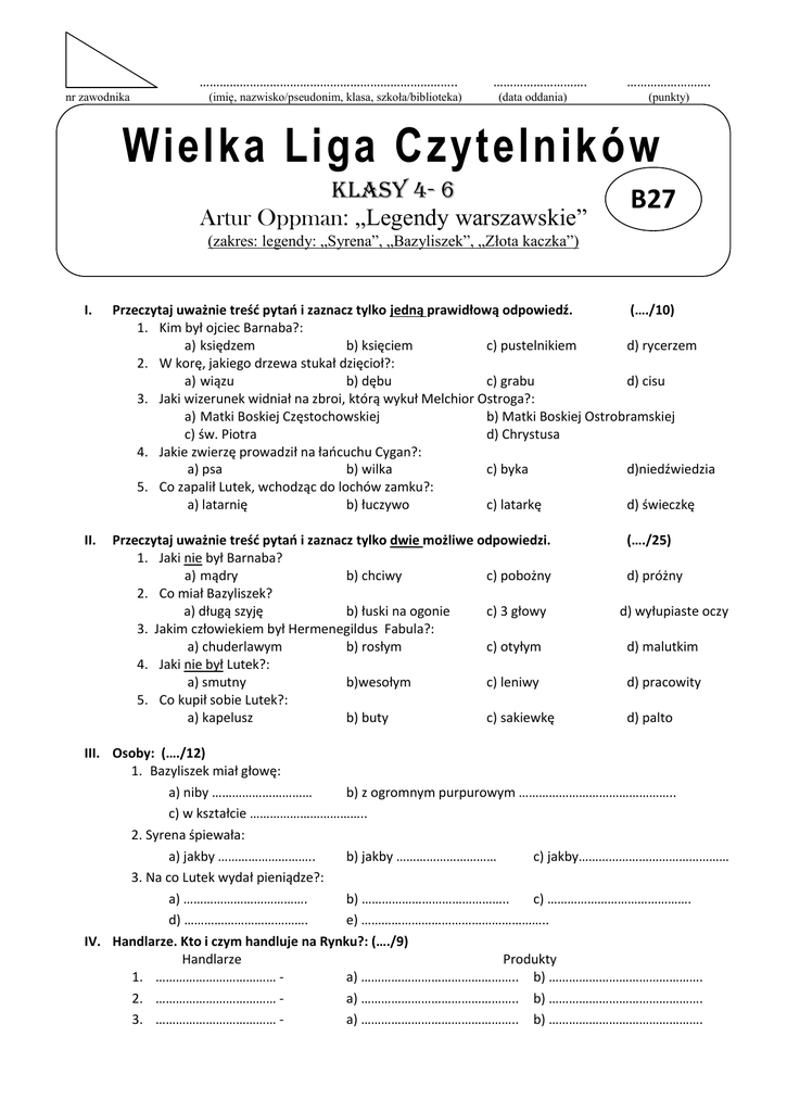 ………………………………………………………………….. nr zawodnika (imię, nazwisko/pseudonim, klasa, szkoła/biblioteka) ………………………. (data oddania) ……………………. (punkty) Wielka Liga Czytelników KLASY 4- 6 Artur Oppman: „Legendy warszawskie” B27 (zakres: legendy: „Syrena”, „Bazyliszek”, „Złota kaczka”) I. Przeczytaj uważnie treść pytań i zaznacz tylko jedną prawidłową odpowiedź. (…./10) 1. Kim był ojciec Barnaba?: a) księdzem b) księciem c) pustelnikiem d) rycerzem 2. W korę, jakiego drzewa stukał dzięcioł?: a) wiązu b) dębu c) grabu d) cisu 3. Jaki wizerunek widniał na zbroi, którą wykuł Melchior Ostroga?: a) Matki Boskiej Częstochowskiej b) Matki Boskiej Ostrobramskiej c) św. Piotra d) Chrystusa 4. Jakie zwierzę prowadził na łańcuchu Cygan?: a) psa b) wilka c) byka d)niedźwiedzia 5. Co zapalił Lutek, wchodząc do lochów zamku?: a) latarnię b) łuczywo c) latarkę d) świeczkę II. Przeczytaj uważnie treść pytań i zaznacz tylko dwie możliwe odpowiedzi. 1. Jaki nie był Barnaba? a) mądry b) chciwy c) pobożny 2. Co miał Bazyliszek? a) długą szyję b) łuski na ogonie c) 3 głowy 3. Jakim człowiekiem był Hermenegildus Fabula?: a) chuderlawym b) rosłym c) otyłym 4. Jaki nie był Lutek?: a) smutny b)wesołym c) leniwy 5. Co kupił sobie Lutek?: a) kapelusz b) buty c) sakiewkę (…./25) d) próżny d) wyłupiaste oczy d) malutkim d) pracowity d) palto III. Osoby: (…./12) 1. Bazyliszek miał głowę: a) niby ………………………… b) z ogromnym purpurowym ……………………………………….. c) w kształcie …………………………….. 2. Syrena śpiewała: a) jakby ……………………….. b) jakby ………………………… c) jakby……………………………………… 3. Na co Lutek wydał pieniądze?: a) ………………………………. b) …………………………………….. c) ……………………………………. d) ………………………………. e) ……………………………………………….. IV. Handlarze. Kto i czym handluje na Rynku?: (…./9) Handlarze Produkty 1. ……………………………… a) ……………………………………….. b) ………………………………………. 2. ……………………………… a) ……………………………………….. b) ………………………………………. 3. ……………………………… a) ……………………………………….. b) ………………………………………. V. Rozwiąż krzyżówkę. Zapisz hasło. (…./14) 1. Pilnował jej Staszek. 2. Jak miał na nazwisko Waluś? 3. Pływała po jeziorze, widział ją Lutek. 4. Dęło w nie dwóch chłopców w kuźni. 5. Inaczej oczy. 6. Spojrzał w nie Bazyliszek. Hasło: 1 2 3 4 5 6 1. 6 2. 2 3. 4. 5 4 5. 3 6. 1 VI. Korzystając ze słowników w wersji papierowej przetłumacz na język angielski oraz napisz tytuł książki, z której korzystałeś (źródło): (…/6) 1. rycerz ………………………………….. 2. złoto…………………………………… Źródło: …………………………………………………………………………………………………….. VII. Korzystając ze słownika języka polskiego w wersji papierowej podaj znaczenie słów oraz napisz tytuł książki, z której korzystałeś (źródło) (…./10) 1. płatnerz……………………………………………………………………………………………………………………………………….. ........................................................................................................................................................ 2. kasztelan…………………………………………………………………………………………………………………………………….. ………………………………………………………………………………………………………………………………………………….. Źródło:…………………………………………………………………………………………………………….. VIII. Rozwiąż zadanie matematyczne: (…./6) Rycerz zamówił u płatnerza zbroję. Oblicz ile za nią zapłacił jeżeli pancerz kosztował 50 dukatów, hełm 30 dukatów, miecz 48 dukatów, jeden naramiennik 34 dukaty i jeden nagolennik 36 dukatów. Zapisz działanie. Udziel odpowiedzi całym zdaniem. Działanie: ……………………………………………………………………………………………………………………………………………….. ………………………………………………………………………………………………………………………………………………………………… Odpowiedź: ……………………………………………………………………………………………………………………………………………. IX. Zadanie historyczne: 1. Kto przeniósł stolicę z Krakowa do Warszawy?............................................................... 2. Jakie miasto było pierwszą stolicą Polski?......................................... 3. Kto ustanowił Order Virtuti Militari? ............................................ X. (…./6) Którego z bohaterów legend warszawskich najbardziej lubisz i dlaczego?. Odpowiedz pełnym zdaniem. (…./2) ………………………………………………………………………………………………………………………………………………………………… ………………………………………………………………………………………………………………………………………………………………… …………………………………………………………………