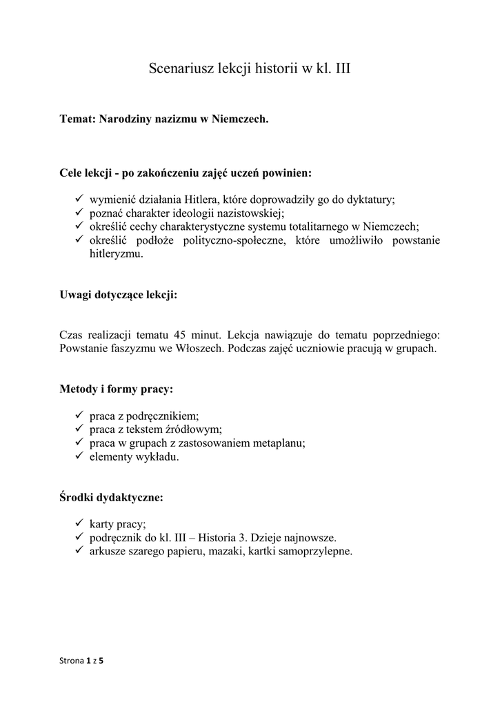 Scenariusz lekcji historii w kl. III Temat: Narodziny nazizmu w Niemczech. Cele lekcji - po zakończeniu zajęć uczeń powinien: wymienić działania Hitlera, które doprowadziły go do dyktatury; poznać charakter ideologii nazistowskiej; określić cechy charakterystyczne systemu totalitarnego w Niemczech; określić podłoże polityczno-społeczne, które umożliwiło powstanie hitleryzmu. Uwagi dotyczące lekcji: Czas realizacji tematu 45 minut. Lekcja nawiązuje do tematu poprzedniego: Powstanie faszyzmu we Włoszech. Podczas zajęć uczniowie pracują w grupach. Metody i formy pracy: praca z podręcznikiem; praca z tekstem źródłowym; praca w grupach z zastosowaniem metaplanu; elementy wykładu. Środki dydaktyczne: karty pracy; podręcznik do kl. III – Historia 3. Dzieje najnowsze. arkusze szarego papieru, mazaki, kartki samoprzylepne. Strona 1 z 5 Przebieg lekcji 1. Wprowadzenie: czynności organizacyjno-porządkowe; podanie i zapisanie tematu; przedstawienie celów lekcji. 2. Rozwinięcie lekcji: omówienie sytuacji Niemiec po założeniu NSDAP; praca w grupach: - grupa I – ma za zadanie odszukać w podręczniku główne cele programu politycznego Adolfa Hitlera - grupa II – pracując z tekstem źródłowym (karta p 1) przygotowuje informacje dotyczące przejęcia władzy przez nazistów; ocena i omówienie pracy uczniów; zapisanie wniosków na tablicy i w zeszytach; przedstawienie uczniom sytuacji państwa niemieckiego po przejęciu władzy przez Hitlera: likwidacja opozycji niemieckiej, odejście od rządów parlamentarnych, początek dyktatury nazistowskiej; praca w grupach z zastosowaniem metaplanu problem: Nazizm w Niemczech (karta 2) - grupa I – Jak było? - grupa II – Jak być powinno? - grupa III – Dlaczego nie jest tak, jak być powinno? liderzy grup przedstawiają wyniki pracy, uczniowie przy współpracy z nauczycielem formują wnioski; ocena pracy uczniów. 3. Zakończenie. Podsumowanie zajęć poprzez notatki. Dokonanie oceny uczniów. sporządzenie wspólnej 4. Zadanie pracy domowej – krzyżówka: Nazizm w Niemczech (karta 3) Strona 2 z 5 Karta 1 Tekst źródłowy z A. Bullok, „Hitler. Studium tyranii” Ta fala rewolucyjnego podniecenia, która przeszła przez Niemcy w 1933 roku, przybrała wiele form. Pierwszą, najbardziej widoczną, był gwałt. Przez wiele miesięcy poprzedzających rok 1933 stał się on rzeczą codzienną w Niemczech, ale orgia przemocy, jaka się rozpętała po pożarze Reichstagu i w końcu roku, przybrała rozmiary w niczym nie przypominające tego, co się działo przedtem. Sam rząd, posługując się takimi instytucjami jak gestapo (pruska tajna policja – dzieło Göringa) i obozami koncentracyjnymi w Oranienburgu, Dachau i innych miejscowościach, celowo stosował gwałt i terror jako metodę rządzenia. Jednocześnie jawne lekceważenie przez władze państwowe porządku i sprawiedliwości wydobywało na wierzch okrucieństwo, zazdrość i mściwość, uczucia normalnie tłumione lub drzemiące w każdym społeczeństwie. Aresztowano, bito i mordowano ludzi tylko dla załatwienia prywatnych porachunków, zagarnięcia czyjejś posady czy mieszkania lub zaspakajania sadystycznych popędów. W Berlinie i innych większych miastach lokalne bandy SA pozakładały sobie „bunkry” w opuszczonych domach towarowych albo w piwnicach, dokąd zaciągały każdego, kogo miały na oku, aby go torturować lub więzić dla okupu. Uchylano normalne sankcje policyjne i sądowe, a zbrodnie pospolite, od rabunku po mord, z całym cynizmem osłaniano płaszczykiem przestępstw „politycznych”. Jedyne, co zrobił rząd, to ogłoszenie amnestii dla „wykroczeń popełnionych w rewolucji narodowej”. Załamanie się prawa i porządku publicznego, zwykłego bezpieczeństwa w życiu codziennym, co wynikało nie ze słabości rządu czy braku autorytetu, ale odbywało się przy aprobacie, głęboko wstrząsnęło stabilnością niemieckiego społeczeństwa, stabilnością zachwianą latami kryzysu i masowego bezrobocia. Ale gwałt, jeżeli odpychał, to jednocześnie pociągał wielu, zwłaszcza ludzi młodej generacji. Była to istotnie charakterystyczna cząstka rewolucyjnego idealizmu, bo rok 1933, tak jak inne lata rewolucyjne rozbudził wielkie nadzieje, otwierał nowe możliwości, kładł kres zniechęceniu i po beznadziejnych latach przyniósł ożywienie, pozwalał czegoś spodziewać. Hitler zdawał sobie sprawę z tych nastrojów, kiedy mówił narodowi niemieckiemu, by uniósł głowę i odzyskał dumę i wiarę w siebie. Niemcy zjednoczone i silne skończą z paraliżującym podziałem wewnętrznym, który hamuje ich rozwój i odzyskają należne im miejsce w świecie. Wielu ludzi uwierzyło temu w 1933 roku i brało za początek nowej ery. Strona 3 z 5 Karta 2 Metaplan – propozycja Problem NAZIZM W NIEMCZECH Jak jest? Jak być powinno? wolność słowa i wyznania prawo do ochrony przed represjami prawo do zrzeszania się władza w rękach różnych partii – system wielopartyjny każdy ma prawo do głoszenia swoich poglądów prawo do wolności cenzura aresztowanie ludzi myślących inaczej niż naziści zakaz zrzeszania się władza w rękach jednej partii – system jednopartyjny represje wobec komunistów, socjaldemokratów więzienia, obozy koncentracyjne represje wobec Żydów prawo do wolności osobistej Dlaczego nie jest tak, jak być powinno? nazizm jako system totalitarny hamował, bądź uniemożliwiał rozwój innych partii podstawowym elementem nazizmu był rasizm – przekonanie o wyższości rasy nordyckiej (germańskiej) Strona 4 z 5 Oczekiwane wnioski: nie pozwalać na rozwój państwa opartego na dyktaturze; nie dopuścić do wprowadzenia systemu jednopartyjnego; nie pozwolić, by władza opierała się na systemie terroru wewnętrznego (państwo policyjne) nie pozwolić totalitarnemu ingerowaniu we wszelkie aspekty życia jednostki oraz życia społecznego, gospodarczego i politycznego. Karta 3 R