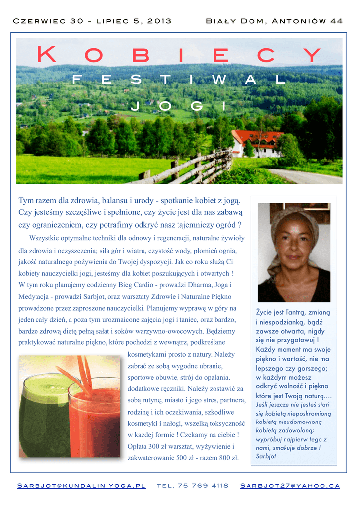 Czerwiec 30 - lipiec 5, 2013 K o f e b Biały Dom, Antoniów 44 i e s t i j o g c w a y l i Tym razem dla zdrowia, balansu i urody - spotkanie kobiet z jogą. Czy jesteśmy szczęśliwe i spełnione, czy życie jest dla nas zabawą czy ograniczeniem, czy potrafimy odkryć nasz tajemniczy ogród ? Wszystkie optymalne techniki dla odnowy i regeneracji, naturalne żywioły dla zdrowia i oczyszczenia; siła gór i wiatru, czystość wody, płomień ognia, jakość naturalnego pożywienia do Twojej dyspozycji. Jak co roku służą Ci kobiety nauczycielki jogi, jesteśmy dla kobiet poszukujących i otwartych ! W tym roku planujemy codzienny Bieg Cardio - prowadzi Dharma, Joga i Medytacja - prowadzi Sarbjot, oraz warsztaty Zdrowie i Naturalne Piękno prowadzone przez zaproszone nauczycielki. Planujemy wyprawę w góry na jeden cały dzień, a poza tym urozmaicone zajęcia jogi i taniec, oraz bardzo, bardzo zdrową dietę pełną sałat i soków warzywno-owocowych. Będziemy praktykować naturalne piękno, które pochodzi z wewnątrz, podkreślane kosmetykami prosto z natury. Należy zabrać ze sobą wygodne ubranie, sportowe obuwie, strój do opalania, dodatkowe ręczniki. Należy zostawić za sobą rutynę, miasto i jego stres, partnera, rodzinę i ich oczekiwania, szkodliwe kosmetyki i nałogi, wszelką toksyczność w każdej formie ! Czekamy na ciebie ! Opłata 300 zł warsztat, wyżywienie i zakwaterowanie 500 zł - razem 800 zł. [email protected] tel. 75 769 4118 Życie jest Tantrą, zmianą i niespodzianką, bądź zawsze otwarta, nigdy się nie przygotowuj ! Każdy moment ma swoje piękno i wartość, nie ma lepszego czy gorszego; w każdym możesz odkryć wolność i piękno które jest Twoją naturą.... Jeśli jeszcze nie jesteś stań się kobietą nieposkromioną kobietą nieudomowioną kobietą zadowoloną; wypróbuj najpierw tego z nami, smakuje dobrze ! Sarbjot [email protected]