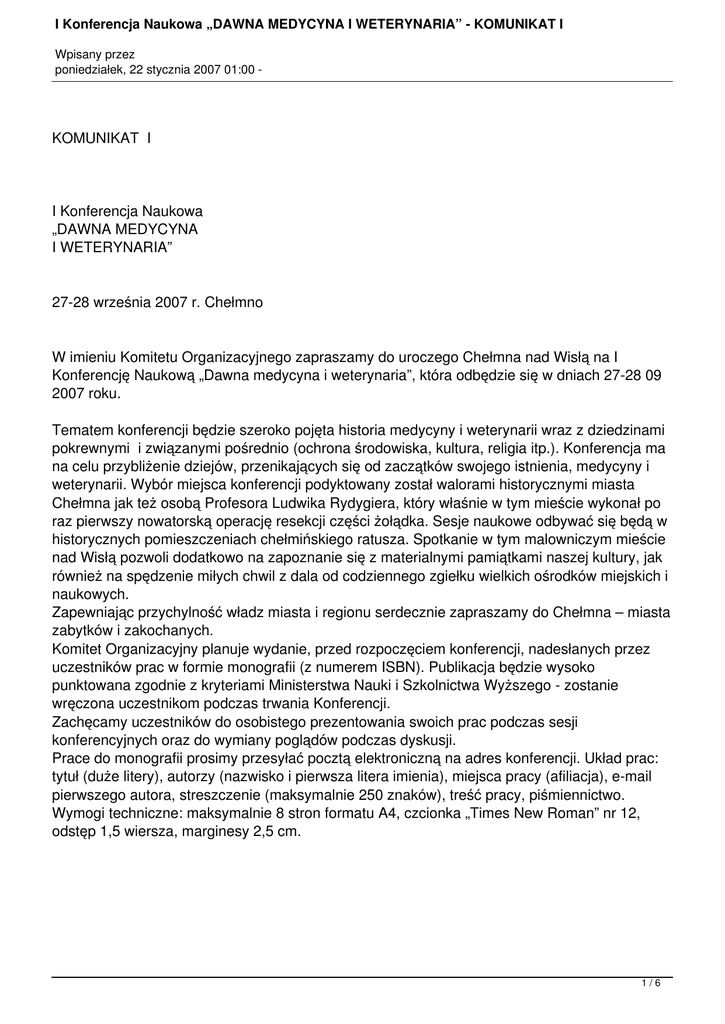 I Konferencja Naukowa „DAWNA MEDYCYNA I WETERYNARIA” - KOMUNIKAT I Wpisany przez poniedziałek, 22 stycznia 2007 01:00 - KOMUNIKAT I I Konferencja Naukowa „DAWNA MEDYCYNA I WETERYNARIA” 27-28 września 2007 r. Chełmno W imieniu Komitetu Organizacyjnego zapraszamy do uroczego Chełmna nad Wisłą na I Konferencję Naukową „Dawna medycyna i weterynaria”, która odbędzie się w dniach 27-28 09 2007 roku. Tematem konferencji będzie szeroko pojęta historia medycyny i weterynarii wraz z dziedzinami pokrewnymi i związanymi pośrednio (ochrona środowiska, kultura, religia itp.). Konferencja ma na celu przybliżenie dziejów, przenikających się od zaczątków swojego istnienia, medycyny i weterynarii. Wybór miejsca konferencji podyktowany został walorami historycznymi miasta Chełmna jak też osobą Profesora Ludwika Rydygiera, który właśnie w tym mieście wykonał po raz pierwszy nowatorską operację resekcji części żołądka. Sesje naukowe odbywać się będą w historycznych pomieszczeniach chełmińskiego ratusza. Spotkanie w tym malowniczym mieście nad Wisłą pozwoli dodatkowo na zapoznanie się z materialnymi pamiątkami naszej kultury, jak również na spędzenie miłych chwil z dala od codziennego zgiełku wielkich ośrodków miejskich i naukowych. Zapewniając przychylność władz miasta i regionu serdecznie zapraszamy do Chełmna – miasta zabytków i zakochanych. Komitet Organizacyjny planuje wydanie, przed rozpoczęciem konferencji, nadesłanych przez uczestników prac w formie monografii (z numerem ISBN). Publikacja będzie wysoko punktowana zgodnie z kryteriami Ministerstwa Nauki i Szkolnictwa Wyższego - zostanie wręczona uczestnikom podczas trwania Konferencji. Zachęcamy uczestników do osobistego prezentowania swoich prac podczas sesji konferencyjnych oraz do wymiany poglądów podczas dyskusji. Prace do monografii prosimy przesyłać pocztą elektroniczną na adres konferencji. Układ prac: tytuł (duże litery), autorzy (nazwisko i pierwsza litera imienia), miejsca pracy (afiliacja), e-mail pierwszego autora, streszczenie (maksymalnie 250 znaków), treść pracy, piśmiennictwo. Wymogi techniczne: maksymalnie 8 stron formatu A4, czcionka „Times New Roman” nr 12, odstęp 1,5 wiersza, marginesy 2,5 cm. 1/6 I Konferencja Naukowa „DAWNA MEDYCYNA I WETERYNARIA” - KOMUNIKAT I Wpisany przez poniedziałek, 22 stycznia 2007 01:00 - Ważne daty i informacje: Do 30 kwietnia 2007 r. - nadesłanie zgłoszeń uczestnictwa w konferencji - dokonanie opłaty za uczestnictwo w konferencji 300 PLN Do 30 maja 2007 r. – nadesłanie prac w pełnej wersji Do 30 czerwca 2007 r. - dokonanie opłaty w terminie ostatecznym 350 PLN Opłata zjazdowa obejmuje koszt uczestnictwa w konferencji, materiały zjazdowe, wyżywienie wraz z uroczystą kolacją, zwiedzanie miasta z profesjonalnym przewodnikiem. Opłata ta zawiera również koszt wydania monografii. Adresy i numery telefonów kontaktowych: Muzeum Ziemi Chełmińskiej, 86-200 Chełmno, Ratusz Sekretarz: mgr Anna Soborska-Zielińska tel. nr – 056 686 16 41 Przewodniczący Komitetu Organizacyjnego: dr Mariusz Z. Felsmann tel. kom. nr – 509 576 175 E-mail - [email protected] Wpłat należy dokonywać na konto: Towarzystwo Przyjaciół Dolnej Wisły w Grucznie Nr konta – 61132011172032272820000005 Koniecznie z dopiskiem „Dawna medycyna i weterynaria” 2/6 I Konferencja Naukowa „DAWNA MEDYCYNA I WETERYNARIA” - KOMUNIKAT I Wpisany przez poniedziałek, 22 stycznia 2007 01:00 - Zakwaterowanie - trzy małe hotele zlokalizowanych niedaleko miejsca obrad. Prosimy o indywidualną rezerwacje miejsc noclegowych. W cenę doby hotelowej wliczone jest śniadanie. Hotel „Karczma Chełmińska” *** najbliżej miejsca obrad - tel. 056 686 4334, 86-200 Chełmno, ul. 22 stycznia 1b, www.karczmachelminska.pl Pokoje 1, 2 i 4 osobowe. Aktualna cena pokoju 2 osobowego – 190 PLN Hotel „Centralny” ** odległy od miejsca obrad ok. 1 km – tel. 056 686 0212 86-200 Chełmno, Dworcowa 23, www.hotelcentralny.pl Pokoje 1, 2 i 4 osobowe. Aktualna cena pokoju 2 osobowego – 120 PLN Hotelik „Diada” odległy od miejsca obrad ok. 0,5 km – tel. 056 676 20 30 86-200 Chełmno, ul. Podmurna 3, www.hotelik.info Pokoje 1 i 2 osobowe. Aktualna cena pokoju 2 osobowego – 120 PLN Rezerwacji prosimy dokonywać podając informację o naszej Konferencji „Dawna Medycyna i Weterynaria” I Konferencja Naukowa „DAWNA MEDYCYNA I WETERYNARIA” 27-28 września 2007 r. Chełmno Komitet Honorowy Przewodniczący Prorektor d/s Collegium Medicum Uniwersytetu im. Mikołaja Kopernika w Toruniu Dr hab. Małgorzata Tafil-Klawe prof. UMK Starosta Powiatu Chełmińskiego Zdzisław Gamański Burmistrz Miasta Chełmna Mariusz Kędzierski Komitet Naukowy Przewodniczący Prof. dr hab. Józef Szarek, prof. zw. - UWM w Olsztynie Kierownik Zespołu Weterynarii Sądowej i Administracji Weterynaryjnej Prof. dr hab. Bożena Urbanek - ŚAM w Katowicach Kierownik Katedry i Zakładu Historii Medycyny i Farmacji Prof. dr hab. Wojciech Cybulski - Zarząd Główny PTNW Kierownik Sekcji Historii Medycyny Weterynaryjnej Prof. dr hab. med. Roman Meissner - AM w Poznaniu Kierownik Zakładu Historii Nauk Medycznych Prof. dr hab. Włodzimierz Kluciński – SGGW w Warszawie Dziekan Wydziału Medycyny Weterynaryjnej Komitet Organizacyjny Przewodniczący Dr n. wet. Mariusz Z. Felsmann - UMK w Toruniu Collegium Medicum w Bydgoszczy Z-ca Przewodniczącego 3/6 I Konferencja Naukowa „DAWNA MEDYCYNA I WETERYNARIA” - KOMUNIKAT I Wpisany przez poniedziałek, 22 stycznia 2007 01:00 - Dr n. hum. Walentyna K. Korpalska - UMK w Toruniu Collegium Medicum w Bydgoszczy Członkowie Mgr Ewa Gerka - Muzeum Ziemi Chełmińskiej w Chełmnie Dr n. med. Mirosława Felsmann - UMK w Toruniu Collegium Medicum w Bydgoszczy Dr n. wet. Małgorzata Sobczak-Filipiak - SGGW w Warszawie Wydz. Medycyny Weterynaryjnej Sekretarz Mgr Anna Soborska-Zielińska - Muzeum Ziemi Chełmińskiej w Ch