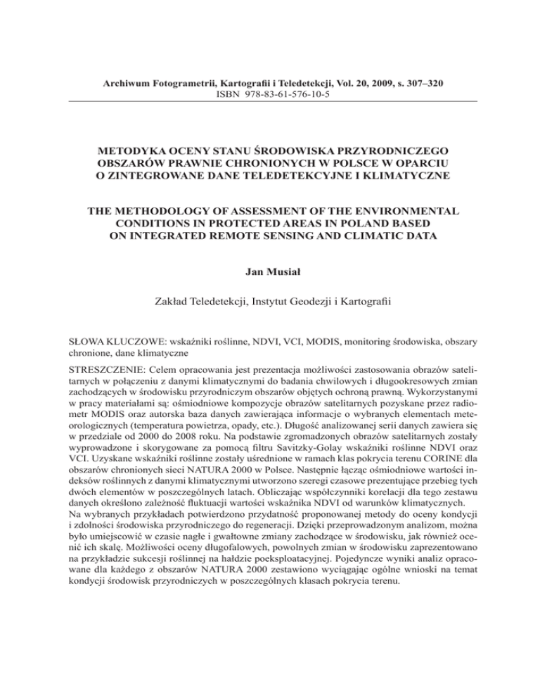 Archiwum Fotogrametrii, Kartografii i Teledetekcji, Vol. 20, 2009, s. 307–320 ISBN 978-83-61-576-10-5 METODYKA OCENY STANU ŚRODOWISKA PRZYRODNICZEGO OBSZARÓW PRAWNIE CHRONIONYCH W POLSCE W OPARCIU O ZINTEGROWANE DANE TELEDETEKCYJNE I KLIMATYCZNE THE METHODOLOGY OF ASSESSMENT OF THE ENVIRONMENTAL CONDITIONS IN PROTECTED AREAS IN POLAND BASED ON INTEGRATED REMOTE SENSING AND CLIMATIC DATA Jan Musiał Zakład Teledetekcji, Instytut Geodezji i Kartografii SŁOWA KLUCZOWE: wskaźniki roślinne, NDVI, VCI, MODIS, monitoring środowiska, obszary chronione, dane klimatyczne STRESZCZENIE: Celem opracowania jest prezentacja możliwości zastosowania obrazów satelitarnych w połączeniu z danymi klimatycznymi do badania chwilowych i długookresowych zmian zachodzących w środowisku przyrodniczym obszarów objętych ochroną prawną. Wykorzystanymi w pracy materiałami są: ośmiodniowe kompozycje obrazów satelitarnych pozyskane przez radiometr MODIS oraz autorska baza danych zawierająca informacje o wybranych elementach meteorologicznych (temperatura powietrza, opady, etc.). Długość analizowanej serii danych zawiera się w przedziale od 2000 do 2008 roku. Na podstawie zgromadzonych obrazów satelitarnych zostały wyprowadzone i skorygowane za pomocą filtru Savitzky-Golay wskaźniki roślinne NDVI oraz VCI. Uzyskane wskaźniki roślinne zostały uśrednione w ramach klas pokrycia terenu CORINE dla obszarów chronionych sieci NATURA 2000 w Polsce. Następnie łącząc ośmiodniowe wartości indeksów roślinnych z danymi klimatycznymi utworzono szeregi czasowe prezentujące przebieg tych dwóch elementów w poszczególnych latach. Obliczając współczynniki korelacji dla tego zestawu danych określono zależność fluktuacji wartości wskaźnika NDVI od warunków klimatycznych. Na wybranych przykładach potwierdzono przydatność proponowanej metody do oceny kondycji i zdolności środowiska przyrodniczego do regeneracji. Dzięki przeprowadzonym analizom, można było umiejscowić w czasie nagłe i gwałtowne zmiany zachodzące w środowisku, jak również ocenić ich skalę. Możliwości oceny długofalowych, powolnych zmian w środowisku zaprezentowano na przykładzie sukcesji roślinnej na hałdzie poeksploatacyjnej. Pojedyncze wyniki analiz opracowane dla każdego z obszarów NATURA 2000 zestawiono wyciągając ogólne wnioski na temat kondycji środowisk przyrodniczych w poszczególnych klasach pokrycia terenu. Jan Musiał 1. WSTĘP 1.1. Monitoring i ocena środowiska przyrodniczego Ocena stanu środowiska przyrodniczego w Polsce w świetle zachodzących w nim zmian wywołanych działalnością człowieka (zmianami pokrycia terenu, zanieczyszczeniem środowiska), zmianami klimatu, zagrożeniami naturalnymi (pożarami, porywistymi wiatrami, szkodnikami) stała się kluczową kwestią w ostatnich latach. Liczne konwencje: Berneńska (o ochronie gatunków dzikiej fauny i flory europejskiej oraz siedlisk przyrodniczych), Ramsarska (o obszarach błotno-wodnych), Konwencja o Ochronie Różnorodności Biologicznej oraz zobowiązania wprowadzone przez Unię Europejską (liczne dyrektywy: Ptasia, Siedliskowa) nakładają na Polskę obowiązek monitorowania i oceniania stanu środowiska przyrodniczego. Dzięki rzetelnej ocenie można lepiej zarządzać środowiskiem w ramach zasad zrównoważonego rozwoju oraz monitorować i prognozować zmiany zachodzące w przyrodzie. W Polsce systemem pomiarów, ocen i prognoz stanu środowiska oraz gromadzenia, przetwarzania i rozpowszechniania informacji o środowisku zajmuje się Państwowy Monitoring Środowiska. Gromadzenie danych w ramach monitorowania środowiska przyrodniczego jest procesem pracochłonnym, wymagającym zaangażowania dużej liczby specjalistów i znacznych środków finansowych. Według projektu Ministerstwa Ochrony Środowiska z roku 2006: „Prowadzenie monitoringu na obszarach NATURA 2000 będzie kosztowało około 20 000 zł rocznie dla jednego obszaru, czyli w sumie 1 520 000 zł.” Oprócz obszarów sieci NATURA 2000 istnieje wiele innych cennych przyrodniczo powierzchni i siedlisk objętych różnymi formami ochrony prawnej. Prowadzenie częstego, systematycznego monitoringu i oceny stanu środowiska przyrodniczego wszystkich obszarów wartościowych przyrodniczo za pomocą badań terenowych jest niemożliwe z powodów finansowych. Fakt ten stwarza możliwość dla zastosowania technik teledetekcyjnych, a w szczególności satelitarnych, dzięki którym proces gromadzenia danych jest o wiele mniej kosztowny, obejmuje swym zasięgiem znaczne obszary i pozwala na pozyskiwanie danych o dużej rozdzielczości czasowej. Jednakże oprócz niewątpliwych zalet dane teledetekcyjne posiadają również ograniczenia związane z samym sposobem pozyskiwania danych. Skanowanie powierzchni Ziemi ze znacznych wysokości wiąże się z potrzebą wyeliminowania wpływu atmosfery na wiązkę promieniowania elektromagnetycznego (np. rozpraszania i pochłaniania promieniowania). Również same zjawiska zachodzące w atmosferze takie jak: rozwój zachmurzenia, zamglenia, jej zapylenie wymagają odpowiedniej korekcji obrazu satelitarnego. Wszystkie te czynniki wpływają na rzetelność uzyskanych wyników i poprawność wyciągniętych wniosków, dlatego ważną kwestią podczas pracy z danymi satelitarnymi jest ich początkowa ocena pod kątem występujących na nich zakłóceń. 1.2. Zastosowanie wskaźników roślinnych do oceny stanu środowiska przyrodniczego Proces monitoringu środowiska przyrodniczego prowadzony na podstawie danych satelitarnych bazuje głównie na wykorzystaniu wskaźników roślinnych. Indeksy wege308 Metodyka oceny stanu środowiska przyrodniczego obszarów prawnie chronionych... tacyjne (spektralne) służą do ilościowej i jakościowej oceny stanu roślinności, a także do korekty obrazów pod względem radiometrycznym, ze względu na wpływ rzeźby terenu, atmosfery lub różnego oświetlenia (Adamczyk, Będkows