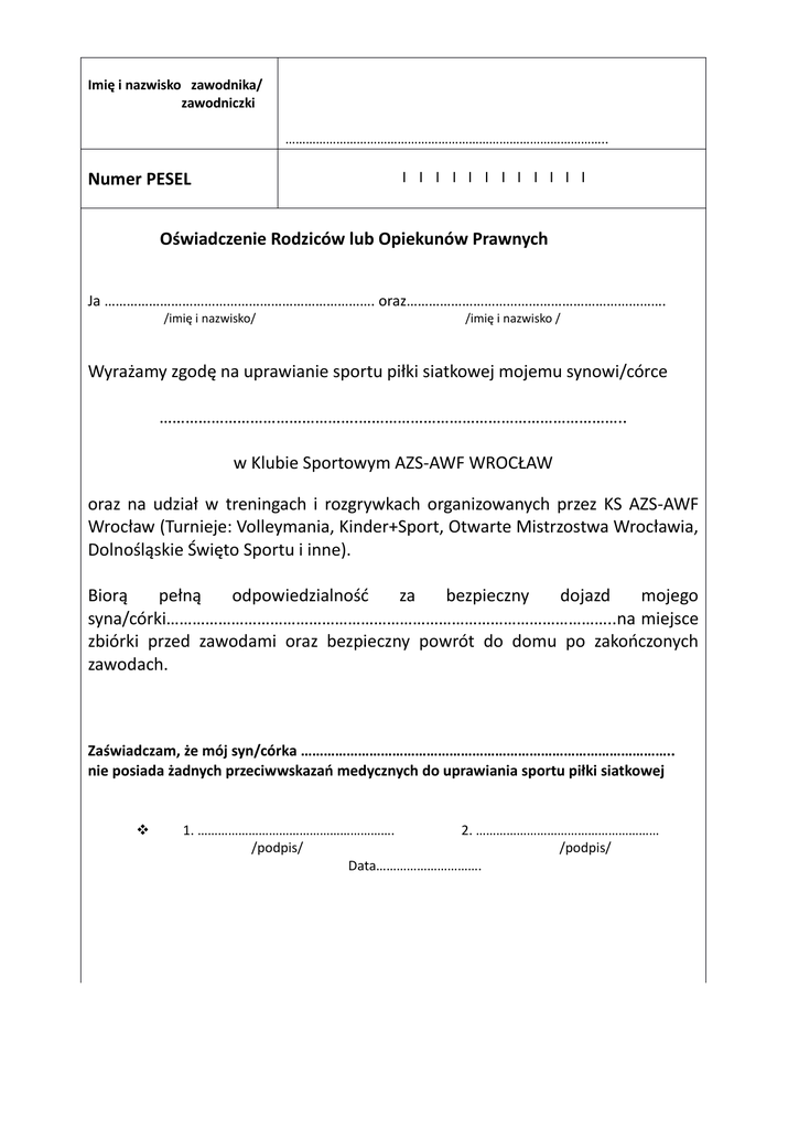 Imię i nazwisko zawodnika/ zawodniczki ………………………………………………………………………………….. I I I I I I I I I I I I Numer PESEL Oświadczenie Rodziców lub Opiekunów Prawnych Ja ………………………………………………………………. oraz……………………………………………………………. /imię i nazwisko/ /imię i nazwisko / Wyrażamy zgodę na uprawianie sportu piłki siatkowej mojemu synowi/córce ……………………………………….…………………………………………………….. w Klubie Sportowym AZS-AWF WROCŁAW oraz na udział w treningach i rozgrywkach organizowanych przez KS AZS-AWF Wrocław (Turnieje: Volleymania, Kinder+Sport, Otwarte Mistrzostwa Wrocławia, Dolnośląskie Święto Sportu i inne). Biorą pełną odpowiedzialność za bezpieczny dojazd mojego syna/córki…………………………………………………………………………………………..na miejsce zbiórki przed zawodami oraz bezpieczny powrót do domu po zakończonych zawodach. Zaświadczam, że mój syn/córka …………………………………………………………………………………….. nie posiada żadnych przeciwwskazań medycznych do uprawiania sportu piłki siatkowej 1. …………………………………………………. 2. ……………………………………………… /podpis/ /podpis/ Data………………………….