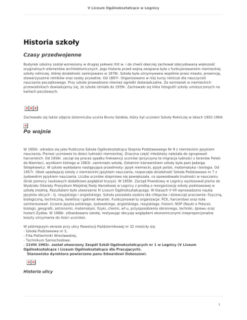 V Liceum Ogólnokształcące w Legnicy Historia szkoły Czasy przedwojenne Budynek szkolny został wzniesiony w drugiej połowie XIX w. i do chwili obecnej zachował zdecydowaną większość oryginalnych elementów architektonicznych. Jego historia przed wojną związana była z funkcjonowaniem niemieckiej szkoły rolniczej, której działalność zainicjowano w 1878r. Szkoła była utrzymywana wspólnie przez miasto, prowincję, stowarzyszenie rolników oraz osoby prywatne. Od 1897r. Organizowano w niej kursy rolnicze dla nauczycieli nauczania początkowego. Przy szkole prowadzono również ogródki doświadczalne. Ze wzmianek w niemieckich przewodnikach dowiadujemy się, że szkoła istniała do 1939r. Zachowało się kilka fotografii szkoły umieszczonych na kartach pocztowych. Zachowało się także zdjęcie dzienniczka ucznia Bruno Seidela, który był uczniem Szkoły Rolniczej w latach 1902-1904: Po wojnie W 1950r. odradza się jako Publiczna Szkoła Ogólnokształcąca Stopnia Podstawowego Nr 9 z niemieckim językiem nauczania. Pierwsi uczniowie to dzieci ludności niemieckiej. Znaczna część młodzieży należała do zgrupowań harcerskich. Od 1956r. zaczął się proces spadku frekwencji uczniów (przyczyna to migracja ludności z terenów Polski do Niemiec), wynikiem którego w 1963r. zamknięto szkołę. Ostatnim kierownikiem szkoły była pani Jadwiga Sklepkiewicz. W szkole wykładano następujące przedmioty: język niemiecki, język polski, matematyka i biologia. Od 1957r. Obok upadającej szkoły z niemieckim językiem nauczania, rozpoczęła działalność Szkoła Podstawowa nr 7 z żydowskim językiem nauczania. Liczba uczniów stopniowo się powiększała, co spowodowało trudności w nauczaniu (brak pomocy naukowych dodatkowo pogłębiał kryzys). W 1959r. Zarząd Powiatowy w Legnicy wystosował pismo do Wydziału Oświaty Prezydium Miejskiej Rady Narodowej w Legnicy z prośbą o reorganizację szkoły podstawowej w szkołę średnią. Rezultatem było utworzenie III Liceum Ogólnokształcącego. W klasach V-VII wprowadzono naukę języków obcych - tj. rosyjskiego i angielskiego. Szkoła posiadała osobno dla chłopców i dziewcząt pracownie: fizyczną, biologiczną, techniczną, świetlicę i gabinet lekarski. Funkcjonował tu organizacje: PCK, harcerstwo oraz koła zainteresowań. Uczono języka polskiego, żydowskiego, angielskiego, rosyjskiego, historii, NOP (Nauki o Polsce), biologii, geografii, astronomii, matematyki, fizyki, chemii, wf-u, przysposobienia obronnego, techniki, śpiewu oraz historii Żydów. W 1968r. zlikwidowano szkołę, motywując decyzję względami ekonomicznymi (nieproporcjonalne koszty utrzymania do ilości uczniów). W późniejszym okresie przy ulicy Rewolucji Październikowej nr 32 mieściły się: - Szkoła Podstawowa nr 5, - Filia Politechniki Wrocławskiej, - Technikum Samochodowe. - 21VIII 1992r. został utworzony Zespół Szkół Ogólnokształcących nr 1 w Legnicy (V Liceum Ogólnokształcące i Liceum Ogólnokształcące dla Pracujących). Stanowisko dyrektora powierzono panu Edwardowi Doboszowi. Historia ulicy 1 V Liceum Ogólnokształcące w Legnicy 18 maja 1649 r. książę Ludwik IV (1616 -1663) poślubił Annę Zofię - księżniczkę meklemburską . Stryj księcia Ludwika – książę legnicki Jerzy Rudolf (1602-1653) ofiarował Annie Zofii w prezencie ślubnym podlegnicki folwark mleczny, który został nazwany Sophienthal. Tam księżna założyła kosztowny ogród ozdobny (Lustgarten) oraz aleję do jazdy konnej (Rennbahn). Ok. 1657 r. książę Ludwik postawił żonie w jej ogrodach pawilon (Lusthaus), na którego ścianach książęcy goście pisali rymowane sentencje. Był to swoisty sztambuch księżnej. Po śmierci księżnej Anny Zofii ogród został odkupiony przez Wilhelma Kittlera i stopniowo ulegał upadkowi. W 1869 r. obszar Sophienthal włączono do miasta. W 1870 r. powstał plan zabudowy tej dzielnicy z przeznaczeniem na postawienie tam zakładów przemysłowych. W 1873 r. oddano do użytku drugą na Dolnym Śląsku szkołę rolniczą (dziś: V LO). Do roku 1877 na odcinku od ul. Piastowskiej do ul. Jagiellońskiej obok budynków mieszkalnych postawiono: ● tartak parowy Mllera, ● rozbudowano fabrykę pianin Seilera (1849), ● powstała fabryka maszyn Teicherta, późniejsza Gubischa (1900). W ciągu siedmiu lat Seiler zabudował dalszą część ulicy pomiędzy ul. Jagiellońską a ul. Książęcą. ● ● ● ● 16.01.1946 r. w ramach repolonizacji nazw ulica otrzymała nazwę: Senatorska. 01.1952 r. zmieniono nazwę na Rewolucji Październikowej. 5.07.1991 r. powrócono do pierwotnej powojennej nazwy. Ulica Senatorska ma długość 887 m. 2