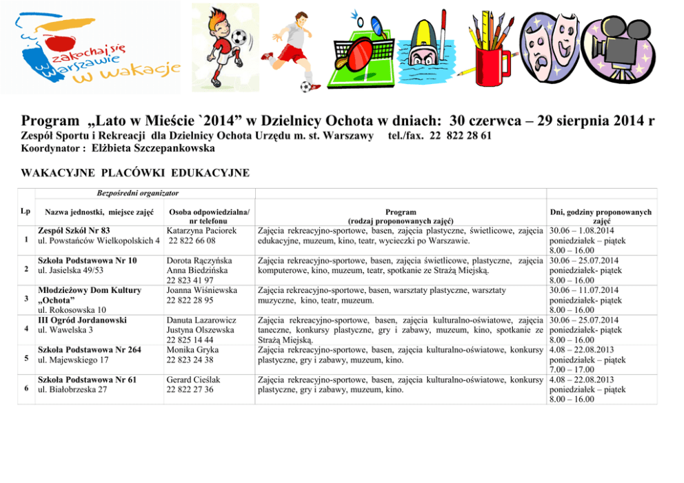 Program „Lato w Mieście `2014” w Dzielnicy Ochota w dniach: 30 czerwca – 29 sierpnia 2014 r Zespół Sportu i Rekreacji dla Dzielnicy Ochota Urzędu m. st. Warszawy Koordynator : Elżbieta Szczepankowska tel./fax. 22 822 28 61 WAKACYJNE PLACÓWKI EDUKACYJNE Bezpośredni organizator Lp Nazwa jednostki, miejsce zajęć Osoba odpowiedzialna/ nr telefonu 1 Zespół Szkół Nr 83 Katarzyna Paciorek ul. Powstańców Wielkopolskich 4 22 822 66 08 2 Szkoła Podstawowa Nr 10 ul. Jasielska 49/53 Dorota Rączyńska Anna Biedzińska 22 823 41 97 Joanna Wiśniewska 22 822 28 95 4 Młodzieżowy Dom Kultury „Ochota” ul. Rokosowska 10 III Ogród Jordanowski ul. Wawelska 3 5 Szkoła Podstawowa Nr 264 ul. Majewskiego 17 Danuta Lazarowicz Justyna Olszewska 22 825 14 44 Monika Gryka 22 823 24 38 6 Szkoła Podstawowa Nr 61 ul. Białobrzeska 27 Gerard Cieślak 22 822 27 36 3 Program (rodzaj proponowanych zajęć) Dni, godziny proponowanych zajęć Zajęcia rekreacyjno-sportowe, basen, zajęcia plastyczne, świetlicowe, zajęcia 30.06 – 1.08.2014 edukacyjne, muzeum, kino, teatr, wycieczki po Warszawie. poniedziałek – piątek 8.00 – 16.00 Zajęcia rekreacyjno-sportowe, basen, zajęcia świetlicowe, plastyczne, zajęcia 30.06 – 25.07.2014 komputerowe, kino, muzeum, teatr, spotkanie ze Strażą Miejską. poniedziałek- piątek 8.00 – 16.00 Zajęcia rekreacyjno-sportowe, basen, warsztaty plastyczne, warsztaty 30.06 – 11.07.2014 muzyczne, kino, teatr, muzeum. poniedziałek- piątek 8.00 – 16.00 Zajęcia rekreacyjno-sportowe, basen, zajęcia kulturalno-oświatowe, zajęcia 30.06 – 25.07.2014 taneczne, konkursy plastyczne, gry i zabawy, muzeum, kino, spotkanie ze poniedziałek- piątek Strażą Miejską. 8.00 – 16.00 Zajęcia rekreacyjno-sportowe, basen, zajęcia kulturalno-oświatowe, konkursy 4.08 – 22.08.2013 plastyczne, gry i zabawy, muzeum, kino. poniedziałek – piątek 7.00 – 17.00 Zajęcia rekreacyjno-sportowe, basen, zajęcia kulturalno-oświatowe, konkursy 4.08 – 22.08.2013 plastyczne, gry i zabawy, muzeum, kino. poniedziałek – piątek 8.00 – 16.00 WAKACYJNE PLACÓWKI SPECJALISTCZNE Bezpośredni organizator Lp Nazwa jednostki - adres 1 2 3 4 Osoba odpowiedzialna nr telefonu Program (rodzaj proponowanych zajęć) Ośrodek Sportu i Rekreacji m.st. Warszawy w Dzielnicy Ochota Otwarte kąpielisko Park Szczęśliwicki ul. Usypiskowa 18 Ośrodek Sportu i Rekreacji m.st. Warszawy w Dzielnicy Ochota ul. Rokosowska 10 Pływalnia kryta – mały aqua park Cezary Domińczak 600 727 357 Pływanie rekreacyjne, gry i zabawy w wodzie. Grupy zorganizowane punkty dziennego pobytu, obowiązuje wcześniejsza rezerwacja (wejście jednorazowe - 60 min.). Katarzyna Czerwonko 22 572 90 88 Pływanie rekreacyjne, gry i zabawy w wodzie. Wejścia indywidualne dla dzieci i młodzieży za okazaniem legitymacji, grupy zorganizowane punkty dziennego pobytu, po uprzednim zgłoszeniu, obowiązuje wcześniejsza rezerwacja (wejście jednorazowe – 60 min.). Międzyszkolny Ośrodek Sportowy Nr 7 ul. Geodetów 1 Pływalnia kryta Całoroczny Stok Narciarski Szczęśliwice ul. Drawska 22 Piotr Łukawski 22 822 66 07 Pływanie rekreacyjne na basenie dla dzieci ze stałych punktów i wejścia indywidualne (po uprzednim zgłoszeniu i uzgodnieniu terminu). Grzegorz Kwiatkowski Zjeżdżalnia grawitacyjna. 22 622 69 61 Dni, godziny proponowanych zajęć 30.06 - 29.08.2014 poniedziałek – piątek 9.00– 17.00 Wejścia: 9.00–11.00 11.00–13.00, 14.00- 17.00 30.06 – 8.08.2014 poniedziałek – piątek grupy 9.00–10.00, 10.00-11.00, 11.00-12.00 w. indywidualne 8.00- 9.00, 12.00-13.00 30.06 - 14.08.2014 poniedziałek – piątek 9.30-14.00 30.06-29.08.2014 poniedziałek-piątek 10.00-13.00 IMPREZY Bezpośredni organizator Lp 1 2 3 4 Nazwa jednostki - adres Nazwa imprezy Osoba odpowiedzialna/ nr telefonu Ośrodek Kultury Ochoty ul. Grójecka 75 Ewa Maślanka 22 822 48 70 „Lato z Fantastyką” impreza ogólnodostępna Wydział Kultury dla Dzielnicy Ochota Urzędu m.st. Warszawy, Stowarzyszenie Scena 96 22 668 67 08 Ochockie Lato Teatralne 510 053 140 Bajkowa Ochota – spektakle plenerowe Wydział Kultury dla Dzielnicy Ochota Urzędu m.st. Warszawy, Stowarzyszenie Teatr Baza Międzyszkolny Ośrodek Sportowy Nr 7 ul. Geodetów 1 Piotr Łukawski 22 822 66 07 Zawody sportowo-rekreacyjne na basenie dla grup zorganizowanych. Data godzina 9.07.2014 10.00 – 12.30 Park Szczęśliwicki 10, 17, 24, 31.07.2014 11.00 Park Zasława Malickiego lub Sala Widowiskowa DK „Rakowiec” ul. Wiślicka 8 20, 27.07.2014, 23.08.2014 12.00 Park Szczęśliwicki 07.08.2014 10.30 MOS Nr 7 ul. Geodetów 1 DOŻYWIANIE – Wydział Oświaty i Wychowania dla Dzielnicy Ochota Urzędu m. st. Warszawy ul. Radomska 13/21 tel. 22 822 19 08, 22 823 20 30 Nazwa i adres punktu Lp 1 2 3 4 Zespół Szkół Nr 83 ul. Powstańców Wielkopolskich 4 Szkoła Podstawowa Nr 10 ul. Jasielska 49/53 Szkoła Podstawowa Nr 175 ul. Spiska 1 Szkoła Podstawowa Nr 97 ul. Trzech Budrysów 32 Osoba odpowiedzialna/ nr telefon Bożena Kowalczyk 22 822 66 08 Agata Łopuszańska Magdalena Kosieradzka 22 823 41 97 Henryka Dąbrowska 22 822 20 05 Ewa Jagiełło 22 822 09 20 Rodzaj wydawanych posiłków Dni, godziny wydawanych posiłków Obiad - dla grup zorganizowanych z punktów programu „Lato w mieście” 30.06-18.07.2014 po uprzednim zgłoszeniu w danym dniu do godziny 10.00 Obiad - dla grup zorganizowanych z punktów programu „Lato w mieście” 21.07-1.08.2014 po uprzednim zgłoszeniu w danym dniu do godziny 10.00 Obiad - dla grup zorganizowanych z punktów programu „Lato w mieście” 4.08-14.08.2014 po uprzednim zgłoszeniu w danym dniu do godziny 10.00 Obiad - dla grup zorganizowanych z punktów programu „Lato w mieście” 18.08-22.08.2014 po uprzednim zgłoszeniu w danym dniu do godziny 10.00 Z A P R A S Z A M Y !!!!!!!!