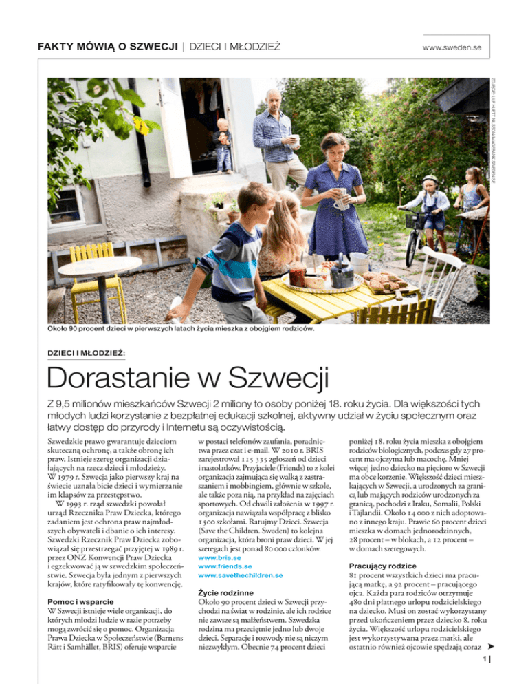 Fakty mówią o Szwecji | Dzieci i młodzież www.sweden.se Zdjęcie: Ulf Huett Nilsson/imagebank.sweden.se Około 90 procent dzieci w pierwszych latach życia mieszka z obojgiem rodziców. Dzieci i młodzież: Dorastanie w Szwecji Z 9,5 milionów mieszkańców Szwecji 2 miliony to osoby poniżej 18. roku życia. Dla większości tych młodych ludzi korzystanie z bezpłatnej edukacji szkolnej, aktywny udział w życiu społecznym oraz łatwy dostęp do przyrody i Internetu są oczywistością. Szwedzkie prawo gwarantuje dzieciom skuteczną ochronę, a także obronę ich praw. Istnieje szereg organizacji działających na rzecz dzieci i młodzieży. W 1979 r. Szwecja jako pierwszy kraj na świecie uznała bicie dzieci i wymierzanie im klapsów za przestępstwo. W 1993 r. rząd szwedzki powołał urząd Rzecznika Praw Dziecka, którego zadaniem jest ochrona praw najmłodszych obywateli i dbanie o ich interesy. Szwedzki Rzecznik Praw Dziecka zobowiązał się przestrzegać przyjętej w 1989 r. przez ONZ Konwencji Praw Dziecka i egzekwować ją w szwedzkim społeczeństwie. Szwecja była jednym z pierwszych krajów, które ratyfikowały tę konwencję. Pomoc i wsparcie W Szwecji istnieje wiele organizacji, do których młodzi ludzie w razie potrzeby mogą zwrócić się o pomoc. Organizacja Prawa Dziecka w Społeczeństwie (Barnens Rätt i Samhället, BRIS) oferuje wsparcie w postaci telefonów zaufania, poradnictwa przez czat i e-mail. W 2010 r. BRIS zarejestrował 115 335 zgłoszeń od dzieci i nastolatków. Przyjaciele (Friends) to z kolei organizacja zajmująca się walką z zastraszaniem i mobbingiem, głównie w szkole, ale także poza nią, na przykład na zajęciach sportowych. Od chwili założenia w 1997 r. organizacja nawiązała współpracę z blisko 1500 szkołami. Ratujmy Dzieci. Szwecja (Save the Children. Sweden) to kolejna organizacja, która broni praw dzieci. W jej szeregach jest ponad 80 000 członków. www.bris.se www.friends.se www.savethechildren.se Życie rodzinne Około 90 procent dzieci w Szwecji przychodzi na świat w rodzinie, ale ich rodzice nie zawsze są małżeństwem. Szwedzka rodzina ma przeciętnie jedno lub dwoje dzieci. Separacje i rozwody nie są niczym niezwykłym. Obecnie 74 procent dzieci poniżej 18. roku życia mieszka z obojgiem rodziców biologicznych, podczas gdy 27 procent ma ojczyma lub macochę. Mniej więcej jedno dziecko na pięcioro w Szwecji ma obce korzenie. Większość dzieci mieszkających w Szwecji, a urodzonych za granicą lub mających rodziców urodzonych za granicą, pochodzi z Iraku, Somalii, Polski i Tajlandii. Około 14 000 z nich adoptowano z innego kraju. Prawie 60 procent dzieci mieszka w domach jednorodzinnych, 28 procent – w blokach, a 12 procent – w domach szeregowych. Pracujący rodzice 81 procent wszystkich dzieci ma pracującą matkę, a 92 procent – pracującego ojca. Każda para rodziców otrzymuje 480 dni płatnego urlopu rodzicielskiego na dziecko. Musi on zostać wykorzystany przed ukończeniem przez dziecko 8. roku życia. Większość urlopu rodzicielskiego jest wykorzystywana przez matki, ale ostatnio również ojcowie spędzają coraz 1 | Fakty mówią o Szwecji | Dzieci i młodzież www.sweden.se Zdjęcie: Bildarkivet. Rok szkolny Jesień W połowie sierpnia zaczyna się rok szkolny i wszystkie dzieci rozpoczynają naukę w kolejnej klasie. Ponad połowę powierzchni Szwecji pokrywają lasy, dlatego o tej porze roku popularne jest zbieranie grzybów i borówek. Na przełomie października i listopada dzieci mają tydzień ferii jesiennych. 31 października od niedawna obchodzony jest Hallo ween, z okazji którego wszyscy przebierają się w zabawne stroje i robią lampiony z wydrążonych dyni. Następnego dnia, w dniu Wszystkich Świętych, wiele osób zapala świeczki na rodzinnych grobach i w parkach pamięci. W Szwecji wiele dzieci dociera do szkoły pieszo lub na rowerze. Zdjęcie: Ulf Huett Nilsson/Joh św. Łucja 13 grudnia Szwedzi obchodzą dzień świętej Łucji. W każdej szkole i przedszkolu organizowana jest specjalna uroczystość związana z tym świętem: wybrana do roli świętej Łucji dziewczynka, ubrana na biało i w koronie ze świecami, prowadzi orszak dziewcząt, które śpiewają okolicznościowe pieśni. Boże Narodzenie Półrocze kończy się tuż przed Bożym Narodzeniem (24 grudnia), a szkoły pozostają zamknięte do początku stycznia. sporty zimowe Drugie półrocze rozpoczyna się wraz z początkiem drugiego tygodnia stycznia. Pod koniec lutego lub na początku marca dzieci mają ferie przeznaczone na uprawianie sportów zimowych. Wiele rodzin wyjeżdża wtedy w góry na północy kraju, by uprawiać narciarstwo biegowe, zjazdowe i jazdę na snowboardzie. Ponieważ w zimie zamarza wiele jezior, popularnym zajęciem jest też jazda na łyżwach. Rok szkolny więcej czasu w domu ze swoim potomstwem. Mężczyźni wykorzystują obecnie około 24 procent urlopu rodzicielskiego. Dziewięć lat obowiązkowej edukacji Zgodnie z postanowieniami szwedzkiej ustawy edukacyjnej wszystkie dzieci oraz nastolatki muszą mieć równy dostęp do edukacji, bez względu na płeć, miejsce zamieszkania czy czynniki społeczno-ekonomiczne. W Szwecji edukacja jest bezpłatna, z wyjątkiem przedszkoli i szkolnictwa wyższego (które częściowo jest finansowane przez rząd). Obowiązek szkolny obejmuje wszystkie dzieci aż do ukończenia dziewiątej klasy. Następnie można kontynuować naukę w szkole średniej (dotyczy to także uczniów z niepełnosprawnością intelektualną). Oprócz szkół podstawowych i średnich istnieje możliwość uczęszczania do przedszkoli, gminnych szkół dla dorosłych i szkół dla osób z niepełnosprawnością intelektualną. Obecnie niemal wszystkie dzieci w wieku sześciu lat chodzą do przedszkola. W praktyce oznacza to, że każde dziecko przez co najmniej 10 lat jest objęte systemem edukacji. Rok szkolny jest podzielony na dwa semestry. Pierwszy zacz
