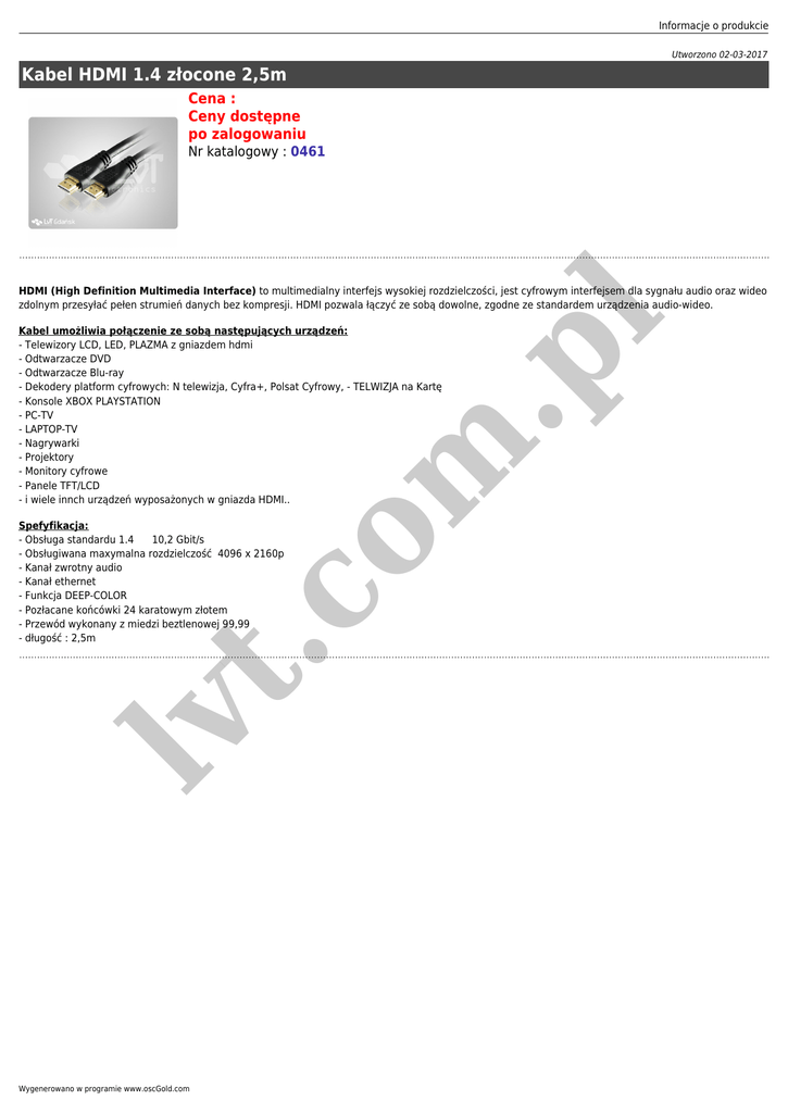 Informacje o produkcie Utworzono 02-03-2017 Kabel HDMI 1.4 złocone 2,5m Cena : Ceny dostępne po zalogowaniu Nr katalogowy : 0461 lv t. co Spefyfikacja: - Obsługa standardu 1.4 10,2 Gbit/s - Obsługiwana maxymalna rozdzielczość 4096 x 2160p - Kanał zwrotny audio - Kanał ethernet - Funkcja DEEP-COLOR - Pozłacane końcówki 24 karatowym złotem - Przewód wykonany z miedzi beztlenowej 99,99 - długość : 2,5m m .p Kabel umożliwia połączenie ze sobą następujących urządzeń: - Telewizory LCD, LED, PLAZMA z gniazdem hdmi - Odtwarzacze DVD - Odtwarzacze Blu-ray - Dekodery platform cyfrowych: N telewizja, Cyfra+, Polsat Cyfrowy, - TELWIZJA na Kartę - Konsole XBOX PLAYSTATION - PC-TV - LAPTOP-TV - Nagrywarki - Projektory - Monitory cyfrowe - Panele TFT/LCD - i wiele innch urządzeń wyposażonych w gniazda HDMI.. Wygenerowano w programie www.oscGold.com l HDMI (High Definition Multimedia Interface) to multimedialny interfejs wysokiej rozdzielczości, jest cyfrowym interfejsem dla sygnału audio oraz wideo zdolnym przesyłać pełen strumień danych bez kompresji. HDMI pozwala łączyć ze sobą dowolne, zgodne ze standardem urządzenia audio-wideo.