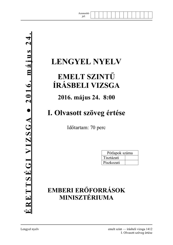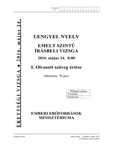 ÉRETTSÉGI VIZSGA ● 2016. május 24. Azonosító jel: Lengyel nyelv LENGYEL NYELV EMELT SZINTŰ ÍRÁSBELI VIZSGA 2016. május 24. 8:00 I. Olvasott szöveg értése Időtartam: 70 perc Pótlapok száma Tisztázati Piszkozati EMBERI ERŐFORRÁSOK MINISZTÉRIUMA emelt szint — írásbeli vizsga 1412 I. Olvasott szöveg értése Lengyel nyelv — emelt szint Azonosító jel: Fontos tudnivalók Ebben a vizsgarészben szótár nem használható! Mielőtt a feladatokat megoldaná, figyelmesen olvassa el az utasításokat! Jó munkát! írásbeli vizsga, I. vizsgarész 1412 2 / 12 2016. május 24. Azonosító jel: Lengyel nyelv — emelt szint I. Przeczytaj uważnie tekst, a następnie określ na jego podstawie wartość podanych w tabeli zdań (P - prawda, F - fałsz). Wpisz właściwą literę w trzecią kolumnę tabeli. Przykład oznaczony jest symbolem (0). Nie wolno nic wpisywać w szare pola. To, że Polki są przedsiębiorcze, potwierdzają przeprowadzane na całym świecie analizy. Wynika z nich, że jesteśmy krajem, w którym płeć piękna dość odważnie sięga po własny biznes. Znaczącą motywacją do zakładania firm jest dla kobiet konieczność tworzenia sobie miejsc pracy, których rynek nie jest w stanie zapewnić. Panie czynią się właścicielkami przedsiębiorstw również dlatego, że chcą realizować własne pomysły i marzenia oraz wykorzystywać w praktyce wiedzę i umiejętności, których nie mogą spożytkować pracując na etacie. Gdyby tych przykładów było mało, warto wspomnieć, że większość kobiet staje oko w oko z przedsiębiorczością nie tylko poprzez założenie własnej firmy. Konieczność godzenia życia zawodowego z prywatnym to nie lada wyzwanie, które wymaga od kobiet dużej determinacji, dobrej organizacji i odwagi – jednych z kluczowych cech przedsiębiorczości. Jakie są pozostałe? Mówiąc „przedsiębiorczość” myślimy o połączeniu wiedzy, kreatywności i umiejętności dostrzeżenia tego, co inni uświadamiają sobie dopiero po czasie. Przedsiębiorczość to wiara we własne siły, orientacja na zadania, zdolność do podejmowania ryzyka. To otwartość umysłu, dążenie do bycia dobrze poinformowanym i sztuka przewidywania, planowania przyszłości. Niektórzy uważają, że tylko pewna grupa społeczeństwa posiada cechy i predyspozycje do bycia przedsiębiorczymi. I by grupa ta mogła działać w taki sposób, odkrywać okazje i zakładać firmy, muszą zaistnieć odpowiednie warunki instytucjonalne, polityczne i kulturowe. O ile w przypadku tych ostatnich skutkiem są „tylko” utarte stereotypy kobiet stojących przy garnkach, o tyle nieodpowiedni klimat biurokratyczny i nieprzemyślane propozycje rządzących mogą nieść za sobą o wiele poważniejsze konsekwencje. Dlatego wszelkie przedsiębiorcze kroki powinna poprzedzać dokładna analiza rynku, zestawienie ze sobą szans i zagrożeń, mocnych i słabych stron. Kobiety wydają się mieć w tym zakresie ukrytego w rękawie asa w postaci swojej intuicji. To ona pozwala im na rozważniejsze podejmowanie decyzji. http://zwierciadlo.pl/2013/praca-i-finanse/praca-praca-i-finanse/przedsiebiorczosc-jest-kobieta z dnia 06.01.2014 r. 0. 1. 2. 3. 4. 5. Badania i analizy przeprowadzane na całym świecie potwierdzają, że Polki są przedsiębiorcze. Polki zakładają własne firmy i w ten sposób tworzą sobie miejsca pracy. By pogodzić życie zawodowe z prywatnym, kobieta musi wykazać się dużą determinacją i znajomością przepisów prawa pracy. Przedsiębiorczość to między innymi: wiara we własne siły, orientacja na zadania, zdolność do podejmowania ryzyka, wydawanie pieniędzy lub zużywanie jakiegoś dobra ponad miarę i bez potrzeby. Powszechnie uważa się, że całe polskie społeczeństwo posiada cechy i predyspozycje do bycia przedsiębiorczymi. Wszelkie przedsiębiorcze działania powinna poprzedzać dokładna analiza rynku, zestawienie ze sobą szans i zagrożeń, mocnych i słabych stron. 1. írásbeli vizsga, I. vizsgarész 1412 2. 3. 4. 5. 3 / 12 P Max. Elért 5 2016. május 24. Azonosító jel: Lengyel nyelv — emelt szint II. Poniższe fragmenty tekstu zostały pomieszane. Ustal poprawną kolejność i odpowiedzi wpisz w ramkę. Przykład oznaczony jest symbolem (0). Nie wolno nic wpisywać w szare pola. A B C D E F G H I K L M N O literą imienia przyszłego męża. Na koniec wyszły na dwór i ze słomianego dachu kurnika wyciągnęły po garści słomek. Potem wróciły do chaty i liczyły, czy mają parzystą czy później do wioski przybył młody stolarz, który postanowił się tu osiedlić. Był wysoki i miał włosy czarne jak noc. Janka od razu się w nim ale nadal w nocy z 29 na 30 listopada panny gromadzą się razem, a wróżby mają im ujawnić wyczekiwanego wybranka serca. Noc tę natomiast z biegiem czasu nazwano Andrzejkami i tak pozostało do dziś. nieparzystą liczbę słomek, gdyż parzysta oznaczała zamążpójście, a nieparzysta staropanieństwo. Ku ogólnej radości, według tej wróżby, wszystkie panny miały wyjść za świętego Andrzeja, który jest patronem dziewic. Następnie panny zgromadziły się w jednej z chat, gdzie zaczęły tradycyjne wróżby, odprawiane niegdyś przez ich mąż. Uszczęśliwiona Janka wracała do domu zastanawiając się, co jej się dziś przyśni i czy rzeczywiście wróżby się spełnią. Przed snem włożyła pod Dawno, dawno temu w niewielkiej wiosce na brzegu Wisły mieszkała sobie młoda dziewczyna, która miała na imię Janka. Była piękną panną i wielu chłopców pragnęło zwrócić na siebie jej wioski. Pozostałe panny, patrząc na Jankę, myślały o kolejnej niezwykłej, listopadowej nocy, mając nadzieję, że tym razem to właśnie im wróżby ukażą przyszłego męża. Od tamtych wydarzeń minęło wiele lat. Świat się zmienił, zakochała. Zresztą z wzajemnością, bo tuż po żniwach odbyło się wielkie wesele, na którym zgromadzili się wszyscy