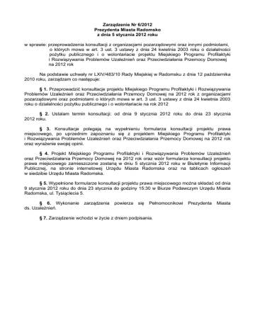 Zarządzenie Nr 6/2012 Prezydenta Miasta Radomsko z dnia 5 stycznia 2012 roku w sprawie: przeprowadzenia konsultacji z organizacjami pozarządowymi oraz innymi podmiotami, o których mowa w art. 3 ust. 3 ustawy z dnia 24 kwietnia 2003 roku o działalności pożytku publicznego i o wolontariacie projektu Miejskiego Programu Profilaktyki i Rozwiązywania Problemów Uzależnień oraz Przeciwdziałania Przemocy Domowej na 2012 rok Na podstawie uchwały nr LXIV/483/10 Rady Miejskiej w Radomsku z dnia 12 października 2010 roku, zarządzam co następuje: § 1. Przeprowadzić konsultacje projektu Miejskiego Programu Profilaktyki i Rozwiązywania Problemów Uzależnień oraz Przeciwdziałania Przemocy Domowej na 2012 rok z organizacjami pozarządowymi oraz podmiotami o których mowa w art. 3 ust. 3 ustawy z dnia 24 kwietnia 2003 roku o działalności pożytku publicznego i o wolontariacie na rok 2012 § 2. Ustalam termin konsultacji: od dnia 9 stycznia 2012 roku do dnia 23 stycznia 2012 roku. § 3. Konsultacje polegają na wypełnieniu formularza konsultacji projektu prawa miejscowego, po uprzednim zapoznaniu się z projektem Miejskiego Programu Profilaktyki i Rozwiązywania Problemów Uzależnień oraz Przeciwdziałania Przemocy Domowej na 2012 rok oraz wyrażenie swojej opinii. § 4. Projekt Miejskiego Programu Profilaktyki i Rozwiązywania Problemów Uzależnień oraz Przeciwdziałania Przemocy Domowej na 2012 rok oraz wzór formularza konsultacji projektu prawa miejscowego zamieszczone zostaną w dniu 5 stycznia 2012 roku w Biuletynie Informacji Publicznej, na stronie internetowej Urzędu Miasta Radomska oraz na tablicach ogłoszeń w siedzibie Urzędu Miasta Radomska. § 5. Wypełnione formularze konsultacji projektu prawa miejscowego można składać od dnia 9 stycznia 2012 roku do dnia 23 stycznia do godziny 15:30 w Biurze Podawczym Urzędu Miasta Radomska, ul. Tysiąclecia 5. § 6. Wykonanie ds. Uzależnień. zarządzenia powierza się Pełnomocnikowi § 7. Zarządzenie wchodzi w życie z dniem podpisania. Prezydenta Miasta Projekt z dnia 5 stycznia 2012 r. Zatwierdzony przez ......................... UCHWAŁA NR .................... RADY MIEJSKIEJ W RADOMSKU z dnia .................... 2012 r. w sprawie Miejskiego Programu Profilaktyki i Rozwiązywania Problemów Uzależnień oraz Przeciwdziałania Przemocy Domowej na 2012 rok. Na podstawie art. 18 ust. 2 pkt. 15 ustawy z dnia 8 marca 1990 r. ustawy o samorządzie gminnym (tj. Dz. U. z 2001 r. Nr 142 poz. 1591; z 2002 r. Nr 23 poz. 220, Nr 62 poz. 558, Nr 113 poz. 984, Nr 153 poz. 1271, Nr 214poz. 1806; z 2003 r. Nr 80 poz. 717, Nr 162 poz. 1568, z 2004 r. Nr 102 poz. 1055, Nr 116 poz. 1203; z 2005 r. Nr 172 poz. 1441, Nr 175 poz. 1457, z 2006 r. Nr 17 poz. 128, Nr 181 poz. 1337, z 2007 r. Nr 138 poz. 976, Nr 173 poz. 1218; z 2008 r. Nr 180 poz. 1111, Nr 223 poz. 1458; z 2009 r. 52 poz. 420, Nr 157, poz. 1241; z 2010 r. Nr 28, poz. 142 oraz poz. 146, Nr 40 poz. 230, Nr 106 poz. 230, z 2011 r. Nr 21 poz. 113, Nr 117 poz. 679, Nr 134 poz. 777, Nr 217 poz. 1281), art. 41 ust. 1 i 2 ustawy z dnia 26 października 1982 r. o wychowaniu w trzeźwości i przeciwdziałaniu alkoholizmowi (tj.Dz. U. z 2007 r. Nr 70 poz. 473, Nr 115 poz. 793, Nr 176 poz. 1238; z 2008 r. Nr 227 poz. 1505, 2009 r. Nr 18 poz. 97, Nr 144 poz. 1175, z 2010 r. Nr 47 poz. 278, Nr 127 poz. 857; z 2011 r. Nr 120 poz. 690, Nr 106 poz. 622, Nr 112 poz. 654), art. 6 ust. 1 pkt. 1 ustawy z dnia 29 lipca 2005 roku o przeciwdziałaniu przemocy w rodzinie (Dz. U. 2009 r. Nr 206 poz. 1589; z 2010 r. Nr 28 poz. 146, Nr 125 poz. 842), art. 10 ust. 2 i 3 ust. ustawy z dnia 29 lipca 2005 r. o przeciwdziałaniu narkomanii (Dz. U. z 2006 r. Nr 120 poz. 826; z 2007 r. Nr 7, poz. 48, Nr 82 poz. 558; z 2009 r. Nr 18 poz. 97, Nr 63 poz. 520, Nr 92 poz. 753, Nr 98 poz. 817; z 2010 r. Nr 28 poz. 146, Nr 143 poz. 962, Nr 213 poz. 1396, Nr 228 poz. 1486; z 2011 r. Nr 63 poz. 322, Nr 105 poz. 614) uchwala się co następuje: § 1. Uchwala się Miejski Program Profilaktyki i Rozwiązywania Problemów Uzależnień oraz Przeciwdziałania Przemocy Domowej na rok 2012, który stanowi załącznik nr 1 niniejszej uchwały. § 2. Wykonanie uchwały powierza się Prezydentowi Miasta Radomsko. § 3. Uchwała wchodzi w życie z dniem podjęcia. Id: AHJRS-LRMTH-HBEAE-HGRIH-PFGGE. Projekt Strona 1 Załącznik do Uchwały Nr .................... Rady Miejskiej w Radomsku z dnia .................... 2012 r. Miejski Program Profilaktyki i Rozwiązywania Problemów Uzależnień oraz Przeciwdziałania Przemocy Domowej na 2012 rok WSTĘP Miejski Program Profilaktyki i Rozwiązywania Problemów Uzależnień oraz Przeciwdziałania Przemocy Domowej określa lokalne metody działań w zakresie profilaktyki oraz minimalizacji szkód społecznych wynikających z używania alkoholu i innych środków psychoaktywnych. Miejski Program Profilaktyki i Rozwiązywania Problemów Uzależnień oraz Przeciwdziałania Przemocy Domowej poprzez realizację określonych w nim celów wychodzi naprzeciw najbardziej istotnym problemom społeczności miejskiej w obszarze profilaktyki uzależnień oraz dysfunkcji związanych z nadużywaniem alkoholu. Przedstawione w Programie działania opierają się na współpracy instytucji pomocy profesjonalnej i organizacji pozarządowych oraz dobieraniu specyficznych metod do rozwiązywania konkretnych problemów oraz szkoleniu wybranych populacji w zakresie tych metod. Obejmuje swoim zasięgiem także problemy związane z zagrożeniem wykluczeniem społecznym. Należy podkreślić, że w opisach działań realizowanych w ramach Programu większość zadań profilaktycznych, korekcyjnych i terapeutycznych związanych z rozwiązywaniem tych problemów odgrywa istotną rolę także w rozwiązywaniu problemów zagrożenia wykluczeniem społecznym. Zasoby Zasoby rzeczowe: W realizacji Miejskiego Programu Profilaktyki i Rozwiązywania Problemów Uzależnień oraz Przeciwdziałania Przemocy Domowej uczest