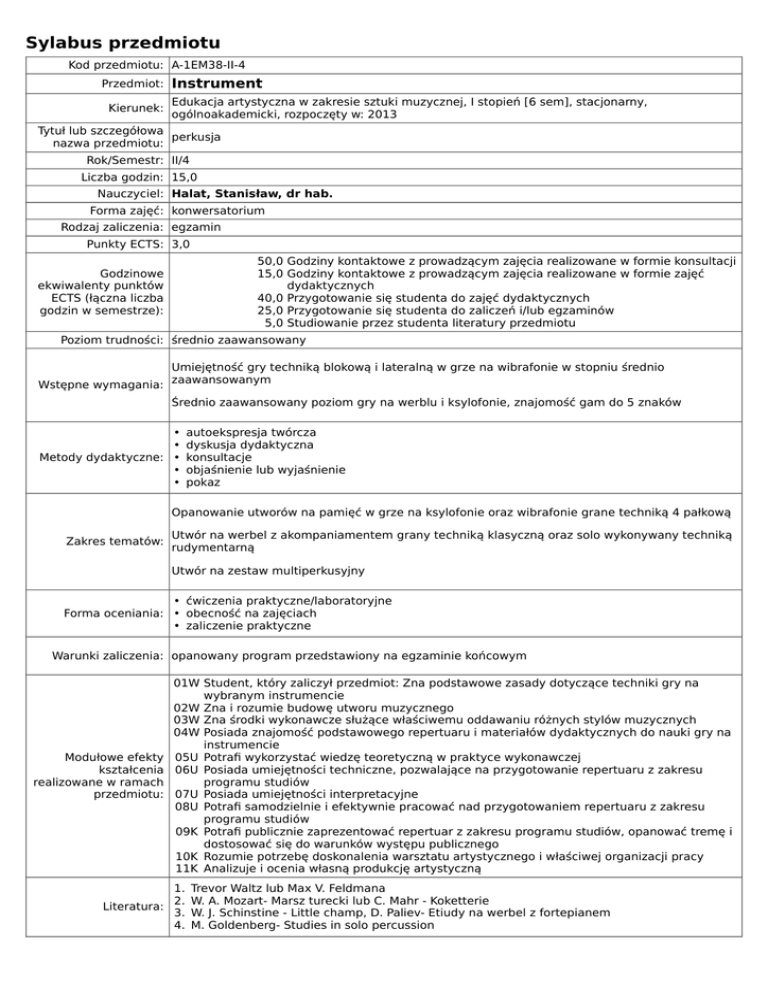 Sylabus przedmiotu Kod przedmiotu: A-1EM38-II-4 Przedmiot: Kierunek: Instrument Edukacja artystyczna w zakresie sztuki muzycznej, I stopień [6 sem], stacjonarny, ogólnoakademicki, rozpoczęty w: 2013 Tytuł lub szczegółowa perkusja nazwa przedmiotu: Rok/Semestr: II/4 Liczba godzin: 15,0 Nauczyciel: Halat, Stanisław, dr hab. Forma zajęć: konwersatorium Rodzaj zaliczenia: egzamin Punkty ECTS: 3,0 50,0 Godziny kontaktowe z prowadzącym zajęcia realizowane w formie konsultacji 15,0 Godziny kontaktowe z prowadzącym zajęcia realizowane w formie zajęć dydaktycznych 40,0 Przygotowanie się studenta do zajęć dydaktycznych 25,0 Przygotowanie się studenta do zaliczeń i/lub egzaminów 5,0 Studiowanie przez studenta literatury przedmiotu Godzinowe ekwiwalenty punktów ECTS (łączna liczba godzin w semestrze): Poziom trudności: średnio zaawansowany Umiejętność gry techniką blokową i lateralną w grze na wibrafonie w stopniu średnio Wstępne wymagania: zaawansowanym Średnio zaawansowany poziom gry na werblu i ksylofonie, znajomość gam do 5 znaków • • Metody dydaktyczne: • • • autoekspresja twórcza dyskusja dydaktyczna konsultacje objaśnienie lub wyjaśnienie pokaz Opanowanie utworów na pamięć w grze na ksylofonie oraz wibrafonie grane techniką 4 pałkową Zakres tematów: Utwór na werbel z akompaniamentem grany techniką klasyczną oraz solo wykonywany techniką rudymentarną Utwór na zestaw multiperkusyjny • ćwiczenia praktyczne/laboratoryjne Forma oceniania: • obecność na zajęciach • zaliczenie praktyczne Warunki zaliczenia: opanowany program przedstawiony na egzaminie końcowym Modułowe efekty kształcenia realizowane w ramach przedmiotu: 01W Student, który zaliczył przedmiot: Zna podstawowe zasady dotyczące techniki gry na wybranym instrumencie 02W Zna i rozumie budowę utworu muzycznego 03W Zna środki wykonawcze służące właściwemu oddawaniu różnych stylów muzycznych 04W Posiada znajomość podstawowego repertuaru i materiałów dydaktycznych do nauki gry na instrumencie 05U Potrafi wykorzystać wiedzę teoretyczną w praktyce wykonawczej 06U Posiada umiejętności techniczne, pozwalające na przygotowanie repertuaru z zakresu programu studiów 07U Posiada umiejętności interpretacyjne 08U Potrafi samodzielnie i efektywnie pracować nad przygotowaniem repertuaru z zakresu programu studiów 09K Potrafi publicznie zaprezentować repertuar z zakresu programu studiów, opanować tremę i dostosować się do warunków występu publicznego 10K Rozumie potrzebę doskonalenia warsztatu artystycznego i właściwej organizacji pracy 11K Analizuje i ocenia własną produkcję artystyczną 1. 2. Literatura: 3. 4. Trevor Waltz lub Max V. Feldmana W. A. Mozart- Marsz turecki lub C. Mahr - Koketterie W. J. Schinstine - Little champ, D. Paliev- Etiudy na werbel z fortepianem M. Goldenberg- Studies in solo percussion Dodatkowe informacje: Student potrafi przygotować i przedstawić materiał muzyczny w pełni kontrolując jego przebieg metryczno- rytmiczny oraz realizując uwagi interpretacyjne wykładowcy