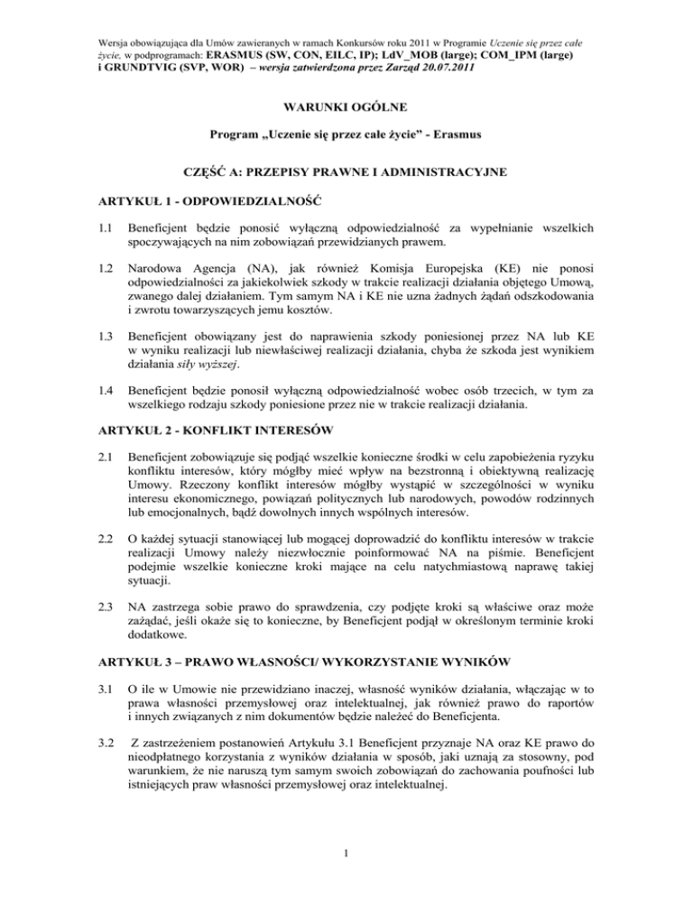 Wersja obowiązująca dla Umów zawieranych w ramach Konkursów roku 2011 w Programie Uczenie się przez całe życie, w podprogramach: ERASMUS (SW, CON, EILC, IP); LdV_MOB (large); COM_IPM (large) i GRUNDTVIG (SVP, WOR) – wersja zatwierdzona przez Zarząd 20.07.2011 WARUNKI OGÓLNE Program „Uczenie się przez całe życie” - Erasmus CZĘŚĆ A: PRZEPISY PRAWNE I ADMINISTRACYJNE ARTYKUŁ 1 - ODPOWIEDZIALNOŚĆ 1.1 Beneficjent będzie ponosić wyłączną odpowiedzialność za wypełnianie wszelkich spoczywających na nim zobowiązań przewidzianych prawem. 1.2 Narodowa Agencja (NA), jak również Komisja Europejska (KE) nie ponosi odpowiedzialności za jakiekolwiek szkody w trakcie realizacji działania objętego Umową, zwanego dalej działaniem. Tym samym NA i KE nie uzna żadnych żądań odszkodowania i zwrotu towarzyszących jemu kosztów. 1.3 Beneficjent obowiązany jest do naprawienia szkody poniesionej przez NA lub KE w wyniku realizacji lub niewłaściwej realizacji działania, chyba że szkoda jest wynikiem działania siły wyższej. 1.4 Beneficjent będzie ponosił wyłączną odpowiedzialność wobec osób trzecich, w tym za wszelkiego rodzaju szkody poniesione przez nie w trakcie realizacji działania. ARTYKUŁ 2 - KONFLIKT INTERESÓW 2.1 Beneficjent zobowiązuje się podjąć wszelkie konieczne środki w celu zapobieżenia ryzyku konfliktu interesów, który mógłby mieć wpływ na bezstronną i obiektywną realizację Umowy. Rzeczony konflikt interesów mógłby wystąpić w szczególności w wyniku interesu ekonomicznego, powiązań politycznych lub narodowych, powodów rodzinnych lub emocjonalnych, bądź dowolnych innych wspólnych interesów. 2.2 O każdej sytuacji stanowiącej lub mogącej doprowadzić do konfliktu interesów w trakcie realizacji Umowy należy niezwłocznie poinformować NA na piśmie. Beneficjent podejmie wszelkie konieczne kroki mające na celu natychmiastową naprawę takiej sytuacji. 2.3 NA zastrzega sobie prawo do sprawdzenia, czy podjęte kroki są właściwe oraz może zażądać, jeśli okaże się to konieczne, by Beneficjent podjął w określonym terminie kroki dodatkowe. ARTYKUŁ 3 – PRAWO WŁASNOŚCI/ WYKORZYSTANIE WYNIKÓW 3.1 O ile w Umowie nie przewidziano inaczej, własność wyników działania, włączając w to prawa własności przemysłowej oraz intelektualnej, jak również prawo do raportów i innych związanych z nim dokumentów będzie należeć do Beneficjenta. 3.2 Z zastrzeżeniem postanowień Artykułu 3.1 Beneficjent przyznaje NA oraz KE prawo do nieodpłatnego korzystania z wyników działania w sposób, jaki uznają za stosowny, pod warunkiem, że nie naruszą tym samym swoich zobowiązań do zachowania poufności lub istniejących praw własności przemysłowej oraz intelektualnej. 1 Wersja obowiązująca dla Umów zawieranych w ramach Konkursów roku 2011 w Programie Uczenie się przez całe życie, w podprogramach: ERASMUS (SW, CON, EILC, IP); LdV_MOB (large); COM_IPM (large) i GRUNDTVIG (SVP, WOR) – wersja zatwierdzona przez Zarząd 20.07.2011 ARTYKUŁ 4 - POUFNOŚĆ NA oraz Beneficjent zobowiązują się zachować poufność wszelkich dokumentów, informacji lub innych materiałów bezpośrednio związanych z przedmiotem Umowy, które zostaną należycie sklasyfikowane jako poufne, jeśli ich ujawnienie mogłoby spowodować poniesienie uszczerbku przez drugą stronę. Strony pozostaną związane tym postanowieniem również po dacie zakończenia działania. ARTYKUŁ 5 – UPUBLICZNIENIE INFORMACJI 5.1 O ile NA nie przedłoży odmiennego żądania, wszelkie komunikaty lub publikacje przekazywane bądź rozpowszechniane przez Beneficjenta w związku z działaniem, w tym na konferencjach lub seminariach, będą wskazywać, że działanie jest finansowane ze środków finansowych Unii Europejskiej (UE). Wszelkie komunikaty lub publikacje przekazywane bądź rozpowszechniane przez Beneficjenta, w każdej formie i na każdym nośniku, będą wskazywać, że wyłączna odpowiedzialność spoczywa na autorze, zaś NA nie jest odpowiedzialna za żaden przypadek ewentualnego wykorzystania zawartych w nich informacji. 5.2 Beneficjent upoważnia NA oraz KE do publikowania następujących informacji, w dowolnej formie i na dowolnym nośniku, w tym w Internecie: – nazwy i adresu Beneficjenta, – przedmiotu i celu finansowania, – przyznanej kwoty dofinansowania. Na uzasadniony i należycie umotywowany wniosek Beneficjenta NA może odstąpić od publikowania powyższych informacji, jeżeli ich ujawnienie naraziłoby na szwank bezpieczeństwo Beneficjenta lub jego interesy. ARTYKUŁ 6 - EWALUACJA W każdym przypadku, gdy NA, KE lub dowolny organ zewnętrzny upoważniony przez NA lub KE będzie przeprowadzać tymczasową lub końcową ocenę rezultatów działania w zestawieniu z celami danego programu UE, Beneficjent zobowiązuje się udostępnić NA, KE lub osobom upoważnionym przez nie wszelkie dokumenty lub informacje, które umożliwią pomyślne przeprowadzenie ewaluacji oraz przyznać im prawa dostępu określone w Artykule 18. ARTYKUŁ 7 – ZAWIESZENIE WYKONANIA UMOWY 7.1 Beneficjent może zawiesić realizację działania, jeśli w wyniku nadzwyczajnych okoliczności okaże się ona niemożliwa lub nadmiernie utrudniona, szczególnie w przypadkach działania siły wyższej. Beneficjent niezwłocznie poinformuje o tym fakcie NA podając wszystkie przyczyny oraz informacje szczegółowe, jak również przewidywalną datę wznowienia realizacji działania. 7.2 Jeśli NA nie rozwiąże Umowy na podstawie Artykułu 11.2, Beneficjent wznowi realizację gdy tylko pozwolą na to okoliczności i poinformuje o tym NA. Czas trwania działania zostanie przedłużony o okres odpowiadający długości zawieszenia. Zgodnie z Artykułem 13 należy zawrzeć na piśmie uzupełniający aneks do Umowy w celu przedłużenia okresu trwania działania oraz wprowadzenia wszelkich poprawek, które mogą okazać się konieczne w cel