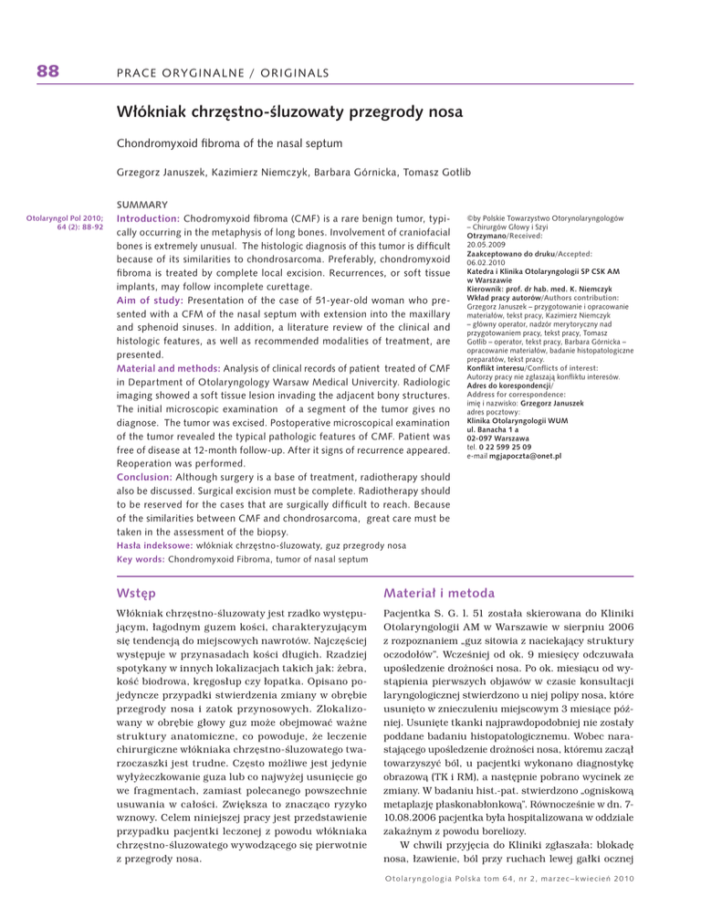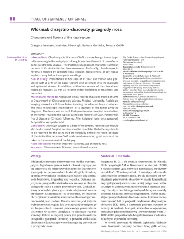 88 PRACE ORYGINALNE / ORIGINALS Włókniak chrzęstno-śluzowaty przegrody nosa Chondromyxoid fibroma of the nasal septum Grzegorz Januszek, Kazimierz Niemczyk, Barbara Górnicka, Tomasz Gotlib Otolaryngol Pol 2010; 64 (2): 88-92 SUMMARY Introduction: Chodromyxoid fi broma (CMF) is a rare benign tumor, typically occurring in the metaphysis of long bones. Involvement of craniofacial bones is extremely unusual. The histologic diagnosis of this tumor is difficult because of its similarities to chondrosarcoma. Preferably, chondromyxoid fi broma is treated by complete local excision. Recurrences, or soft tissue implants, may follow incomplete curettage. Aim of study: Presentation of the case of 51-year-old woman who presented with a CFM of the nasal septum with extension into the maxillary and sphenoid sinuses. In addition, a literature review of the clinical and histologic features, as well as recommended modalities of treatment, are presented. Material and methods: Analysis of clinical records of patient treated of CMF in Department of Otolaryngology Warsaw Medical Univercity. Radiologic imaging showed a soft tissue lesion invading the adjacent bony structures. The initial microscopic examination of a segment of the tumor gives no diagnose. The tumor was excised. Postoperative microscopical examination of the tumor revealed the typical pathologic features of CMF. Patient was free of disease at 12-month follow-up. After it signs of recurrence appeared. Reoperation was performed. Conclusion: Although surgery is a base of treatment, radiotherapy should also be discussed. Surgical excision must be complete. Radiotherapy should to be reserved for the cases that are surgically difficult to reach. Because of the similarities between CMF and chondrosarcoma, great care must be taken in the assessment of the biopsy. ©by Polskie Towarzystwo Otorynolaryngologów – Chirurgów Głowy i Szyi Otrzymano/Received: 20.05.2009 Zaakceptowano do druku/Accepted: 06.02.2010 Katedra i Klinika Otolaryngologii SP CSK AM w Warszawie Kierownik: prof. dr hab. med. K. Niemczyk Wkład pracy autorów/Authors contribution: Grzegorz Januszek – przygotowanie i opracowanie materiałów, tekst pracy, Kazimierz Niemczyk – główny operator, nadzór merytoryczny nad przygotowaniem pracy, tekst pracy, Tomasz Gotlib – operator, tekst pracy, Barbara Górnicka – opracowanie materiałów, badanie histopatologiczne preparatów, tekst pracy. Konflikt interesu/Conflicts of interest: Autorzy pracy nie zgłaszają konfliktu interesów. Adres do korespondencji/ Address for correspondence: imię i nazwisko: Grzegorz Januszek adres pocztowy: Klinika Otolaryngologii WUM ul. Banacha 1 a 02-097 Warszawa tel. 0 22 599 25 09 e-mail [email protected] Hasła indeksowe: włókniak chrzęstno-śluzowaty, guz przegrody nosa Key words: Chondromyxoid Fibroma, tumor of nasal septum Wstęp Materiał i metoda Włókniak chrzęstno-śluzowaty jest rzadko występującym, łagodnym guzem kości, charakteryzującym się tendencją do miejscowych nawrotów. Najczęściej występuje w przynasadach kości długich. Rzadziej spotykany w innych lokalizacjach takich jak: żebra, kość biodrowa, kręgosłup czy łopatka. Opisano pojedyncze przypadki stwierdzenia zmiany w obrębie przegrody nosa i zatok przynosowych. Zlokalizowany w obrębie głowy guz może obejmować ważne struktury anatomiczne, co powoduje, że leczenie chirurgiczne włókniaka chrzęstno-śluzowatego twarzoczaszki jest trudne. Często możliwe jest jedynie wyłyżeczkowanie guza lub co najwyżej usunięcie go we fragmentach, zamiast polecanego powszechnie usuwania w całości. Zwiększa to znacząco ryzyko wznowy. Celem niniejszej pracy jest przedstawienie przypadku pacjentki leczonej z powodu włókniaka chrzęstno-śluzowatego wywodzącego się pierwotnie z przegrody nosa. Pacjentka S. G. l. 51 została skierowana do Kliniki Otolaryngologii AM w Warszawie w sierpniu 2006 z rozpoznaniem „guz sitowia z naciekający struktury oczodołów”. Wcześniej od ok. 9 miesięcy odczuwała upośledzenie drożności nosa. Po ok. miesiącu od wystąpienia pierwszych objawów w czasie konsultacji laryngologicznej stwierdzono u niej polipy nosa, które usunięto w znieczuleniu miejscowym 3 miesiące później. Usunięte tkanki najprawdopodobniej nie zostały poddane badaniu histopatologicznemu. Wobec narastającego upośledzenie drożności nosa, któremu zaczął towarzyszyć ból, u pacjentki wykonano diagnostykę obrazową (TK i RM), a następnie pobrano wycinek ze zmiany. W badaniu hist.-pat. stwierdzono „ogniskową metaplazję płaskonabłonkową”. Równocześnie w dn. 710.08.2006 pacjentka była hospitalizowana w oddziale zakaźnym z powodu boreliozy. W chwili przyjęcia do Kliniki zgłaszała: blokadę nosa, łzawienie, ból przy ruchach lewej gałki ocznej O t o la r yngo l og i a Po l sk a t o m 6 4 , nr 2 , ma r ze c – k w i e c i e ń 2 010 PRACE ORYGINALNE / ORIGINALS oraz okresowo – uczucie drętwienia języka. W badaniu przedmiotowym stwierdzono: różowy miękki guz przypominający polip, wypełniający prawą jamę nosa, po stronie lewej – masy guza miały białawe zabarwienie. W rynoskopii tylnej – nozdrza tylne i nosogardło wolne. Innych istotnych odchyleń w badaniu laryngologicznym nie stwierdzono. Węzły chłonne na szyi były niewyczuwalne. Wykonano badanie endoskopowe i pobrano wycinek masy guza. Wynik badania hist.-pat. – „fragmenty błony śluzowej ogniskowo pokryte nabłonkiem przejściowym. Pod nabłonkiem oraz luźno leżące – fragmenty tkanki mezenchymalnej o obrazie nieprawidłowej chrząstki. S100 (+). Guzy chrzęstne w okolicy sitowia są niezwykle rzadkie. Metaplazja chrzęstna?” Wykonano badanie TK, gdzie stwierdzono : Dużą masę guzowatą o wym. ok. 36x45x49 mm, zlokalizowaną w rzucie sitowia przedniego i środkowego z tendencją do większego modelowania struktur kostnych oczodołu lewego (pozostawała w bezpośrednim kontakcie z mię