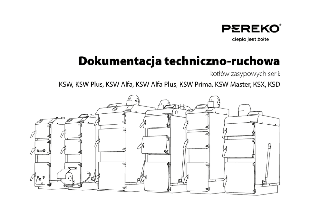 Dokumentacja techniczno-ruchowa kotłów zasypowych serii: KSW, KSW Plus, KSW Alfa, KSW Alfa Plus, KSW Prima, KSW Master, KSX, KSD Dziękujemy Państwu za wybór kotła marki PEREKO. Niniejsza dokumentacja dotyczy kotłów zasypo- Do kompletu dokumentów kotła wspomaganego elektroniką dołączona jest instrukcja sterownika, wych serii KSW, KSW ALFA, KSW PLUS, KSW ALFA PLUS, KSW PRIMA, KSX, KSD, KSW MASTER oraz z którą również należy się zapoznać. Dokumentację i instrukcje należy zachować i przechowywać tak, zawiera wszystkie niezbędne informacje i zalecenia dotyczące ich użytkowania. aby można z nich było korzystać w trakcie obsługi urządzenia. Prosimy o uważną lekturę poniższej treści przed uruchomieniem kotła. Przestrzeganie zawartych w instrukcji wskazówek zapewni Państwu bezpieczeństwo, uchroni przed niewłaściwym użytkowaniem urządzenia i jego wadliwą pracą. Spis treści 1. WSTĘP . . . . . . . . . . . . . . . . . . . . . . . . . . . . . . . . . . . . . . . . . . . . . . . . . . . . . . . . . . . . . . . . . . . . . . . . . . 3 3.4. Podłączenie kotła do instalacji elektrycznej. . . . . . . . . . . . . . . . . . . . . . . . . . . . . . . . . . . . . . 18 1.1. Obowiązki użytkownika i wskazówki dotyczące bezpieczeństwa. . . . . . . . . . . . . . . . . . . . . 3 3.5. Napełnianie instalacji wodą. . . . . . . . . . . . . . . . . . . . . . . . . . . . . . . . . . . . . . . . . . . . . . . . . . . 18 1.2. Dobór prawidłowej mocy kotła . . . . . . . . . . . . . . . . . . . . . . . . . . . . . . . . . . . . . . . . . . . . . . . . . 3 3.6. Instalacja miarkownika ciągu. . . . . . . . . . . . . . . . . . . . . . . . . . . . . . . . . . . . . . . . . . . . . . . . . . 19 2. OPIS KOTŁÓW ZASYPOWYCH. . . . . . . . . . . . . . . . . . . . . . . . . . . . . . . . . . . . . . . . . . . . . . . . . . . . . . . . 4 4. INSTRUKCJA OBSŁUGI. . . . . . . . . . . . . . . . . . . . . . . . . . . . . . . . . . . . . . . . . . . . . . . . . . . . . . . . . . . . . 20 2.1. Przeznaczenie . . . . . . . . . . . . . . . . . . . . . . . . . . . . . . . . . . . . . . . . . . . . . . . . . . . . . . . . . . . . . . . 4 4.1. Sprawdzenie instalacji. . . . . . . . . . . . . . . . . . . . . . . . . . . . . . . . . . . . . . . . . . . . . . . . . . . . . . . . 20 2.2. Opis budowy . . . . . . . . . . . . . . . . . . . . . . . . . . . . . . . . . . . . . . . . . . . . . . . . . . . . . . . . . . . . . . . . 4 4.2. Pierwsze rozpalenie kotła. . . . . . . . . . . . . . . . . . . . . . . . . . . . . . . . . . . . . . . . . . . . . . . . . . . . . 20 2.3. Schemat budowy kotła zasypowego. . . . . . . . . . . . . . . . . . . . . . . . . . . . . . . . . . . . . . . . . . . . 6 4.3. Palenie w kotle. . . . . . . . . . . . . . . . . . . . . . . . . . . . . . . . . . . . . . . . . . . . . . . . . . . . . . . . . . . . . . 22 2.4. Parametry techniczno- eksploatacyjne. . . . . . . . . . . . . . . . . . . . . . . . . . . . . . . . . . . . . . . . . . . 8 4.4. Zatrzymanie pracy kotła. . . . . . . . . . . . . . . . . . . . . . . . . . . . . . . . . . . . . . . . . . . . . . . . . . . . . . 23 2.5. Paliwo. . . . . . . . . . . . . . . . . . . . . . . . . . . . . . . . . . . . . . . . . . . . . . . . . . . . . . . . . . . . . . . . . . . . . 12 4.5. Awaryjne zatrzymanie pracy kotła . . . . . . . . . . . . . . . . . . . . . . . . . . . . . . . . . . . . . . . . . . . . . 24 2.6. Wyposażenie kotła. . . . . . . . . . . . . . . . . . . . . . . . . . . . . . . . . . . . . . . . . . . . . . . . . . . . . . . . . . . 14 4.6. Wygaszanie kotła po zakończeniu sezonu grzewczego. . . . . . . . . . . . . . . . . . . . . . . . . . . . . 24 3. PRZED URUCHOMIENIEM. . . . . . . . . . . . . . . . . . . . . . . . . . . . . . . . . . . . . . . . . . . . . . . . . . . . . . . . . . 15 4.7. Czyszczenie i konserwacja. . . . . . . . . . . . . . . . . . . . . . . . . . . . . . . . . . . . . . . . . . . . . . . . . . . . 24 3.1. Ustawienie kotła . . . . . . . . . . . . . . . . . . . . . . . . . . . . . . . . . . . . . . . . . . . . . . . . . . . . . . . . . . . . 15 4.8. Warunki bezpiecznej eksploatacji . . . . . . . . . . . . . . . . . . . . . . . . . . . . . . . . . . . . . . . . . . . . . . 25 3.2. Podłączenie do komina. . . . . . . . . . . . . . . . . . . . . . . . . . . . . . . . . . . . . . . . . . . . . . . . . . . . . . . 16 5. ZAKŁÓCENIA PRACY KOTŁA – zanim zadzwonisz po serwis. . . . . . . . . . . . . . . . . . . . . . . . . . . . . 26 3.3. Podłączenie instalacji c.o. i c.w.u.. . . . . . . . . . . . . . . . . . . . . . . . . . . . . . . . . . . . . . . . . . . . . . . 16 6. WARUNKI GWARANCJI. . . . . . . . . . . . . . . . . . . . . . . . . . . . . . . . . . . . . . . . . . . . . . . . . . . . . . . . . . . . 27 1. WSTĘP 1.1. Obowiązki użytkownika i wskazówki dotyczące bezpieczeństwa Dla zapewnienia bezpieczeństwa użytkowania oraz utrzymania optymalnej pracy urządzenia należy: • przeczytać i stosować się do zaleceń zawartych w instrukcji kotła i instrukcji sterownika (dotyczy kotła ze sterownikiem), • instrukcję należy zachować i przechowywać w bezpiecznym miejscu w kotłowni tak, aby można było z niej skorzystać w każdym momencie obsługiwania kotła, • nie dopuszczać do obsługi dzieci, osób dorosłych, którym niepełnosprawność uniemożliwia bezpieczne użytkowanie oraz osób nie zaznajomionych z treścią instrukcji, • instalację wykonać według obowiązujących przepisów oraz zgodnie z zasadami i zaleceniami • przed przystąpieniem do ustawienia i podłączenia kotła sprawdzić, czy wszystkie podzespoły są sprawne i czy kocioł posiada kompletne wyposażenie do obsługi i czyszczenia, • kocioł czyścić regularnie, nie rzadziej niż raz w tygodniu dokładnie usuwając warstwę osadzającej się sadzy i popiołu, które obniżają sprawność kotła, • zapewnić ciągły dostęp do urządzenia • najwyższa temperatura wody w kotle nie może