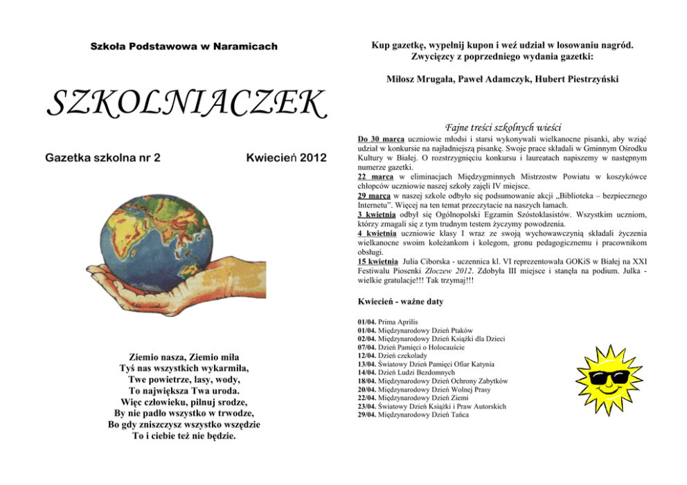 Szkoła Podstawowa w Naramicach SZKOLNIACZEK Gazetka szkolna nr 2 Kwiecień 2012 Kup gazetkę, wypełnij kupon i weź udział w losowaniu nagród. Zwycięzcy z poprzedniego wydania gazetki: Miłosz Mrugała, Paweł Adamczyk, Hubert Piestrzyński Fajne treści szkolnych wieści Do 30 marca uczniowie młodsi i starsi wykonywali wielkanocne pisanki, aby wziąć udział w konkursie na najładniejszą pisankę. Swoje prace składali w Gminnym Ośrodku Kultury w Białej. O rozstrzygnięciu konkursu i laureatach napiszemy w następnym numerze gazetki. 22 marca w eliminacjach Międzygminnych Mistrzostw Powiatu w koszykówce chłopców uczniowie naszej szkoły zajęli IV miejsce. 29 marca w naszej szkole odbyło się podsumowanie akcji „Biblioteka – bezpiecznego Internetu”. Więcej na ten temat przeczytacie na naszych łamach. 3 kwietnia odbył się Ogólnopolski Egzamin Szóstoklasistów. Wszystkim uczniom, którzy zmagali się z tym trudnym testem życzymy powodzenia. 4 kwietnia uczniowie klasy I wraz ze swoją wychowawczynią składali życzenia wielkanocne swoim koleżankom i kolegom, gronu pedagogicznemu i pracownikom obsługi. 15 kwietnia Julia Ciborska - uczennica kl. VI reprezentowała GOKiS w Białej na XXI Festiwalu Piosenki Złoczew 2012. Zdobyła III miejsce i stanęła na podium. Julka wielkie gratulacje!!! Tak trzymaj!!! Kwiecień - ważne daty Ziemio nasza, Ziemio miła Tyś nas wszystkich wykarmiła, Twe powietrze, lasy, wody, To największa Twa uroda. Więc człowieku, pilnuj srodze, By nie padło wszystko w trwodze, Bo gdy zniszczysz wszystko wszędzie To i ciebie też nie będzie. 01/04. Prima Aprilis 01/04. Międzynarodowy Dzień Ptaków 02/04. Międzynarodowy Dzień Książki dla Dzieci 07/04. Dzień Pamięci o Holocauście 12/04. Dzień czekolady 13/04. Światowy Dzień Pamięci Ofiar Katynia 14/04. Dzień Ludzi Bezdomnych 18/04. Międzynarodowy Dzień Ochrony Zabytków 20/04. Międzynarodowy Dzień Wolnej Prasy 22/04. Międzynarodowy Dzień Ziemi 23/04. Światowy Dzień Książki i Praw Autorskich 29/04. Międzynarodowy Dzień Tańca Szkolne rekolekcje Przygotowaliśmy dla was miłą niespodziankę – wywiad z waszym ulubionym W księdzem!!! Zapraszamy do lektury. W piątek 16 marca o godz. 8:30 1. Kim chciał ksiądz zostać, kiedy był ksiądz w naszym wieku? parafialnym p.w. św. Rocha w Naramicach. Ksiądz rekolekcjonista Jan Skibiński wprowadził nas Kiedy byłem takim małym chłopcem jak wy bardzo chciałem zostać prawnikiem. w świat swego dzieciństwa i opowiedział kilka bardzo ciekawych i zabawnych wydarzeń z tego 2. Jakim był ksiądz uczniem? okresu. Wszystkie historie oparte były na miłości i poszanowaniu godności drugiego człowieka. dniach 16, 17, 18 marca uczestniczyliśmy w szkolnych rekolekcjach. wszyscy uczniowie naszej szkoły zebrali się w kościele Następnie została odprawiona uroczysta msza święta, podczas której przystąpiliśmy do komunii (śmiech) Ja zawsze byłem bardzo dobrym uczniem. świętej. 3. Kiedy poczuł ksiądz powołanie do kapłaństwa? Muszę powiedzieć, że dość wcześnie, a mianowicie kiedy byłem uczniem I klasy liceum. W sobotę i w niedzielę również uczestniczyliśmy w rekolekcjach. Mogliśmy razem z naszymi rodzicami posłuchać opowieści o ludzkich ułomnościach i słabościach. Dowiedzieliśmy się również czym jest grzech i co robić, aby świat był lepszy. 4. W jakiej parafii był ksiądz proboszczem zanim trafił ksiądz do nas? Służyłem ludziom w parafii w Czarnożyłach. Podsumowanie akcji o bezpiecznym Internecie 5. Czy praca z dziećmi sprawia księdzu satysfakcję? Bardzo lubię uczyć dzieci. Dlatego ta praca jest dla mnie bardzo przyjemna W dniu 29 marca 2012r. Biblioteka Publiczno-Szkolna w Naramicach zorganizowała spotkanie i jestem z niej bardzo zadowolony. A dzieciaki są po prostu rewelacyjne. podsumowujące Kampanię "Biblioteka - miejsce bezpiecznego Internetu". Na spotkanie zostali zaproszeni rodzice, nasza pani dyrektor, grono pedagogiczne i wszyscy 6. Którą klasę lubi ksiądz najbardziej i dlaczego? uczniowie. Lubię wszystkie klasy, bo są wspaniałe. Gościem była również dyrektor przedszkola pani Dorota Cicha. Celem tego wydarzenia było uświadomienie uczniom i rodzicom jakie niebezpieczeństwa mogą 7. Gdzie ksiądz lubi spędzać wakacje? spotkać nas w sieci. Na początku wszystkich obecnych powitała pani Bożena Leszczyńska. Od dzieciństwa kochałem góry. Ta miłość przetrwała do dziś. Najlepiej Następnie obejrzeliśmy prezentację multimedialną, która przedstawiała założenia tej kampanii. czuję się właśnie tam. Po obejrzeniu filmu uczeń klasy IV Jan Halusiak przeczytał interesujący tekst skierowany do Bardo serdecznie dziękujemy księdzu za udzielenie wywiadu do naszej rodziców. W dalszej części spotkania obejrzeliśmy kilka scenek o cyberprzemocy. gazetki i życzymy wielu sukcesów w posłudze kapłańskiej i w pracy z dziećmi. Na tę okazję uczniowie klasy IV przygotowali również prace plastyczne, które zostały Wywiad przeprowadziły: Wiktoria Cieślak, Karolina Halusiak i Aneta Prażmowska wyeksponowane na ścianach sali gimnastycznej. Na zakończenie spotkania Pani Dyrektor i pani Bożena Leszczyńska wręczyły dyplomy dzieciom, które ukończyły kurs e-learningowy z zakresu bezpieczeństwa w Internecie. Z niecierpliwością czekamy na rozstrzygnięcie konkursu, który Wiara jest ufnością pokładaną w Bogu, a ufność jest zawsze wielka. To więcej niż wiara ma nastąpić 21 maja 2012 r. Opracowała Kinga Nowak Ks. Jan Twardowski NIKT NIE RODZI SIĘ CZYTELNIKIEM, CZYTELNIKA TRZEBA WYCHOWAĆ. "Nie mów dziecku, jak bardzo je kochasz, pokaż to, poświęcając mu czas." Ulrich Schaffer WSZYSCY CHCEMY, ABY NASZE DZIECI WYROSŁY NA MĄDRYCH, DOBRYCH I SZCZĘŚLIWYCH LUDZI. JEST NA TO SPOSÓB CZYTAJMY DZIECIOM! Drodzy Rodzice! Pragniemy zachęcić Państwa do głośnego czytania dzieciom. Od Was w największym stopniu zal
