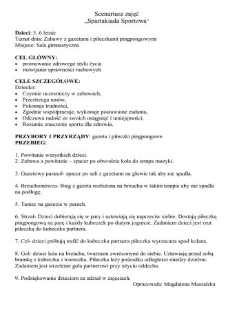 Scenariusz zajęć „Spartakiada Sportowa” Dzieci: 5, 6 letnie Temat dnia: Zabawy z gazetami i piłeczkami pingpongowymi Miejsce: Sala gimnastyczna CEL GŁÓWNY: promowanie zdrowego stylu życia rozwijanie sprawności ruchowych CELE SZCZEGÓŁOWE: Dziecko: Czynnie uczestniczy w zabawach, Przestrzega umów, Pokonuje trudności, Zgodnie współpracuje, wykonuje postawione zadania, Odczuwa radość ze swoich osiągnięć i umiejętności, Rozumie znaczenie sportu dla zdrowia, PRZYBORY I PRZYRZĄDY: gazeta i piłeczki pingpongowe. PRZEBIEG: 1. Powitanie wszystkich dzieci. 2. Zabawa a powitanie – spacer po obwodzie koła do tempa muzyki. 3. Gazetowy parasol- spacer po sali z gazetami na głowie tak aby nie spadła. 4. Brzuchomówca- Bieg z gazeta rozłożona na brzuchu w takim tempie aby nie spadła na podłogę. 5. Taniec na gazecie w parach. 6. Strzał- Dzieci dobierają się w pary i ustawiają się naprzeciw siebie. Dostają piłeczkę pingpongową na parę i każdy kubeczek po dużym jogurcie. Zadaniem dzieci jest rzut piłeczką do kubeczka partnera. 7. Cel- dzieci próbują trafić do kubeczka partnera piłeczka wyrzucana spod kolana. 8. Gol- dzieci leża na brzuchu, twarzami zwróconymi do siebie. Ustawiają przed sobą bramkę z kubeczka i woreczka. Piłeczka leży pośrodku odległości miedzy dziećmi. Zadaniem jest strzelenie gola partnerowi przy użyciu oddechu. 9. Podziękowanie dzieciom za udział w zajęciach. Opracowała: Magdalena Massalska