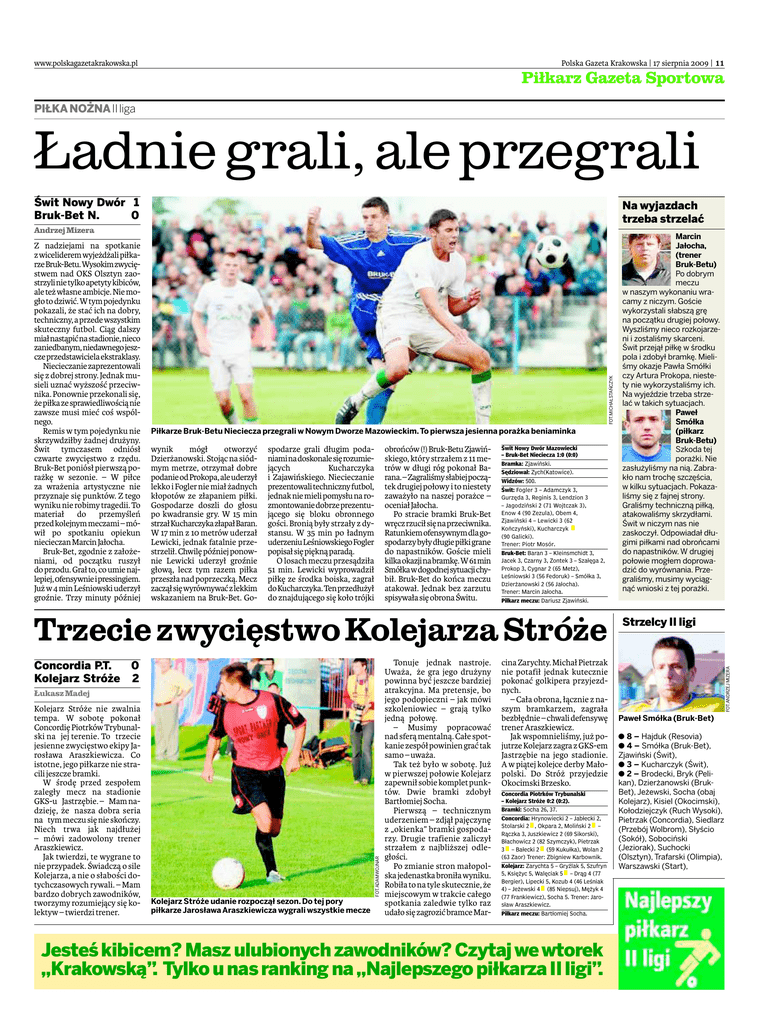 www.polskagazetakrakowska.pl Polska Gazeta Krakowska | 17 sierpnia 2009 | 11 Piłkarz Gazeta Sportowa PIŁKA NOŻNA II liga Ładnie grali, ale przegrali Świt Nowy Dwór 1 Bruk-Bet N. 0 Na wyjazdach trzeba strzelać Piłkarze Bruk-Betu Nieciecza przegrali w Nowym Dworze Mazowieckim. To pierwsza jesienna porażka beniaminka wynik mógł otworzyć Dzierżanowski. Stojąc na siódmym metrze, otrzymał dobre podanieodProkopa,aleuderzył lekko i Fogler nie miał żadnych kłopotów ze złapaniem piłki. Gospodarze doszli do głosu po kwadransie gry. W 15 min strzałKucharczykazłapałBaran. W 17 min z 10 metrów uderzał Lewicki, jednak fatalnie przestrzelił. Chwilę później ponownie Lewicki uderzył groźnie głową, lecz tym razem piłka przeszła nad poprzeczką. Mecz zacząłsięwyrównywaćzlekkim wskazaniem na Bruk-Bet. Go- spodarze grali długim podaniaminadoskonalesięrozumiejących Kucharczyka i Zajawińskiego. Niecieczanie prezentowalitechnicznyfutbol, jednak nie mieli pomysłu na rozmontowaniedobrzeprezentującego się bloku obronnego gości. Bronią były strzały z dystansu. W 35 min po ładnym uderzeniuLeśniowskiegoFogler popisał się piękną paradą. O losach meczu przesądziła 51 min. Lewicki wyprowadził piłkę ze środka boiska, zagrał doKucharczyka.Tenprzedłużył do znajdującego się koło trójki obrońców (!) Bruk-Betu Zjawińskiego, który strzałem z 11 metrów w długi róg pokonał Barana.–Zagraliśmysłabiejpoczątek drugiej połowy i to niestety zaważyło na naszej porażce – oceniał Jałocha. Po stracie bramki Bruk-Bet wręczrzuciłsięnaprzeciwnika. Ratunkiemofensywnymdlagospodarzybyłydługiepiłkigrane do napastników. Goście mieli kilkaokazjinabramkę.W61min Smółkawdogodnejsytuacjichybił. Bruk-Bet do końca meczu atakował. Jednak bez zarzutu spisywała się obrona Świtu. Świt Nowy Dwór Mazowiecki – Bruk-Bet Nieciecza 1:0 (0:0) Bramka: Zjawiński. Sędziował: Zych(Katowice). Widzów: 500. Świt: Fogler 3 – Adamczyk 3, Gurzęda 3, Reginis 3, Lendzion 3 – Jagodziński 2 (71 Wojtczak 3), Enow 4 (90 Zezula), Obem 4, Zjawiński 4 – Lewicki 3 (62 Kończyński), Kucharczyk I (90 Galicki). Trener: Piotr Mosór. Bruk-Bet: Baran 3 – Kleinsmchidt 3, Jacek 3, Czarny 3, Zontek 3 – Szałęga 2, Prokop 3, Cygnar 2 (65 Metz), Leśniowski 3 (56 Fedoruk) – Smółka 3, Dzierżanowski 2 (56 Jałocha). Trener: Marcin Jałocha. Piłkarz meczu: Dariusz Zjawiński. Trzecie zwycięstwo Kolejarza Stróże Concordia P.T. 0 Kolejarz Stróże 2 Kolejarz Stróże nie zwalnia tempa. W sobotę pokonał Concordię Piotrków Trybunalski na jej terenie. To trzecie jesienne zwycięstwo ekipy Jarosława Araszkiewicza. Co istotne, jego piłkarze nie stracili jeszcze bramki. W środę przed zespołem zaległy mecz na stadionie GKS-u Jastrzębie. – Mam nadzieję, że nasza dobra seria na tym meczu się nie skończy. Niech trwa jak najdłużej – mówi zadowolony trener Araszkiewicz. Jak twierdzi, te wygrane to nie przypadek. Świadczą o sile Kolejarza, a nie o słabości dotychczasowych rywali. – Mam bardzo dobrych zawodników, tworzymy rozumiejący się kolektyw – twierdzi trener. FOT.ADAMWOJNAR Łukasz Madej Kolejarz Stróże udanie rozpoczął sezon. Do tej pory piłkarze Jarosława Araszkiewicza wygrali wszystkie mecze Tonuje jednak nastroje. Uważa, że gra jego drużyny powinna być jeszcze bardziej atrakcyjna. Ma pretensje, bo jego podopieczni – jak mówi szkoleniowiec – grają tylko jedną połowę. – Musimy popracować nad sferą mentalną. Całe spotkanie zespół powinien grać tak samo – uważa. Tak też było w sobotę. Już w pierwszej połowie Kolejarz zapewnił sobie komplet punktów. Dwie bramki zdobył Bartłomiej Socha. Pierwszą – technicznym uderzeniem – zdjął pajęczynę z „okienka” bramki gospodarzy. Drugie trafienie zaliczył strzałem z najbliższej odległości. Po zmianie stron małopolska jedenastka broniła wyniku. Robiła to na tyle skutecznie, że miejscowym w trakcie całego spotkania zaledwie tylko raz udało się zagrozić bramce Mar- Marcin Jałocha, (trener Bruk-Betu) Po dobrym meczu w naszym wykonaniu wracamy z niczym. Goście wykorzystali słabszą grę na początku drugiej połowy. Wyszliśmy nieco rozkojarzeni i zostaliśmy skarceni. Świt przejął piłkę w środku pola i zdobył bramkę. Mieliśmy okazje Pawła Smółki czy Artura Prokopa, niestety nie wykorzystaliśmy ich. Na wyjeździe trzeba strzelać w takich sytuacjach. Paweł Smółka (piłkarz Bruk-Betu) Szkoda tej porażki. Nie zasłużyliśmy na nią. Zabrakło nam trochę szczęścia, w kilku sytuacjach. Pokazaliśmy się z fajnej strony. Graliśmy techniczną piłką, atakowaliśmy skrzydłami. Świt w niczym nas nie zaskoczył. Odpowiadał długimi piłkami nad obrońcami do napastników. W drugiej połowie mogłem doprowadzić do wyrównania. Przegraliśmy, musimy wyciągnąć wnioski z tej porażki. cina Zarychty. Michał Pietrzak nie potafił jednak kutecznie pokonać golkipera przyjezdnych. – Cała obrona, łącznie z naszym bramkarzem, zagrała bezbłędnie – chwali defensywę trener Araszkiewicz. Jak wspomnieliśmy, już pojutrze Kolejarz zagra z GKS-em Jastrzębie na jego stadionie. A w piątej kolejce derby Małopolski. Do Stróż przyjedzie Okocimski Brzesko. Concordia Piotrków Trybunalski – Kolejarz Stróże 0:2 (0:2). Bramki: Socha 26, 37. Concordia: Hrynowiecki 2 – Jabłecki 2, Stolarski 2I, Okpara 2, Moliński 2I – Rączka 3, Juszkiewicz 2 (69 Sikorski), Błachowicz 2 (82 Szymczyk), Pietrzak 3I – Bałecki 2I (59 Kukułka), Wolan 2 (63 Zaor) Trener: Zbigniew Karbownik. Kolejarz: Zarychta 5 – Gryźlak 5, Szufryn 5, Księżyc 5, Walęciak 5I – Drąg 4 (77 Bergier), Lipecki 5, Kozub 4 (46 Leśniak 4) – Jeżewski 4I (85 Niepsuj), Mężyk 4 (77 Frankiewicz), Socha 5. Trener: Jarosław Araszkiewicz. Piłkarz meczu: Bartłomiej Socha. Jesteś kibicem? Masz ulubionych zawodników? Czytaj we wtorek „Krakows