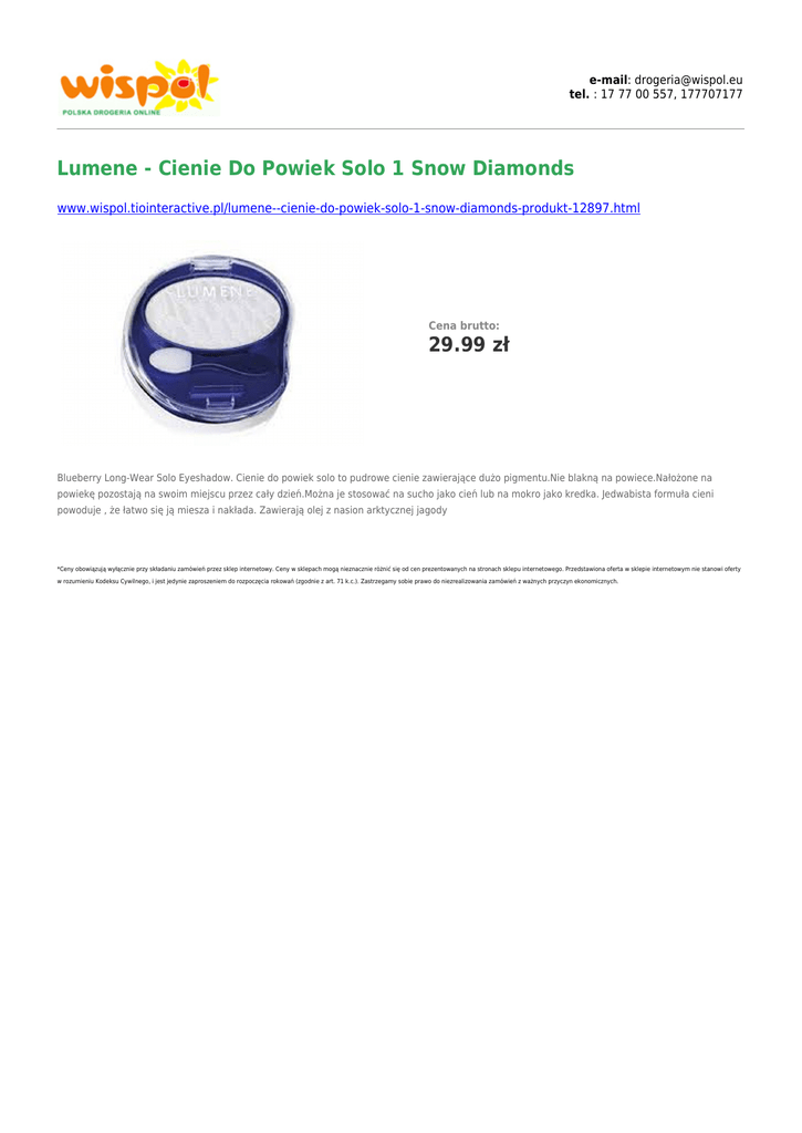 e-mail: [email protected] tel. : 17 77 00 557, 177707177 Lumene - Cienie Do Powiek Solo 1 Snow Diamonds www.wispol.tiointeractive.pl/lumene--cienie-do-powiek-solo-1-snow-diamonds-produkt-12897.html Cena brutto: 29.99 zł Blueberry Long-Wear Solo Eyeshadow. Cienie do powiek solo to pudrowe cienie zawierające dużo pigmentu.Nie blakną na powiece.Nałożone na powiekę pozostają na swoim miejscu przez cały dzień.Można je stosować na sucho jako cień lub na mokro jako kredka. Jedwabista formuła cieni powoduje , że łatwo się ją miesza i nakłada. Zawierają olej z nasion arktycznej jagody *Ceny obowiązują wyłącznie przy składaniu zamówień przez sklep internetowy. Ceny w sklepach mogą nieznacznie różnić się od cen prezentowanych na stronach sklepu internetowego. Przedstawiona oferta w sklepie internetowym nie stanowi oferty w rozumieniu Kodeksu Cywilnego, i jest jedynie zaproszeniem do rozpoczęcia rokowań (zgodnie z art. 71 k.c.). Zastrzegamy sobie prawo do niezrealizowania zamówień z ważnych przyczyn ekonomicznych.