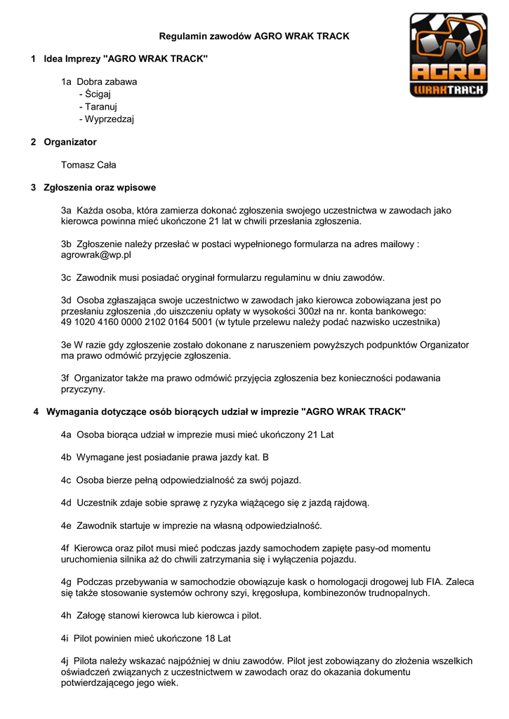 Regulamin zawodów AGRO WRAK TRACK 1 Idea Imprezy ''AGRO WRAK TRACK'' 1a Dobra zabawa - Ścigaj - Taranuj - Wyprzedzaj 2 Organizator Tomasz Cała 3 Zgłoszenia oraz wpisowe 3a Każda osoba, która zamierza dokonać zgłoszenia swojego uczestnictwa w zawodach jako kierowca powinna mieć ukończone 21 lat w chwili przesłania zgłoszenia. 3b Zgłoszenie należy przesłać w postaci wypełnionego formularza na adres mailowy : [email protected] 3c Zawodnik musi posiadać oryginał formularzu regulaminu w dniu zawodów. 3d Osoba zgłaszająca swoje uczestnictwo w zawodach jako kierowca zobowiązana jest po przesłaniu zgłoszenia ,do uiszczeniu opłaty w wysokości 300zł na nr. konta bankowego: 49 1020 4160 0000 2102 0164 5001 (w tytule przelewu należy podać nazwisko uczestnika) 3e W razie gdy zgłoszenie zostało dokonane z naruszeniem powyższych podpunktów Organizator ma prawo odmówić przyjęcie zgłoszenia. 3f Organizator także ma prawo odmówić przyjęcia zgłoszenia bez konieczności podawania przyczyny. 4 Wymagania dotyczące osób biorących udział w imprezie ''AGRO WRAK TRACK'' 4a Osoba biorąca udział w imprezie musi mieć ukończony 21 Lat 4b Wymagane jest posiadanie prawa jazdy kat. B 4c Osoba bierze pełną odpowiedzialność za swój pojazd. 4d Uczestnik zdaje sobie sprawę z ryzyka wiążącego się z jazdą rajdową. 4e Zawodnik startuje w imprezie na własną odpowiedzialność. 4f Kierowca oraz pilot musi mieć podczas jazdy samochodem zapięte pasy-od momentu uruchomienia silnika aż do chwili zatrzymania się i wyłączenia pojazdu. 4g Podczas przebywania w samochodzie obowiązuje kask o homologacji drogowej lub FIA. Zaleca się także stosowanie systemów ochrony szyi, kręgosłupa, kombinezonów trudnopalnych. 4h Załogę stanowi kierowca lub kierowca i pilot. 4i Pilot powinien mieć ukończone 18 Lat 4j Pilota należy wskazać najpóźniej w dniu zawodów. Pilot jest zobowiązany do złożenia wszelkich oświadczeń związanych z uczestnictwem w zawodach oraz do okazania dokumentu potwierdzającego jego wiek. 5 Wymagania dotyczące aut jadących w zawodach ''AGRO WRAK TRACK'' 5a Do zawodów dopuszczone są wszystkie samochody osobowe z wyjątkiem Fiata 126p oraz samochodów wyposażonych w napęd na cztery koła o wartości handlowej nieprzekraczającej 1000 PLN. 5b Samochody wyposażone w instalację gazową dopuszczone są do uczestnictwa w zawodach tylko w przypadku całkowicie opróżnionej butli. 5c Montaż elementów bezpieczeństwa jak fotele kubełkowe , sportowe kierownice , pasy szelkowe ,klatka bezpieczeństwa są dopuszczalne. 5d Dopuszcza się tylko pojazdy z napędem na jedną oś. 5e Nadwozie pojazdu musi być zamknięte. 5f Każdy pojazd w dniu zawodów przechodzi badania techniczne u Organizatora. 5g Samochód musi posiadać: - Fotel kierowcy oryginalny bądź podobny, trwale zamocowany do podłogi oraz pas bezpieczeństwa. - Dopuszcza się fotele kubełkowe oraz pasy szelkowe. - Sprawny układ hamulcowy i kierowniczy. - Oryginalny zbiornik paliwa, bądź inny zbiornik trwale zamontowany, szczelny i nie powodujący zagrożenia wycieku paliwa bądź zniszczenia podczas jazdy, bądź kolizji. - Akumulator musi być zamocowany w pojeździe trwale za pomocą jarzma metalowego bądź pasa transportowego. - Gaśnica o masie min 1 kg zamocowana trwale wewnątrz pojazdu w odległości max 1m od obrysu fotela kierowcy w miejscu pozwalającym na łatwy dostęp. - Umieszczone na bokach, masce naklejki przekazane przez organizatora, numer startowy po obu stronach na widocznym miejscu. - Przednią szybę 5h Pojazd może mieć: - Stylizację wg uznania kierowcy, przez stylizację rozumie się zmiany wizualne, malowanie, mocowanie dodatkowych elementów, obklejanie, inne formy radosnej twórczości blacharskiej, artystycznej ;-) 5j Pojazd nie może mieć - Elementów wzmacniających lub ozdobnych ostro zakończonych - Opon kołkowanych, rolniczych, mud terra-in, łańcuchów, kolców a także opon terenowych typu jodełka, kostka, łopatki itp. Opon naciętych poniżej 50% powierzchni bieżnika - Zauważalnych wycieków oleju, płynu hamulcowego i chłodniczego. - Zbędnych elementów wyposażenia nie zamocowanych trwale wewnątrz bądź na zewnątrz pojazdu. - Haków (takich do zapinania przyczepy) 5k Wszelkie elementy dodatkowe muszą być przytwierdzone do nadwozia samochodu. 5l Ostateczną decyzję o dopuszczeniu pojazdu do startu podejmuje Organizator. - Organizator, po przeprowadzeniu Badania Technicznego może przekazać kierowcy listę niezgodności z regulaminem i o ile w wyznaczonym czasie niezgodności te zostaną usunięte, pojazd zostanie dopuszczony do startu. 5m Sędzia Techniczny może podczas całej imprezy nie dopuścić do dalszych startów pojazdu, jeżeli rażąco narusza wymogi bezpieczeństwa. 5n W przypadku auta które ciężko określić jako osobowe np. (busy, duże vany, terenówki z napędem na jedną oś) decyzję o dopuszczeniu do zawodów podejmuje Organizator 6 Bezpieczeństwo podczas zawodów 6a Kierowcy oraz piloci nie mogą pozostawać podczas zawodów w stanie nietrzeźwości lub pod pływem środków odurzających, narkotyków , leków. Stan nietrzeźwości zachodzi w przypadku określonych w art.115 & 16 pkt. 1 Kodeksu Karnego. Organizator ma prawo zażądać od kierowcy lub pilota poddania się badaniu alkomatem. 6b W razie nie spełnienia wymogów oraz naruszenie zakazów a także w razie odmowy poddania się badaniu alkomatem, Organizator ma prawo do wykluczenia załogi z zawodów. w takiej sytuacji Organizator nie ma obowiązku zwrotu wpisowego. 6c Podczas przejazdu kategorycznie zabrania się: - Wyjazdu poza tor - Wyjazdu poza teren imprezy - Wysiadania z auta, które uległo awarii- kierowca zobligowany jest do pozostania w pojeździe do momentu przybycia Pomocy Technicznej Jedynym wyjątkiem jest zadymienie, zapłon pojazdu, wówczas kierowca powinien jak najszybciej opuścić pojazd, uważając na inne jadące po