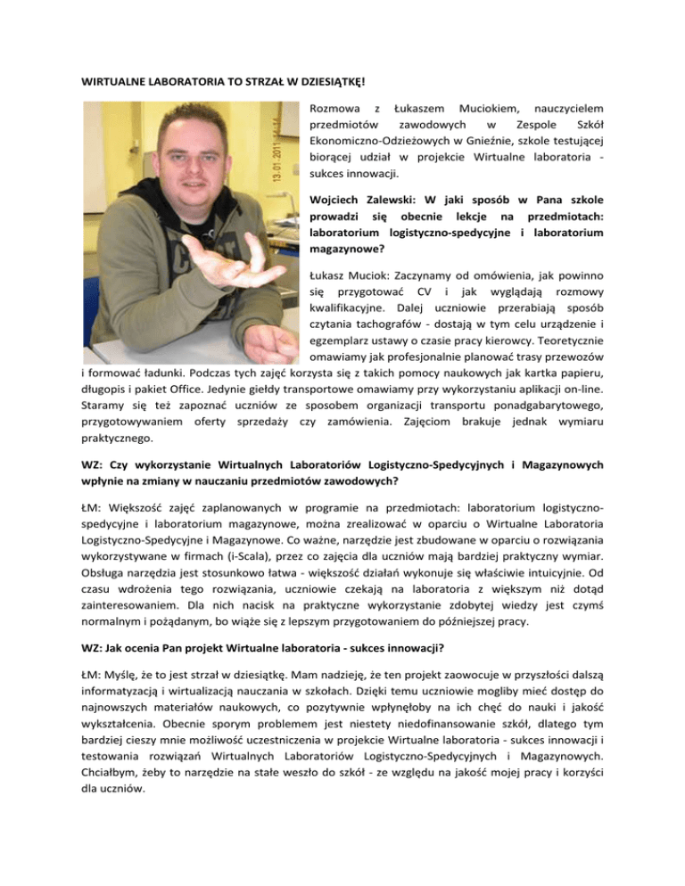 WIRTUALNE LABORATORIA TO STRZAŁ W DZIESIĄTKĘ! Rozmowa z Łukaszem Muciokiem, nauczycielem przedmiotów zawodowych w Zespole Szkół Ekonomiczno-Odzieżowych w Gnieźnie, szkole testującej biorącej udział w projekcie Wirtualne laboratoria sukces innowacji. Wojciech Zalewski: W jaki sposób w Pana szkole prowadzi się obecnie lekcje na przedmiotach: laboratorium logistyczno-spedycyjne i laboratorium magazynowe? Łukasz Muciok: Zaczynamy od omówienia, jak powinno się przygotować CV i jak wyglądają rozmowy kwalifikacyjne. Dalej uczniowie przerabiają sposób czytania tachografów - dostają w tym celu urządzenie i egzemplarz ustawy o czasie pracy kierowcy. Teoretycznie omawiamy jak profesjonalnie planować trasy przewozów i formować ładunki. Podczas tych zajęć korzysta się z takich pomocy naukowych jak kartka papieru, długopis i pakiet Office. Jedynie giełdy transportowe omawiamy przy wykorzystaniu aplikacji on-line. Staramy się też zapoznać uczniów ze sposobem organizacji transportu ponadgabarytowego, przygotowywaniem oferty sprzedaży czy zamówienia. Zajęciom brakuje jednak wymiaru praktycznego. WZ: Czy wykorzystanie Wirtualnych Laboratoriów Logistyczno-Spedycyjnych i Magazynowych wpłynie na zmiany w nauczaniu przedmiotów zawodowych? ŁM: Większość zajęć zaplanowanych w programie na przedmiotach: laboratorium logistycznospedycyjne i laboratorium magazynowe, można zrealizować w oparciu o Wirtualne Laboratoria Logistyczno-Spedycyjne i Magazynowe. Co ważne, narzędzie jest zbudowane w oparciu o rozwiązania wykorzystywane w firmach (i-Scala), przez co zajęcia dla uczniów mają bardziej praktyczny wymiar. Obsługa narzędzia jest stosunkowo łatwa - większość działań wykonuje się właściwie intuicyjnie. Od czasu wdrożenia tego rozwiązania, uczniowie czekają na laboratoria z większym niż dotąd zainteresowaniem. Dla nich nacisk na praktyczne wykorzystanie zdobytej wiedzy jest czymś normalnym i pożądanym, bo wiąże się z lepszym przygotowaniem do późniejszej pracy. WZ: Jak ocenia Pan projekt Wirtualne laboratoria - sukces innowacji? ŁM: Myślę, że to jest strzał w dziesiątkę. Mam nadzieję, że ten projekt zaowocuje w przyszłości dalszą informatyzacją i wirtualizacją nauczania w szkołach. Dzięki temu uczniowie mogliby mieć dostęp do najnowszych materiałów naukowych, co pozytywnie wpłynęłoby na ich chęć do nauki i jakość wykształcenia. Obecnie sporym problemem jest niestety niedofinansowanie szkół, dlatego tym bardziej cieszy mnie możliwość uczestniczenia w projekcie Wirtualne laboratoria - sukces innowacji i testowania rozwiązań Wirtualnych Laboratoriów Logistyczno-Spedycyjnych i Magazynowych. Chciałbym, żeby to narzędzie na stałe weszło do szkół - ze względu na jakość mojej pracy i korzyści dla uczniów. WZ: Jakie są zalety zastosowanej metody udostępniania Wirtualnych Laboratoriów przez Internet? ŁM: Na pewno niższe koszty. Nie musimy kupować drogiego sprzętu, wystarczą komputery już wykorzystywane w szkole. Dodatkowo współdzielenie materiałów naukowych z innymi szkołami jest tańsze, niż gdybyśmy musieli je zakupić w tradycyjnej formie i instalować na komputerach. Myślę, że metoda Wirtualnych Laboratoriów jest też na tyle elastyczna, że w przyszłości będzie można ją rozwijać w kierunku zacieśniania współpracy między szkołami. WZ: Na czym mogłaby polegać taka współpraca? ŁM: Dzięki łączności przez platformę Wirtualnych Laboratoriów można by było zwiększyć rywalizację między uczniami i skłonić ich do większego zaangażowania w naukę przedmiotu. Ułatwiłoby to również ocenę poziomu kształcenia w poszczególnych szkołach w sposób bardziej obiektywny, oparty na faktycznej wiedzy uczniów. Można by było zorganizować wspólne zajęcia - jedna szkoła przygotowałaby strukturę produkcji, druga zorganizowała transport, trzecia sprzedawała towar. W ten sposób uczniowie poznaliby problemy, z jakimi wiąże się współpraca z innymi działami czy firmami i to nie tylko o profilu logistycznym. Wirtualne Laboratoria stwarzają możliwość symulacji rzeczywistych problemów praktyki gospodarczej dla przedstawicieli różnych grup zawodowych. WZ: To znaczy, że widzi Pan zastosowanie metody Wirtualnych Laboratoriów na konkretnych zajęciach zawodowych? ŁM: Zastosowań może być bardzo wiele. Sam myślę choćby o zajęciach z zakresu rachunkowości czy bankowości, w których kształci się choćby przyszłego technika ekonomistę. Widziałbym pełną współpracę pomiędzy tym zawodem, a zawodem logistyka. Do utworzenia wirtualnej firmy wystarczyłoby nawet kilku techników, na przykład technik ekonomista (księgowość), informatyk (zaplecze informatyczne), handlowiec (marketing i sprzedaż) i spedytor (giełdy, trasy, mapy). Współpraca w ramach Wirtualnych Laboratoriów byłaby również szansą dla osób uczących się w ramach zawodów technicznych - można by było przy okazji takich zajęć ułożyć całą produkcję, wiele aspektów przećwiczyć, zintegrować szkoły, wymienić się poglądami i wspólnie rozwiązywać problemy różnych szkół. Ten projekt ma bardzo wiele zalet i zastosowań. WZ: Dyrekcja szkoły przychylnie patrzy na projekt? ŁM: W zasadzie projekt Wirtualne laboratoria - sukces innowacji to pierwsza innowacja pedagogiczna w naszym regionie. Fakt, że jako jedna z 49 szkół uczestniczymy w tak nowoczesnym i unikalnym w skali kraju projekcie, znacząco podnosi nasz prestiż wśród innych szkół w powiecie. Poza tym, co najważniejsze, wykorzystanie metody Wirtualnych Laboratoriów podnosi poziom wykształcenia w zawodzie technik logistyk przez co ten kierunek zyskuje na atrakcyjności. Dlatego dyrekcja szkoły jest zafascynowana projektem i zadowolona z jego postępów. Wszyscy widzimy ogromne korzyści, jakie mają dla nas Wirtualne Laboratoria. WZ: Co myśli Pan na temat sposobu organizacji proje