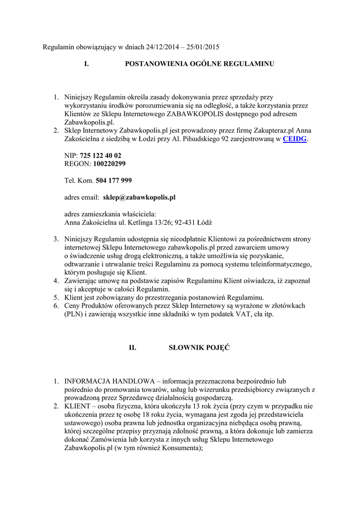 Regulamin obowiązujący w dniach 24/12/2014 – 25/01/2015 I. POSTANOWIENIA OGÓLNE REGULAMINU 1. Niniejszy Regulamin określa zasady dokonywania przez sprzedaży przy wykorzystaniu środków porozumiewania się na odległość, a także korzystania przez Klientów ze Sklepu Internetowego ZABAWKOPOLIS dostępnego pod adresem Zabawkopolis.pl. 2. Sklep Internetowy Zabawkopolis.pl jest prowadzony przez firmę Zakupteraz.pl Anna Zakościelna z siedzibą w Łodzi przy Al. Piłsudskiego 92 zarejestrowaną w CEIDG. NIP: 725 122 40 02 REGON: 100220299 Tel. Kom. 504 177 999 adres email: [email protected] adres zamieszkania właściciela: Anna Zakościelna ul. Ketlinga 13/26; 92-431 Łódź 3. Niniejszy Regulamin udostępnia się nieodpłatnie Klientowi za pośrednictwem strony internetowej Sklepu Internetowego zabawkopolis.pl przed zawarciem umowy o świadczenie usług drogą elektroniczną, a także umożliwia się pozyskanie, odtwarzanie i utrwalanie treści Regulaminu za pomocą systemu teleinformatycznego, którym posługuje się Klient. 4. Zawierając umowę na podstawie zapisów Regulaminu Klient oświadcza, iż zapoznał się i akceptuje w całości Regulamin. 5. Klient jest zobowiązany do przestrzegania postanowień Regulaminu. 6. Ceny Produktów oferowanych przez Sklep Internetowy są wyrażone w złotówkach (PLN) i zawierają wszystkie inne składniki w tym podatek VAT, cła itp. II. SŁOWNIK POJĘĆ 1. INFORMACJA HANDLOWA – informacja przeznaczona bezpośrednio lub pośrednio do promowania towarów, usług lub wizerunku przedsiębiorcy związanych z prowadzoną przez Sprzedawcę działalnością gospodarczą. 2. KLIENT – osoba fizyczna, która ukończyła 13 rok życia (przy czym w przypadku nie ukończenia przez tę osobę 18 roku życia, wymagana jest zgoda jej przedstawiciela ustawowego) osoba prawna lub jednostka organizacyjna niebędąca osobą prawną, której szczególne przepisy przyznają zdolność prawną, a która dokonuje lub zamierza dokonać Zamówienia lub korzysta z innych usług Sklepu Internetowego Zabawkopolis.pl (w tym również Konsumenta); 3. KONSUMENT - osoba fizyczna dokonująca czynności prawnej niezwiązanej bezpośrednio z jej działalnością gospodarczą lub zawodową; 4. PRODUKT – rzecz ruchoma lub usługa, której dotyczy umowa sprzedaży; 5. PRZEWOŹNIK - kurier, Poczta Polska S.A. lub inna firma współpracująca ze Sklepem Internetowym Zabawkopolis.pl w celu realizowania umowy zawartej z Klientem poprzez doręczanie przesyłek; 6. REGULAMIN – niniejszy Regulamin sprzedaży przy wykorzystaniu środków porozumiewania się na odległość oraz świadczenia usług drogą elektroniczną; w zakresie usług świadczonych drogą elektroniczną niniejszy Regulamin jest regulaminem, o którym mowa w art. 8 ustawy z dnia 18 lipca 2002 roku o świadczeniu usług drogą elektroniczną (Dz.U. z 2002 r. Nr 144, poz. 1204 z późn. zm.); 7. REJESTRACJA – jednorazowa czynność, polegająca na założeniu przez Klienta Konta Klienta, dokonana z wykorzystaniem panelu udostępnionego przez Sprzedawcę na stronie serwisu Sklepu Internetowego Zabawkopolis.pl. 8. SKLEP INTERNETOWY Zabawkopolis – serwis internetowy dostępny pod adresem Zabawkopolis.pl, za pośrednictwem którego Klient może złożyć Zamówienie na oferowane przez Sklep Internetowy Zabawkopolis.pl Produkty; 9. SYSTEM TELEINFORMATYCZNY – zespół współpracujących ze sobą urządzeń informatycznych i oprogramowania, zapewniający przetwarzanie i przechowywanie, a także wysyłanie i odbieranie danych poprzez sieci telekomunikacyjne za pomocą właściwego dla danego rodzaju sieci urządzenia końcowego w rozumieniu ustawy z dnia 16 lipca 2004 roku Prawo telekomunikacyjne (Dz.U. z 2000 r. Nr 73 poz. 852 z późn. zm.). 10. SPRZEDAWCA – przedsiębiorca prowadzący działalność gospodarczą pod firmą Zakupteraz.pl Anna Zakościelna, NIP: 725 122 40 02, REGON: 100220299, adres: 92-202 Łódź; Al. Piłsudskiego 92 11. UMOWA SPRZEDAŻY – umowa sprzedaży Produktów w rozumieniu ustawy Kodeks Cywilny, zawierana pomiędzy Sprzedawcą a Klientem, z wykorzystaniem środków porozumiewania się na odległość (w tym drogą telefoniczną); do zawarcia umowy sprzedaży dochodzi z chwilą otrzymania informacji o przyjęciu oferty złożonej przez Klienta; 12. USŁUGA – usługa świadczona przez Sprzedawcę drogą elektroniczną na zasadach określonych w Regulaminie oraz za pośrednictwem serwisu internetowego dostępnego pod adresem Zabawkopolis.pl 13. ZAMÓWIENIE – oświadczenie woli Klienta, zmierzające bezpośrednio do zawarcia Umowy sprzedaży Produktów na odległość za pośrednictwem Sklepu Internetowego Zabawkopolis.pl, określające rodzaj i liczbę Produktu traktowane przez Sprzedawcę jako oferta; III. RODZAJ I ZAKRES USŁUG ŚWIADCZONYCH DROGĄ ELEKTRONICZNĄ 1. SPRZEDAWCA świadczy za pośrednictwem Sklepu Internetowego usługę umożliwiającą Klientom składanie Zamówień dotyczących Produktów dostępnych w ramach Sklepu Internetowego i zawierania umów sprzedaży Produktów na odległość oraz udzielania Informacji Handlowych w zakresie Produktów dostępnych w Sklepie Internetowym Zabawkopolis.pl. 2. SPRZEDAWCA świadczy także usługę przesyłania Informacji Handlowej do Klientów, którzy wyrazili na to odrębną zgodę podczas zawierania umowy sprzedaży. IV. WARUNKI ŚWIADCZENIA USŁUG DORGĄ ELEKTRONICZNĄ 1. Rekomendowane wymagania techniczne niezbędne do współpracy z systemem teleinformatycznym, którym posługuje się SPRZEDAWCA są dla Klienta następujące: a. połączenie z siecią internet – minimalna prędkość przesyłu 10 Mb/s, b. przeglądarka internetowa umożliwiająca wyświetlanie na ekranie komputera dokumentów hipertekstowych (HTML) Mozilla Firefox v16; c. system antywirusowy. 2. Minimalne wymagania konfiguracyjne niezbędne do współpracy z systemem teleinformatycznym, którym posługuje się SPRZEDAWCA są dla Klienta następuj