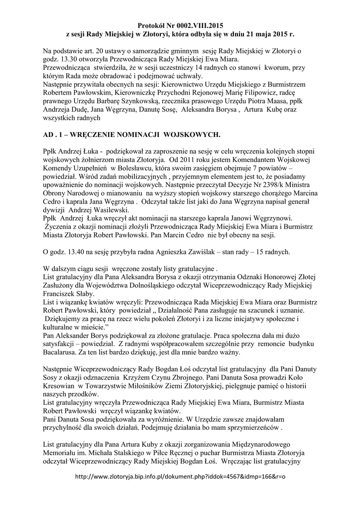 Protokół Nr 0002.VIII.2015 z sesji Rady Miejskiej w Złotoryi, która odbyła się w dniu 21 maja 2015 r. Na podstawie art. 20 ustawy o samorządzie gminnym sesję Rady Miejskiej w Złotoryi o godz. 13.30 otworzyła Przewodnicząca Rady Miejskiej Ewa Miara. Przewodnicząca stwierdziła, że w sesji uczestniczy 14 radnych co stanowi kworum, przy którym Rada może obradować i podejmować uchwały. Następnie przywitała obecnych na sesji: Kierownictwo Urzędu Miejskiego z Burmistrzem Robertem Pawłowskim, Kierowniczkę Przychodni Rejonowej Marię Filipowicz, radcę prawnego Urzędu Barbarę Szynkowską, rzecznika prasowego Urzędu Piotra Maasa, ppłk Andrzeja Dudę, Jana Węgrzyna, Danutę Sosę, Aleksandra Borysa , Artura Kubę oraz wszystkich radnych AD . 1 – WRĘCZENIE NOMINACJI WOJSKOWYCH. Ppłk Andrzej Łuka - podziękował za zaproszenie na sesję w celu wręczenia kolejnych stopni wojskowych żołnierzom miasta Złotoryja. Od 2011 roku jestem Komendantem Wojskowej Komendy Uzupełnień w Bolesławcu, która swoim zasięgiem obejmuje 7 powiatów – powiedział. Wśród zadań mobilizacyjnych , przyjemnym elementem jest to, że posiadamy upoważnienie do nominacji wojskowych. Następnie przeczytał Decyzje Nr 2398/k Ministra Obrony Narodowej o mianowaniu na wyższy stopień wojskowy starszego chorążego Marcina Cedro i kaprala Jana Węgrzyna . Odczytał także list jaki do Jana Węgrzyna napisał generał dywizji Andrzej Wasilewski. Ppłk Andrzej Łuka wręczył akt nominacji na starszego kaprala Janowi Węgrzynowi. Życzenia z okazji nominacji złożyli Przewodnicząca Rady Miejskiej Ewa Miara i Burmistrz Miasta Złotoryja Robert Pawłowski. Pan Marcin Cedro nie był obecny na sesji. O godz. 13.40 na sesję przybyła radna Agnieszka Zawiślak – stan rady – 15 radnych. W dalszym ciągu sesji wręczone zostały listy gratulacyjne . List gratulacyjny dla Pana Aleksandra Borysa z okazji otrzymania Odznaki Honorowej Złotej Zasłużony dla Województwa Dolnośląskiego odczytał Wiceprzewodniczący Rady Miejskiej Franciszek Słaby. List i wiązankę kwiatów wręczyli: Przewodnicząca Rada Miejskiej Ewa Miara oraz Burmistrz Robert Pawłowski, który powiedział „ Działalność Pana zasługuje na szacunek i uznanie. Dziękujemy za pracę na rzecz wielu pokoleń Złotoryi i za liczne inicjatywy społeczne i kulturalne w mieście.” Pan Aleksander Borys podziękował za złożone gratulacje. Praca społeczna dała mi dużo satysfakcji – powiedział. Z radnymi współpracowałem szczególnie przy remoncie budynku Bacalarusa. Za ten list bardzo dziękuję, jest dla mnie bardzo ważny. Następnie Wiceprzewodniczący Rady Bogdan Łoś odczytał list gratulacyjny dla Pani Danuty Sosy z okazji odznaczenia Krzyżem Czynu Zbrojnego. Pani Danuta Sosa prowadzi Koło Kresowian w Towarzystwie Miłośników Ziemi Złotoryjskiej, pielęgnuje pamięć o historii naszych przodków. List gratulacyjny wręczyła Przewodnicząca Rady Miejskiej Ewa Miara, Burmistrz Miasta Robert Pawłowski wręczył wiązankę kwiatów. Pani Danuta Sosa podziękowała za wyróżnienie. W Urzędzie zawsze znajdowałam przychylność dla swoich działań. Podejmuję działania bo mam sprzymierzeńców . List gratulacyjny dla Pana Artura Kuby z okazji zorganizowania Międzynarodowego Memoriału im. Michała Stalskiego w Piłce Ręcznej o puchar Burmistrza Miasta Złotoryja odczytał Wiceprzewodniczący Rady Miejskiej Bogdan Łoś. Wręczając list gratulacyjny http://www.zlotoryja.bip.info.pl/dokument.php?iddok=4567&idmp=166&r=o Protokół Nr 0002.VIII.2015 z sesji Rady Miejskiej w Złotoryi, która odbyła się w dniu 21 maja 2015 r. Burmistrz Miasta powiedział, że największym bogactwem Złotoryi są jego mieszkańcy. Mistrzostwa to była impreza na najwyższym poziomie, promująca złotoryjski sport a także nasze miasto. Wręczając wiązankę kwiatów, Przewodnicząca Rady Miejskiej Ewa Miara podziękowała za zorganizowanie imprezy na taką skalę. Niech realizacja Pana pasji życiowej, którą jest piłka ręczna, będzie źródłem satysfakcji. Pan Artur Kuba podziękował za wyróżnienie. Bardzo zależało mi, żeby wszyscy ci którzy przyjadą cieszyli się z przebywania w Złotoryi. Mieliśmy gości z Paryża, z Ukrainy i wszyscy byli zauroczeni naszym miastem. Radny Józef Banaszek pogratulował wyróżnionym mieszkańcom miasta a szczególnie członkom TMZZ. Pani Danuta Sosa zaprosiła radnych na Biesiadę Kresową w dniu 19 czerwca br. o godz. 18tej w ZOKiR. Będą występować zespoły ludowe, będzie prelekcja a także kresowy poczęstunek. Przystąpiono do dalszej realizacji porządku obrad. Protokół Nr 0002.VI.2015 z sesji Rady Miejskiej odbytej w dniu 30 kwietnia br. został przyjęty jednogłośnie - 15 radnych „za”. Przewodnicząca Rady Miejskiej Ewa Miara poinformowała, że Burmistrz Miasta wystąpił z wnioskiem o wycofanie z porządku obrad projektu uchwały w sprawie składu Rady Społecznej Przychodni Rejonowej. Do dnia sesji Wojewoda Dolnośląski nie wyznaczył swojego przedstawiciela do Rady Społecznej. Ponieważ kadencja obecnej Rady kończy się w czerwcu, uchwałę o nowym składzie Rady możemy podjąć na sesji w czerwcu br. Rada głosami : za – 15 przeciw - 0 wstrzymało się - 0 wyraziła na to zgodę. W związku z powyższym porządek obrad przestawia się następująco: 1. Wręczenie nominacji wojskowych. 2. Informacja Burmistrza Miasta Złotoryja z pracy w okresie między sesjami. 3. Wnioski, interpelacje i zapytania radnych. 4. Przychodnia Rejonowa w Złotoryi. Opieka Zdrowotna w mieście. 5. Podjęcie pakietu uchwał: - w sprawie zmian w budżecie Gminy Miejskiej Złotoryja na rok 2015, - w sprawie przystąpienia Gminy Miejskiej Złotoryja do Stowarzyszenia „Lokalna Grupa Działania Partnerstwo Kaczawskie”, - zmieniająca Uchwałę NR 0007.IV.22.2015 Rady Miejskiej w Złotoryi z dnia 29 stycznia 2015 r. w sprawie przystąpienia do opracowania planu strategi