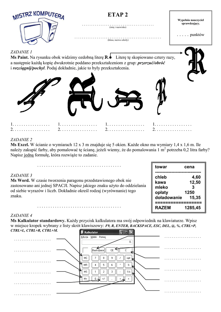 ETAP 2 Wypełnia nauczyciel sprawdzający. ....................................... (imię i nazwisko) . . . . . punktów ............................................... (klasa, nazwa szkoły) ZADANIE 1 Ms Paint. Na rysunku obok widzimy ozdobną literę R. Literę tę skopiowano cztery razy, a następnie każdą kopię dwukrotnie poddano przekształceniom z grup: przerzuć/obróć i rozciągnij/pochyl. Podaj dokładnie, jakie to były przekształcenia. 1. . . . . . . . . . . . . . . . . 2. . . . . . . . . . . . . . . . . 1. . . . . . . . . . . . . . . . . 2. . . . . . . . . . . . . . . . . 1. . . . . . . . . . . . . . . . . 2. . . . . . . . . . . . . . . . . 1. . . . . . . . . . . . . . . . . 2. . . . . . . . . . . . . . . . . ZADANIE 2 Ms Excel. W ścianie o wymiarach 12 x 3 m znajduje się 5 okien. Każde okno ma wymiary 1,4 x 1,6 m. Ile należy zakupić farby, aby pomalować tę ścianę, jeżeli wiemy, że do pomalowania 1 m2 potrzeba 0,2 litra farby? Napisz jedną formułę, która rozwiąże to zadanie. ...................................... ZADANIE 3 Ms Word. W czasie tworzenia paragonu przedstawionego obok nie zastosowano ani jednej SPACJI. Napisz jakiego znaku użyto do oddzielania od siebie wyrazów i liczb. Dokładnie określ rodzaj (wyrównanie) tego znaku. ...................................... towar cena ------------------------------chleb 4,60 kawa 12,50 mleko 3 opłaty 1250 doładowanie 15,35 ================== RAZEM 1285,45 ZADANIE 4 Ms Kalkulator standardowy. Każdy przycisk kalkulatora ma swój odpowiednik na klawiaturze. Wpisz w miejsce kropek wybrany z listy skrót klawiszowy: F9, R, ENTER, BACKSPACE, ESC, DEL, @, %, CTRL+P, CTRL+L, CTRL+R, CTRL+M. .................... .................... .................... .................... .................... .................... .................... .................... .................... .................... .................... .................... ZADANIE 5 Internet. W roku 1985 wprowadzono następujące domeny funkcjonalne niesponsorowane najwyższego poziomu: com ........................ mil ........................ edu ........................ net ........................ gov ........................ org ........................ Wpisz obok każdej domeny jej opis wybrany z następującej listy: edukacyjna, główna, komercyjna, milicyjna, muzyczna, rządowa, organizacyjna, sieciowa, wojskowa, wykonywalna, zawierająca etykietę. UWAGA! Opisów jest więcej niż domen. Niektóre są wpisane dla „zmyłki” i nie należy ich wybierać. ZADANIE 6 Ms Word. W czasie pracy w edytorze Word kursor myszy zmienia swój kształt. Dobierz operacje, jakie można wykonać przy pomocy kursora myszy, do odpowiedniego rysunku. ............................ ............................ ............................ ............................ ............................ ............................ ............................ ............................ Zmiana szerokości kolumny w tabeli. Obracanie rysunku. Edytowanie punktów linii krzywej. Zaznaczanie kolumny w tabeli. Zmiana szerokości rysunku. Zmiana położenia kursora tekstowego. Zaznaczanie pojedynczej komórki w tabeli. Przesuwanie rysunku w inne miejsce. ZADANIE 7 Internet. Aby dobre hasło spełniało swoje zadanie, musi spełniać pewne warunki. Janek Kowalski urodzony 12 maja 1998 roku, zamieszkały w Lublinie na ulicy Kwiatowej 77 m 33, tel. 81 525 33 00 próbuje wymyślić dobre hasło. Spośród poniższych propozycji przekreśl te, które nie spełniają warunków dobrego hasła. Obok przekreślonych haseł napisz dlaczego. Qwerty123 ................................................................. 1cX* ................................................................. acbraca ................................................................. t815253300! ................................................................. 19980512Du. ................................................................. misTkoM13! ................................................................. ZAQ!2wsx ................................................................. Password1! ................................................................. ZADANIE 8 Ms Excel. Każdy wykres utworzony w arkuszu kalkulacyjnym możemy modyfikować poprzez formatowanie jego elementów. Podpisz wskazane strzałkami elementy wykresu kolumnowego. Dobierz nazwy z poniższej listy. UWAGA! Nazw jest więcej niż elementów. Niektóre są wpisane dla „zmyłki” i nie należy ich wybierać. .................... .................... .................... .................... .................... .................... .................... .................... etykiety danych, legenda, obszar wykresu, tytuł wykresu, obszar kreślenia, linie siatki, tytuł osi kategorii, oś kategorii, tytuł osi wartości, tabela danych, oś wartości, ZADANIE 9 Ms Word. Word pozwala na drukowanie dokumentów tak, aby można było je zszyć w książeczkę. Na jednej kartce zadrukowanej dwustronnie wydrukuje się wtedy 4 strony dokumentu. Książeczka będzie miała 16 stron. Napisz, jakie strony dokumentu znajdą się na tej samej kartce, co strona nr 13. Wpisz numery stron dokumentu w miejsce kropek. I strona kartki str. ….. str. ….. II strona kartki str. ….. str. ….. ZADANIE 10 Internet. Google jest obecnie najpopularniejszą wyszukiwarką internetową. Spełnia ona również wiele innych funkcji (poza wyszukiwaniem adresów stron internetowych). Zaznacz symbolem te funkcje, które rzeczywiście pełni Google. wyszukuje obrazy na podstawie wpisanego opisu wyszukuje obrazy podobne do przesłanego obrazu wyszukuje na mapie podany adres (np. Lublin ul. Roztocze 14) oblicza wartość wpisanego wyrażenia matematycznego (np. 35*0,50-312) podaje prognozę pogody w wybranym mieście (np. pogoda Lublin) przelicza wartość waluty (np. 3,50 pln w dolarach amerykańskich) podaje repertuar kin (np. kina Warszawa) przelicza jednostk