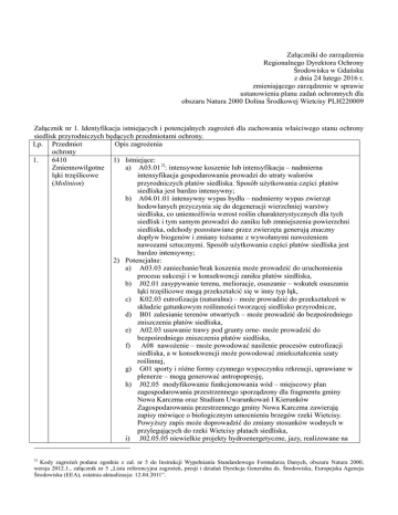 Załączniki do zarządzenia Regionalnego Dyrektora Ochrony Środowiska w Gdańsku z dnia 24 lutego 2016 r. zmieniającego zarządzenie w sprawie ustanowienia planu zadań ochronnych dla obszaru Natura 2000 Dolina Środkowej Wietcisy PLH220009 Załącznik nr 1. Identyfikacja istniejących i potencjalnych zagrożeń dla zachowania właściwego stanu ochrony siedlisk przyrodniczych będących przedmiotami ochrony. Lp. Przedmiot Opis zagrożenia ochrony 1. 6410 1) Istniejące: Zmiennowilgotne a) A03.01 2): intensywne koszenie lub intensyfikacja – nadmierna łąki trzęślicowe intensyfikacja gospodarowania prowadzi do utraty walorów (Molinion) przyrodniczych płatów siedliska. Sposób użytkowania części płatów siedliska jest bardzo intensywny; b) A04.01.01 intensywny wypas bydła – nadmierny wypas zwierząt hodowlanych przyczynia się do degeneracji wierzchniej warstwy siedliska, co uniemożliwia wzrost roślin charakterystycznych dla tych siedlisk i tym samym prowadzi do zaniku lub zmniejszenia powierzchni siedliska, odchody pozostawiane przez zwierzęta generują znaczny dopływ biogenów i zmiany tożsame z wywołanymi nawożeniem nawozami sztucznymi. Sposób użytkowania części płatów siedliska jest bardzo intensywny; 2) Potencjalne: a) A03.03 zaniechanie/brak koszenia może prowadzić do uruchomienia procesu sukcesji i w konsekwencji zaniku płatów siedliska, b) J02.01 zasypywanie terenu, melioracje, osuszanie – wskutek osuszania łąki trzęślicowe mogą przekształcić się w inny typ łąk, c) K02.03 eutrofizacja (naturalna) – może prowadzić do przekształceń w składzie gatunkowym roślinności tworzącej siedlisko przyrodnicze, d) B01 zalesianie terenów otwartych – może prowadzić do bezpośredniego zniszczenia płatów siedliska, e) A02.03 usuwanie trawy pod grunty orne- może prowadzić do bezpośredniego zniszczenia płatów siedliska, f) A08 nawożenie – może powodować nasilenie procesów eutrofizacji siedliska, a w konsekwencji może powodować zniekształcenia szaty roślinnej, g) G01 sporty i różne formy czynnego wypoczynku rekreacji, uprawiane w plenerze – mogą generować antropopresję, h) J02.05 modyfikowanie funkcjonowania wód – miejscowy plan zagospodarowania przestrzennego sporządzony dla fragmentu gminy Nowa Karczma oraz Studium Uwarunkowań I Kierunków Zagospodarowania przestrzennego gminy Nowa Karczma zawierają zapisy mówiące o biologicznym umocnieniu brzegów rzeki Wietcisy. Powyższy zapis może doprowadzić do zmiany stosunków wodnych w przylegających do rzeki Wietcisy płatach siedliska, i) J02.05.05 niewielkie projekty hydroenergetyczne, jazy, realizowane na Kody zagrożeń podane zgodnie z zał. nr 5 do Instrukcji Wypełniania Standardowego Formularza Danych, obszaru Natura 2000, wersja 2012.1., załącznik nr 5 „Lista referencyjna zagrożeń, presji i działań Dyrekcja Generalna ds. Środowiska, Europejska Agencja Środowiska (EEA), ostatnia aktualizacja: 12.04.2011”. 2) 2. 3. 7220 Źródliska wapienne ze zbiorowiskami Cratoneurion commutati 1) 2) 7230 Górskie i 1) nizinne torfowiska zasadowe o charakterze młak, turzycowisk i mechowisk 2) rzece Wietcisa, mogą prowadzić do zmiany stosunków wodnych w przylegających do rzeki Wietcisy płatach siedliska, j) H02.07 rozproszone zanieczyszczenie wód podziemnych z powodu terenów nieskanalizowanych - z powodu ścieków z gospodarstw domowych może nastąpić pogorszenie struktury i funkcji siedliska, k) E01.04 inne typy zabudowy – może prowadzić do bezpośredniego zniszczenia płatów siedliska. Istniejące: J02.01 zasypywanie terenu, melioracje, osuszanie – może prowadzić do zniszczenia lub degeneracji siedliska przyrodniczego; Potencjalne: a) K02.03 eutrofizacja (naturalna) – może prowadzić do zniekształceń szaty roślinnej siedliska przyrodniczego, b) K01.01 erozja – może prowadzić do pogorszenia stanu ochrony siedliska przyrodniczego, c) G05.01 wydeptywanie, nadmierne użytkowanie – może prowadzić do zniszczenia szaty roślinnej siedliska. Istniejące: a) A03.01 intensywne koszenie lub intensyfikacja –większość płatów siedliska jest użytkowana kośnie – intensywnie, warunkiem zachowania siedliska jest prowadzenie ekstensywnej gospodarki kośnej, b) A03.03 zaniechanie/brak koszenia - warunkiem zachowania siedliska jest prowadzenie ekstensywnej gospodarki kośnej, c) A04.01.01 intensywny wypas bydła – nadmierny wypas zwierząt hodowlanych oraz wydeptywanie przyczynia się do degradacji wierzchniej warstwy siedliska, co uniemożliwia wzrost roślin charakterystycznych dla tego siedliska i prowadzi do zaniku lub zmniejszenia powierzchni siedliska. Odchody pozostawione przez zwierzęta generują znaczny dopływ biogenów i zmiany tożsame z wywołanymi nawożeniem nawozami sztucznymi; Potencjalne: a) J02.01 zasypywanie terenu, melioracje, osuszanie – w płatach siedliska występują liczne rowy melioracyjne o charakterze odwadniającym, z których większość nie jest regularnie czyszczona, co doprowadziło do ich zarośnięcia i częściowej utraty funkcji odwadniającej (w związku z tym zagrożenie melioracjami uznano za potencjalne), b) C01.03 wydobywanie torfu – może powodować zniszczenie siedliska przyrodniczego, c) H02.06 rozproszone zanieczyszczenie wód podziemnych z powodu działalności związanej z rolnictwem i leśnictwem –wokół siedliska zlokalizowane są pola uprawne, spływ substancji biogennych z pól może powodować eutrofizację siedliska, d) B01 zalesianie terenów otwartych – może powodować bezpośrednie zniszczenie siedliska, e) A02.03 usuwanie trawy pod grunty orne – może powodować bezpośrednie zniszczenie siedliska, f) K02.01 zmiana składu gatunkowego (sukcesja) – może prowadzić do obniżenia parametru struktury i funkcji siedliska, w dalszej perspektywie do zaniku siedliska, g) A08 nawożenie /nawozy sztuczne – nawożenie gruntów znajdujących się w zlewni torfowiska mo