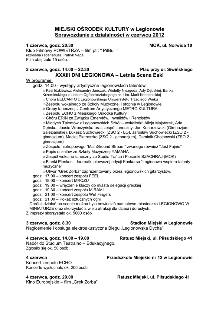 MIEJSKI OŚRODEK KULTURY w Legionowie Sprawozdanie z działalności w czerwcu 2012 1 czerwca, godz. 20.30 Klub Filmowy POWIETRZA – film pt.: " PitBull " MOK, ul. Norwida 10 reżyseria i scenariusz: Patryk Vega Film obejrzało 15 osób. 2 czerwca, godz. 14.00 – 22.30 Plac przy ul. Siwińskiego XXXIII DNI LEGIONOWA – Letnia Scena Eski W programie: godz. 14.00 - występy artystyczne legionowskich talentów: • Kasi Idzkiewicz, Aleksandry Janczak, Wioletty Niezgoda, Ady Dębskiej, Bartka Krzemińskiego z Liceum Ogólnokształcącego nr 1 im. Marii Konopnickiej • Chóru BELCANTO z Legionowskiego Uniwersytetu Trzeciego Wieku • Zespołu wokalnego ze Szkoły Muzycznej I stopnia w Legionowie • Grupy tanecznej z Centrum Artystycznego METRO KULTURA • Zespółu ECHO z Miejskiego Ośrodka Kultury • Chóru ERIN ze Związku Emerytów, Inwalidów i Rencistów • Młodych Talentów z Legionowskich Szkół – wokalistki: Alicja Majsterek, Ada Dębska, Joasia Wroczyńska oraz zespół taneczny: Jan Konarzewski (Gimnazjum Salezjańskie), Łukasz Suchowiecki (ZSO 2 - LO), Jarosław Suchowiecki (ZSO 2 gimnazjum), Maciej Pietraszko (ZSO 2 - gimnazjum), Dominik Chojnowski (ZSO 2 gimnazjum) • Zespołu hiphopowego “MainGround Stream” zwanego również “Jest Fajnie” • Popis uczniów ze Szkoły Muzycznej YAMAHA • Zespół wokalno taneczny ze Studia Tańca i Piosenki SZACHRAJ (MOK) • Blanki Pienkos – laureatki pierwszej edycji Konkursu “Legionowo wspiera talenty muzyczne” • Utwór “Grek Zorba” zaprezentowany przez legionowskich gitarzystów. godz. 17.00 – koncert zespołu FEEL godz. 18.00 – koncert MROZU godz. 19.00 – wręczenie kluczy do miasta delegacji greckiej godz. 19.30 – koncert zespołu MIRAMI godz. 21.00 – koncert zespołu Wet Fingers godz. 21.00 – Pokaz sztucznych ogni Oprócz działań na scenie można było odwiedzić namiotowe miasteczko LEGIONOWO W MINIATURZE oraz skorzystać z wielu atrakcji dla dzieci i dorosłych. Z imprezy skorzystało ok. 5000 osób 3 czerwca, godz. 8.30 Stadion Miejski w Legionowie Nagłośnienie i obsługa elektroakustyczna Biegu „Legionowska Dycha” 4 czerwca, godz. 14.00 – 19.00 Ratusz Miejski, ul. Piłsudskiego 41 Nabór do Studium Teatralno – Edukacyjnego. Zgłosiło się ok. 50 osób. 4 czerwca Koncert zespołu ECHO Przedszkole Miejskie nr 12 w Legionowie Koncertu wysłuchało ok. 200 osób. 4 czerwca, godz. 20.00 Kino Europejskie – film „Grek Zorba” Ratusz Miejski, ul. Piłsudskiego 41 Film obejrzało ok. 30 osób. 5 czerwca, godz. 18.00 MOK, ul. Targowa 65 Dyplomy Szkoły Muzycznej I stopnia Państwa E.P. Gubałów Koncertu wysłuchało ok. 25 osób. 5 czerwca, godz. 20.00 Ratusz Miejski, ul. Piłsudskiego 41 Kino Europejskie – film „Pociągi pod specjalnym nadzorem” Film obejrzało ok. 50 os. 6 czerwca, godz. 18.00 MOK, ul. Targowa 65 II cześć dyplomów Szkoły Muzycznej I stopnia Państwa E.P. Gubałów Koncertu wysłuchało ok. 25 osób. 6 czerwca, godz. 20.00 Kino Europejskie – film „Lecą żurawie” Ratusz Miejski, ul. Piłsudskiego 41 Film obejrzało ok. 35 osób. 7czerwca, godz. 12.30 Ratusz Miejski, ul. Piłsudskiego 41 Obsługa elektroakustyczna stacji Bożego Ciała przy Ratuszu Miejskim 7 czerwca, godz. 20.00 Kino Europejskie – film „Rejs” Ratusz Miejski, ul. Piłsudskiego 41 Film obejrzało ok. 50 osób. 8 czerwca, godz. 20.30 MOK, ul. Norwida 10 Klub Filmowy POWIETRZA – film pt.: "Pochowajcie mnie pod podłogą" reżyseria i scenariusz: Siejgiej Śnieżkin Film obejrzało 15 osób. 8 czerwca – 1 lipca Strefa Kibica – EURO 2012 Ratusz Miejski, ul. Piłsudskiego 41 8 czerwca – 1 lipca Współorganizacja Strefy Kibica – EURO 2012 10 czerwca, godz. 16.00 Spektakl „Legionowo Grekom” Rynek Miejski Park Solidarności Współorganizacja z Fundacją CZAS KULTURY Spektakl obejrzało ok. 150 osób 10 czerwca, godz. 11.00 Warsztaty gitarowe – inst. Waldemar Lewandowski MOK, ul. Norwida 10 W warsztatach uczestniczyło 10 osób. 10 czerwca, godz. 12.00 MOK, ul. Targowa 65 Przedstawienie teatralne pt.: "Opowieść starego zegara" dla dzieci z sekcji MOK Teatrzyk obejrzało 30 dzieci. 10 czerwca, godz. 20.00 MOK, ul. Targowa 65 Salon Artystyczny im. Fryderyka Chopina – Koncert „Kwiaty polskie”, zakończenie sezonu muzycznego. wystąpili: • Ryszard Morka – bas • Marii Silvy – fortepian • Agnieszka Kozłowska – sopran • Adama Kasperczyka W programie wykonano utwory St. Moniuszki, I.J. Paderewskiego, M. Karłowicza, St. Niewiadomskiego, Z. Noskowskiego, T. Matlakiewicza i L. Różyckiego. Koncertu wysłuchało 60 osób. 10 czerwca, godz. 20.00 Otwarcie wystawy malarstwa Damiana Boguszewskiego MOK, ul. Targowa 65 Wystawę obejrzało 25 osób. 12 czerwca, godz. 9.00 Film dla dzieci z sekcji MOKUŚ Film obejrzało 20 osób. Galeria Sztuki Ratusz, ul. Piłsudskiego 41 12 czerwca, godz. 19.00 Galeria Sztuki Ratusz, ul. Piłsudskiego 41 Otwarcie wystawy podopiecznych sekcji plastycznych MOK z pracowni prowadzonych przez Barbarę Retmaniak i Małgorzatę Mirkowską – Grabowską. W wernisażu uczestniczyło ok. 200 osób. 13 czerwca, Białołęcki Ośrodek Kultury w Warszawie Udział solistów zespołu ECHO (sekcja MOK- inst.. Marek Pawłowicz) w Konkursie Wokalnym ZŁOTA ÓSEMKA. 14 czerwca, godz. 10.00 - 14.00 MOK, ul. Targowa 65 DZIEŃ RODZINY- dmuchańce i zabawy dla dzieci w wieku 2-6 lat z sekcji MOK. W imprezie uczestniczyło 70 osób. 15 czerwca, godz. 12.00 MOK, ul. Targowa 65 Zakończenie roku kulturalnego sekcji MOKUŚ W uroczystości uczestniczyło 40 osób. 15 czerwca, godz. 20.30 Klub Filmowy POWIETRZA – film pt.: "Notting hill" MOK, ul. Norwida 10 reżyseria: Roger Michell scenariusz: Richard Curtis Film obejrzało 15 osób. 19 czerwca, godz. 11.00 Ratusz Miejski, ul. Piłsudskiego 41 Teatr NIKT MNIE NIE CHCE – spektakl teatralny „Pigmalion dla Szkoły Podstawowej nr 2 Spektakl obejrzało 200 osób. 20 czerwca, godz. 17.00 Ratusz Miejski,