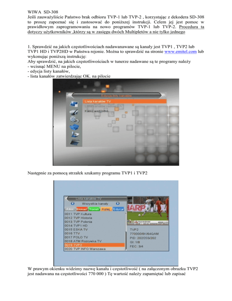 WIWA SD-308 Jeśli zauważyliście Państwo brak odbioru TVP-1 lub TVP-2 , korzystając z dekodera SD-308 to proszę zapoznać się i zastosować do poniższej instrukcji. Celem jej jest pomoc w prawidłowym zaprogramowaniu na nowo programów TVP-1 lub TVP-2. Procedura ta dotyczy użytkowników ,którzy są w zasięgu dwóch Multipletów a nie tylko jednego 1. Sprawdzić na jakich częstotliwościach nadawanawane są kanały jest TVP1 , TVP2 lub TVP1 HD i TVP2HD w Państwa rejonie. Można to sprawdzić na stronie www.emitel.com lub wykonując poniższą instrukcję: Aby sprawdzić, na jakich częstotliwościach w tunerze nadawane są te programy należy - wcisnąć MENU na pilocie, - edycja listy kanałów, - lista kanałów zatwierdzając OK. na pilocie Następnie za pomocą strzałek szukamy programu TVP1 i TVP2 W prawym okienku widzimy nazwę kanału i częstotliwość ( na załączonym obrazku TVP2 jest nadawana na częstotliwości 770 000 ) Tę wartość należy zapamiętać lub zapisać Następnie odnajdujemy częstotliwość programu TVP1 Tak jak poprzednio w prawym okienku widzimy nazwę programu i częstotliwość TVP1 746000 ( zapamiętujemy lub zapisujemy tę wartość) 2. Znając już częstotliwości TVP1 i TVP2 włączamy automatyczne wyszukiwanie kanałów Po zakończeniu automatycznego wyszukiwania przechodzimy do „Edycji list kanałów” Usuwamy wszystkie kanały HD. Aby to uczynić na zaznaczonym kanale HD naciskamy niebieski przycisk „EDYCJA” Następnie ponownie niebieski przycisk na pilocie „USUŃ” i potwierdzamy OK Jak usuniemy już wszystkie kanały HD wciskamy na pilocie przycisk „EXIT” a na ekranie telewizora wyświetli się pytanie czy zapisać nową listę – potwierdzamy Następnym krokiem jest „wyszukiwanie ręczne” kanałów Wprowadzany wcześniej odnalezione częstotliwości . W naszym przypadku 746.000 Zatwierdzamy przyciskiem „SZUKAJ” . Następnie powtarzamy skanowanie ręczne dla drugiej znalezionej częstotliwości ( w tym konkretnym przypadku :770.000) Po zeskanowaniu mamy dostęp do wszystkich kanałów wraz z TVP1 i TVP2