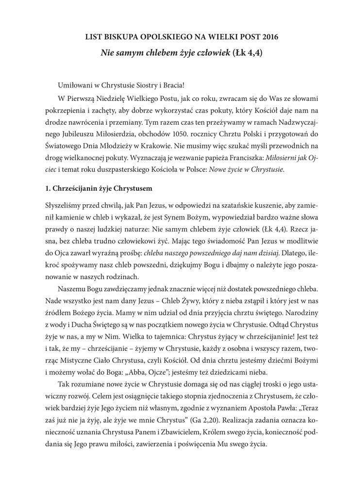 LIST BISKUPA OPOLSKIEGO NA WIELKI POST 2016 Nie samym chlebem żyje człowiek (Łk 4,4) Umiłowani w Chrystusie Siostry i Bracia! W Pierwszą Niedzielę Wielkiego Postu, jak co roku, zwracam się do Was ze słowami pokrzepienia i zachęty, aby dobrze wykorzystać czas pokuty, który Kościół daje nam na drodze nawrócenia i przemiany. Tym razem czas ten przeżywamy w ramach Nadzwyczajnego Jubileuszu Miłosierdzia, obchodów 1050. rocznicy Chrztu Polski i przygotowań do Światowego Dnia Młodzieży w Krakowie. Nie musimy więc szukać myśli przewodnich na drogę wielkanocnej pokuty. Wyznaczają je wezwanie papieża Franciszka: Miłosierni jak Ojciec i temat roku duszpasterskiego Kościoła w Polsce: Nowe życie w Chrystusie. 1. Chrześcijanin żyje Chrystusem Słyszeliśmy przed chwilą, jak Pan Jezus, w odpowiedzi na szatańskie kuszenie, aby zamienił kamienie w chleb i wykazał, że jest Synem Bożym, wypowiedział bardzo ważne słowa prawdy o naszej ludzkiej naturze: Nie samym chlebem żyje człowiek (Łk 4,4). Rzecz jasna, bez chleba trudno człowiekowi żyć. Mając tego świadomość Pan Jezus w modlitwie do Ojca zawarł wyraźną prośbę: chleba naszego powszedniego daj nam dzisiaj. Dlatego, ilekroć spożywamy nasz chleb powszedni, dziękujmy Bogu i dbajmy o należyte jego poszanowanie w naszych rodzinach. Naszemu Bogu zawdzięczamy jednak znacznie więcej niż dostatek powszedniego chleba. Nade wszystko jest nam dany Jezus – Chleb Żywy, który z nieba zstąpił i który jest w nas źródłem Bożego życia. Mamy w nim udział od dnia przyjęcia chrztu świętego. Narodziny z wody i Ducha Świętego są w nas początkiem nowego życia w Chrystusie. Odtąd Chrystus żyje w nas, a my w Nim. Wielka to tajemnica: Chrystus żyjący w chrześcijaninie! Jest też i tak, że my – chrześcijanie – żyjemy w Chrystusie, każdy z osobna i wszyscy razem, tworząc Mistyczne Ciało Chrystusa, czyli Kościół. Od dnia chrztu jesteśmy dziećmi Bożymi i możemy wołać do Boga: „Abba, Ojcze”; jesteśmy też dziedzicami nieba. Tak rozumiane nowe życie w Chrystusie domaga się od nas ciągłej troski o jego ustawiczny rozwój. Celem jest osiągnięcie takiego stopnia zjednoczenia z Chrystusem, że człowiek bardziej żyje Jego życiem niż własnym, zgodnie z wyznaniem Apostoła Pawła: „Teraz zaś już nie ja żyję, ale żyje we mnie Chrystus” (Ga 2,20). Realizacja zadania oznacza konieczność uznania Chrystusa Panem i Zbawicielem, Królem swego życia, konieczność poddania się Jego prawu miłości, zawierzenia i poświęcenia Mu swego życia. W tym dziele nie jesteśmy zdani tylko na nasze słabe ludzkie siły. Od dnia chrztu wiedzie nas przez życie Boży Duch. „On dokonuje dzieła oczyszczenia z wszystkiego, co człowieka ‘szpeci’, ‘z tego, co jest trudne’; On leczy najgłębsze nawet rany ludzkiej egzystencji. On zamienia wewnętrzny nieurodzaj dusz w urodzajne pola łaski i świętości. To, ‘co jest oporne – nakłania’, to, co jest ’oziębłe – rozgrzewa’, to, co ’zbłąkane – sprowadza’ na drogi zbawienia” (Jan Paweł II, Dominum et Vivificantem 67). Dlatego św. Paweł nalega: „Mając życie od Ducha, do Ducha się też stosujmy” (Ga 5,25). To jest nasze podstawowe zadanie: podążać za natchnieniami i poruszeniami Ducha Świętego. Zadanie nie jest łatwe. Dlatego trzeba mieć szczególne nabożeństwo do Ducha Świętego. Mam na myśli modlitwę do Ducha Świętego i karmienie się słowem Bożem, którego Duch Święty jest natchnieniem. W tej perspektywie zyskują na znaczeniu słowa dzisiejszej aklamacji przed Ewangelią: Nie samym chlebem żyje człowiek, lecz każdym słowem, które pochodzi z ust Bożych. Lektura Pisma Świętego oznacza karmienie się Bożym Duchem, a gdy – jak Maryja – rozważamy słowo Boże w swoim sercu, pozwalamy Duchowi Świętemu działać. On przekuwa w nas słowo Boże w czyn, w Boże dzieło i życie. 2. Chrześcijanin wyrzeka się zła Jak wynika ze słów, które szafarz sakramentu chrztu kieruje do rodziców przed chrztem dziecka, troska o ustawiczny rozwój życia Bożego domaga się od nas troski o zachowanie go od skażenia grzechem. Stąd konieczność radykalnego wyrzeczenia się zła: grzechu, okazji do zła i szatana. W pierwszych wiekach katechumeni wyrzekali się szatana, jego tzw. pompy, czyli szatańskiego pijaru, jego sposobów uwodzenia i jego aniołów-posłańców. Chodziło o odwrócenie się od szatana i jego świata złych wartości i pseudowartości, czyli pozorów dobra, którymi „zwodzi całą zamieszkałą ziemię” (por. Ap 12,9). Za takie uznawano kult bożków pogańskich, przedstawienia teatralne i cyrkowe niegodne chrześcijan (Tertulian), pożądliwość ciała, światowe ambicje, chciwość, żądzę władzy, arogancję, wyniosłość i pychę (Augustyn), czyli – we współczesnym przekładzie – „to wszystko, co prowadzi do grzechu” lub w nim utwierdza. Mam na myśli zwłaszcza wady, czyli złe skłonności, które zaciemniają sumienie i nakłaniają do zła. Wady te grupuje się wokół siedmiu grzechów nazywanymi „głównymi”. Są nimi: pycha, chciwość, zazdrość, nieczystość, łakomstwo, gniew, lenistwo lub znużenie duchowe (Kompendium KKK 398). Równie niebezpieczne dla życia Bożego w nas są tzw. struktury grzechu. Rozumie się przez nie sytuacje społeczne lub instytucje przeciwne prawu Bożemu, które są wyrazem i skutkiem grzechów osobistych, ale przez swe rozprzestrzenienie czy legalizację w danej społeczności skłaniają nas do ulegania złu. 2 Jeśli więc mamy uchronić życie Boże w nas od skażenia grzechem, musimy ciągle podejmować walkę ze swymi słabościami i grzechami, także z wszelkimi pokusami i mocami ciemności. W stale ponawianych przyrzeczeniach chrzcielnych trzeba odczytywać konkretne zobowiązania i mobilizować się do solidnej pracy nad sobą. Musimy strzec wolności, do której „wyswobodz
