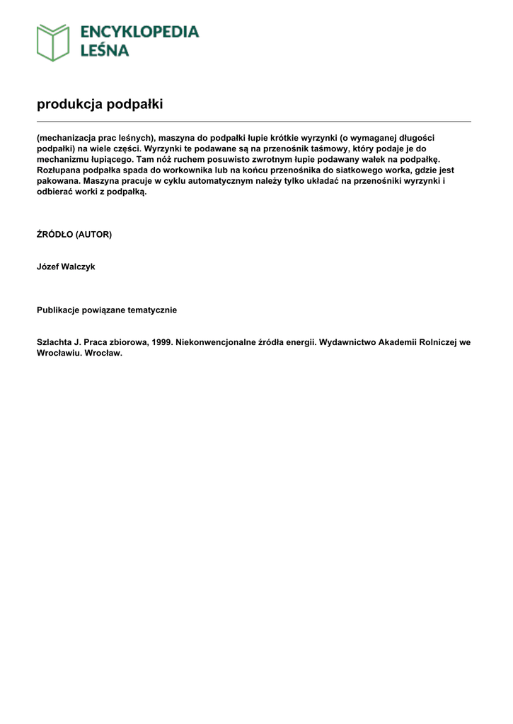 produkcja podpałki (mechanizacja prac leśnych), maszyna do podpałki łupie krótkie wyrzynki (o wymaganej długości podpałki) na wiele części. Wyrzynki te podawane są na przenośnik taśmowy, który podaje je do mechanizmu łupiącego. Tam nóż ruchem posuwisto zwrotnym łupie podawany wałek na podpałkę. Rozłupana podpałka spada do workownika lub na końcu przenośnika do siatkowego worka, gdzie jest pakowana. Maszyna pracuje w cyklu automatycznym należy tylko układać na przenośniki wyrzynki i odbierać worki z podpałką. ŹRÓDŁO (AUTOR) Józef Walczyk Publikacje powiązane tematycznie Szlachta J. Praca zbiorowa, 1999. Niekonwencjonalne źródła energii. Wydawnictwo Akademii Rolniczej we Wrocławiu. Wrocław.