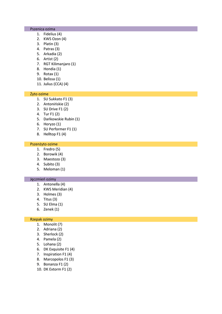 Pszenica ozima 1. Fidelius (4) 2. KWS Ozon (4) 3. Platin (3) 4. Patras (3) 5. Arkadia (2) 6. Artist (2) 7. RGT Kilimanjaro (1) 8. Hondia (1) 9. Rotax (1) 10. Belissa (1) 11. Julius (CCA) (4) Żyto ozime 1. SU Sukkato F1 (3) 2. Antonińskie (2) 3. SU Drive F1 (2) 4. Tur F1 (2) 5. Dańkowskie Rubin (1) 6. Horyzo (1) 7. SU Performer F1 (1) 8. Helltop F1 (4) Pszenżyto ozime 1. Fredro (5) 2. Borowik (4) 3. Maestozo (3) 4. Subito (3) 5. Meloman (1) Jęczmień ozimy 1. Antonella (4) 2. KWS Meridian (4) 3. Holmes (3) 4. Titus (3) 5. SU Elma (1) 6. Zenek (1) Rzepak ozimy 1. Monolit (7) 2. Adriana (2) 3. Sherlock (2) 4. Pamela (2) 5. Lohana (2) 6. DK Exquisite F1 (4) 7. Inspiration F1 (4) 8. Marcopolos F1 (3) 9. Bonanza F1 (2) 10. DK Extorm F1 (2) Pszenica jara 1. Kandela (5) 2. Mandaryna (2) 3. Goplana (1) 4. Harenda (1) 5. Serenada (1) Jęczmień jary 1. Argento (2) 2. KWS Irina (2) 3. KWS Orphelia (2) 4. Penguin (2) 5. Soldo (2) 6. KWS Fabienne (1) 7. Rubaszek (1) 8. Salome (1) Owies 1. 2. 3. 4. 5. 6. Breton (8) Bingo (7) Zuch (7) Arden (6) Amant (2) Nawigator (1) Ziemniak jadalny Odmiany bardzo wczesne 1. Denar (6) 2. Lord (6) 3. Arielle (4) 4. Impala (3) Odmiany wczesne 1. Owacja (6) 2. Vineta (6) 3. Michalina (5) 4. Gwiazda (3) 5. Altesse (1) 6. Ignacy (1) Odmiany średniowczesne 1. Satina (6) 2. Tajfun (6) 3. Oberon (3) 4. Finezja (2) 5. Laskara (1) Odmiany średniopóźne i późne 1. Mondeo (4) 2. Jelly (1) Ziemniak skrobiowy Odmiany średniowczesne 1. Zuzanna (6) 2. Jubilat (1) Odmiany średniopóźne i późne 1. Kuras (6) 2. Inwestor (1) Groch siewny – odmiany ogólnoużytkowe 1. Akord (2) 2. Arwena (2) 3. Audit (2) 4. Batuta (2) 5. Mecenas (2) 6. Tarchalska (2) Groch siewny – odmiany pastewne 1. Hubal (1) 2. Turnia (1) Łubin żółty 1. Baryt (2) 2. Bursztyn (2) 3. Mister (2) Łubin wąskolistny 1. Graf (R) 2. Rumba (R) 3. Tango (R) 4. Koral (R) 5. Bolero (R) Soja 1. 2. 3. 4. Augusta (R) Abelina (R) Aligotor (R) Sultana (CCA) (R) W nawiasach podano okres, w którym odmiana znajdowała się na LOZ (liczba lat) (R) – odmiana wstępnie rekomendowana na podstawie wyników plonowania z 2016 roku