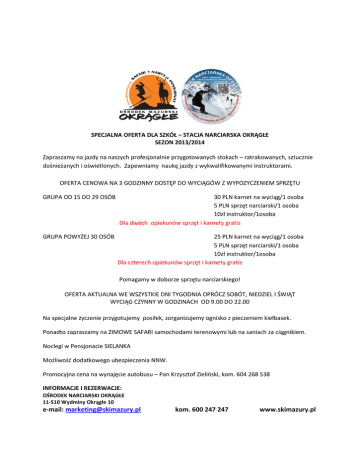 SPECJALNA OFERTA DLA SZKÓŁ – STACJA NARCIARSKA OKRĄGŁE SEZON 2013/2014 Zapraszamy na jazdy na naszych profesjonalnie przygotowanych stokach – ratrakowanych, sztucznie dośnieżanych i oświetlonych. Zapewniamy naukę jazdy z wykwalifikowanymi instruktorami. OFERTA CENOWA NA 3 GODZINNY DOSTĘP DO WYCIĄGÓW Z WYPOZYCZENIEM SPRZĘTU GRUPA OD 15 DO 29 OSÓB 30 PLN karnet na wyciąg/1 osoba 5 PLN sprzęt narciarski/1 osoba 10zł instruktor/1osoba Dla dwóch opiekunów sprzęt i karnety gratis GRUPA POWYŻEJ 30 OSÓB 25 PLN karnet na wyciąg/1 osoba 5 PLN sprzęt narciarski/1 osoba 10zł instruktor/1osoba Dla czterech opiekunów sprzęt i karnety gratis Pomagamy w doborze sprzętu narciarskiego! OFERTA AKTUALNA WE WSZYSTKIE DNI TYGODNIA OPRÓCZ SOBÓT, NIEDZIEL I ŚWIĄT WYCIĄG CZYNNY W GODZINACH OD 9.00 DO 22.00 Na specjalne życzenie przygotujemy posiłek, zorganizujemy ognisko z pieczeniem kiełbasek. Ponadto zapraszamy na ZIMOWE SAFARI samochodami terenowymi lub na saniach za ciągnikiem. Noclegi w Pensjonacie SIELANKA Możliwość dodatkowego ubezpieczenia NNW. Promocyjna cena na wynajęcie autobusu – Pan Krzysztof Zieliński, kom. 604 268 538 INFORMACJE I REZERWACJE: OŚRODEK NARCIARSKI OKRĄGŁE 11-510 Wydminy Okrągłe 10 e-mail: [email protected] kom. 600 247 247 www.skimazury.pl
