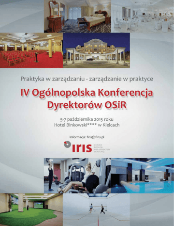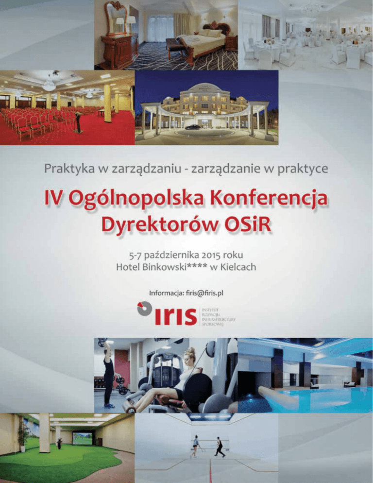 Praktycy w zarządzaniu polecają IV OGÓLNOPOLSKIE FORUM DYREKTORÓW OSiR Z aufałam Fundacji IRIS bo wg mnie rozwój menedżera to przede wszystkim umiejętne czerpanie z doświadczeń własnych oraz środowiska a także zaangażowanie osobiste w poszukiwanie wiarygodnych źródeł wiedzy Renata Popek | Stołeczne Centrum Sportu AKTYWNA WARSZAWA Z aproszenie na kolejną edycję Ogólnopolskiego Forum Dyrektorów OSiR, jako kontynuację konferencji w pierwotnym wydaniu przyjęliśmy z radością i spokojem o właściwą organizację, odpowiedni program forum oraz dobór prelegentów najlepszych w swojej dziedzinie. Zdzisław Hołysz | wiceprezes Zarządu, Miejski Ośrodek Sportu i Rekreacji „Bystrzyca” w Lublinie Sp. z o.o. Z kilkunastoletniego doświadczenia w branży, wiem, że najwięcej można nauczyć się na spotkaniach, gdzie spotykają się praktycy z danej branży, taką platformą jest Ogólnopolskie Forum Dyrektorów OSiR organizowane przez Instytut Rozwoju Infrastruktury Sportowej. Dlatego, mam nadzieję, że spotkamy się już niebawem. Zapraszam. Piotr Gąszcz | wicedyrektor ICSiR w Józefowie. ZARZĄDZANIE W PRAKTYCE – PRAKTYKA W ZARZĄDZANIU Godzinowy program Forum 5.10.20015poniedziałek od 14.00 zakwaterowanie gości 16.00 – 16.30 rejestracja uczestników 16.30 – 18.30panel dyskusyjny „bez krawata” – „Planowanie strategii marketingowej w oparciu o naszą obecność w Internecie”: 1.planuj strategię marketingową – analizuj potrzeby firmy, scharakteryzuj grupę docelową 2. poznaj siłę Social Media 19.00kolacja 6.10.2015 wtorek 9.00 – 9.30 rejestracja uczestników 9.30 – 11.30debata z udziałem przedstawiciela Ministerstwa Sportu i Turystyki, samorządu miasta Kielce (relacje miasto-kluby sportowe, obecne programy ministerialne) moderator: Piotr Bubela, prezes zarządu Instytut Rozwoju Infrastruktury Sportowej 11.30 – 11.45 przerwa kawowa 11.45 – 13.45pływalnia, park wodny, aquapark w strukturze przychodów ośrodka sportu – analiza oraz dyskusja, moderator: Piotr Gąszcz, wicedyrektor ICSiR w Józefowie 14.00 – 15.00obiad 15.00 – 17.00jak dobrze rozpocząć przygotowania do inwestycji i z sukcesem ją zakończyć – debata z udziałem stron w procesie inwestycyjnym (wykonawca/podwykonawca/ inwestor – gmina/ośrodek sportu 17.00 – 18.30źródła finansowania działań sportowych wraz z praktycznymi aspektami współpracy z samorządami (dobre praktyki), prelegent: Grzegorz Orłowski, kierownik Centrum Funduszy Europejskich i Współpracy Międzynarodowej Wyższej Szkoły Administracji Publicznej w Białymstoku, partner Perfect – Project Sp. z o. o. 19.00bankiet 7.10.2015 środa 9.30 – 11.30Zarządzanie i utrzymanie obiektów sportowych przez organizacje zewnętrzne – model holenderski i portugalski. 11.30 – 11.45przerwa kawowa 11.45 – 12.30zarządzanie ośrodkiem sportu zorganizowanym jako jednostka sektora finansów publicznych w formie jednostki budżetowej, prelegent Grzegorz Gutkowski, Uczelnia Łazarskiego 12.30 – 12.45zakończenie i podsumowanie IV Ogólnopolskiego Forum Dyrektorów 13.00 – 14.00obiad i wyjazd uczestników Organizator zastrzega sobie prawo do zmiany programu Forum o czym będzie niezwłocznie informował. III Ogólnopolskie Forum Dyrektorów OSiR relacja z 2014 roku W dniach 6–8 października br. odbyła się kolejna edycja Forum Dyrektorów OSiR. Podobnie jak w ubiegłym roku, III Ogólnopolskie Forum Dyrektorów OSiR uczestników gościł Hotel Willa Port w Ostródzie. W ciągu 3 dni 10 prelegentów przedstawiało niemal setce menedżerów ośrodków sportu praktyczne rozwiązania usprawniające zarządzanie obiektami sportowymi w Polsce. Ponad 11 godzin wykładów i debat oraz niezliczone godziny spędzone W na kuluarowych dyskusjach i wymianie poglądów potwierdzają konieczność stworzenia stałej platformy wymiany doświadczeń w myśl idei „Zarządzanie w praktyce, praktyka w zarządzaniu”. tych obiektów. To z kolei stawia w niezbyt stotnym elementem programu była debata komfortowej sytuacji menedżerów, sytuując ich o rozwoju infrastruktury sportowej w Polsce między młotem misji a kowadłem komercji. „Ośrodki sportu – wyzwania i oczekiwania oza zajęciami merytorycznymi był także na jutro”, w której głównymi prelegentami czas na rekreację w formie II Mistrzostw byli: Remigiusz Ludwig, Zastępca Dyrektora Dyrektorów OSiR w Grach Barowych. Trzeba Departamentu Infrastruktury Sportowej przyznać, że poziom sportowy przerósł Ministerstwa Sportu i Turystyki, Zdzisław najśmielsze oczekiwania. Szczególną uwagę Hołysz, Prezes Zarządu Miejskiego Ośrodka skupiły rozgrywki w piłkarzykach, gdzie Sportu i Rekreacji „Bystrzyca” w Lublinie oraz po emocjonującym finale (8:7) zwycięstwo Kamil Kukułka, założyciel i Główny Konsultant odniosła drużyna w składzie: Marcin Sport Innovation, firmy konsultingowej Zmitrowicz (dyrektor Kozienickiego Centrum wyspecjalizowanej w komercjalizacji aren Rekreacji i Sportu) i Leszek Wojtyna (kierownik sportowych oraz w projektach naming rights Kozienickiego Centrum Rekreacji i Sportu). (praw do nazwy) i sponsoringowych. dartach zaś triumfował Grzegorz ak dobrane grono ekspertów, a zarazem Płuciennik, kierownik Ośrodka Sportu praktyków, było gwarantem rozbudzenia i Rekreacji w Janikowie. Do zwycięzców trafiły ożywionej dyskusji poprzez poruszanie tematów okolicznościowe puchary, jak i nagrody: piłki najbardziej nurtujących obecnych na sali adidas BRAZUCA. menedżerów. Główną tezą przeprowadzonej orum zostało bardzo wysoko ocenione przez debaty była obecna sytuacja menedżerów uczestników za nienaganną organizację, zarządzających obiektami sportowymi w Polsce, jak i poziom merytoryczny. Mamy nadzieję, które w większości są jednostkami samorządu że spotkamy się na kolejnych wydarzeniach terytorialnego. Z jednej strony trwa, na ogromną organizowanych przez Instytut Rozwoju skalę