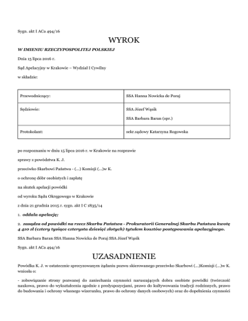 Sygn. akt I ACa 494/16 WYROK W IMIENIU RZECZYPOSPOLITEJ POLSKIEJ Dnia 15 lipca 2016 r. Sąd Apelacyjny w Krakowie – Wydział I Cywilny w składzie: Przewodniczący: SSA Hanna Nowicka de Poraj Sędziowie: SSA Józef Wąsik SSA Barbara Baran (spr.) Protokolant: sekr.sądowy Katarzyna Rogowska po rozpoznaniu w dniu 15 lipca 2016 r. w Krakowie na rozprawie sprawy z powództwa K. J. przeciwko Skarbowi Państwa - (...) Komisji (...)w K. o ochronę dóbr osobistych i zapłatę na skutek apelacji powódki od wyroku Sądu Okręgowego w Krakowie z dnia 21 grudnia 2015 r. sygn. akt I C 1835/14 1. oddala apelację; 2. zasądza od powódki na rzecz Skarbu Państwa - Prokuratorii Generalnej Skarbu Państwa kwotę 4 410 zł (cztery tysiące czterysta dziesięć złotych) tytułem kosztów postępowania apelacyjnego. SSA Barbara Baran SSA Hanna Nowicka de Poraj SSA Józef Wąsik Sygn. akt I ACa 494/16 UZASADNIENIE Powódka K. J. w ostatecznie sprecyzowanym żądaniu pozwu skierowanego przeciwko Skarbowi (...)Komisji (...)w K. wniosła o: - zobowiązanie strony pozwanej do zaniechania czynności naruszających dobra osobiste powódki (twórczość naukowa, prawo do wykształcenia zgodnie z predyspozycjami, prawo do kultywowania tradycji rodzinnych, prawo do budowania i ochrony własnego wizerunku, prawo do ochrony danych osobowych) oraz do dopełnienia czynności potrzebnych do usunięcia skutków naruszenia poprzez zmianę przyznanej punktacji na egzaminie maturalnym z dnia 27 czerwca 2014 r. z biologii (poziom rozszerzony) w ten sposób, że (...) Komisja (...) w K. zweryfikuje wynik egzaminu powódki poprzez przyznanie powódce dodatkowo po jednym punkcie przy ocenie zadań 11, 15, 17 i 34, łącznie wynik egzaminu ustalając na 80%, - zobowiązanie strony pozwanej do wydania nowego świadectwa maturalnego powódki o treści tożsamej z treścią dotychczasowego świadectwa, z wyjątkiem fragmentu od słów „uzyskała w części pisemnej egzaminu z przedmiotów dodatkowych biologia poziom rozszerzony – 73%”, które w nowym świadectwie przyjmą brzmienie: „uzyskała w części pisemnej egzaminu z przedmiotów dodatkowych biologa poziom rozszerzony – 80%”, - zobowiązanie strony pozwanej do zaniechania czynności naruszającej dobra osobiste powódki („prawo do dysponowania swoimi danymi osobowymi”, „prawo do ochrony wizerunku”) poprzez zaprzestanie udostępniania informacji o osobie powódki, arkuszy jej pracy egzaminacyjnej lub ich kopii zawierających informacje dotyczące powódki w sposób, który powoduje dalsze bezprawne udostępnianie tych dokumentów i zawartych w nich danych osobom trzecim, - zasądzenie od strony pozwanej na rzecz powódki kosztów procesu. W dniu 11 grudnia 2015 r. powódka rozszerzyła żądanie pozwu żądając zapłaty kwoty 32 500 zł z ustawowymi odsetkami, podając, że jest to roszczenie odszkodowawcze na podstawie art. 24 § 2 k.c. a wskazana kwota stanowi zapłacone przez powódkę czesne za studia. Zaskarżonym wyrokiem Sąd Okręgowy w Krakowie oddalił powództwo i zasądził od powódki na rzecz Prokuratorii Generalnej Skarbu Państwa kwotę 2 760 zł tytułem zwrotu kosztów zastępstwa procesowego. Jako okoliczności bezsporne wskazał sąd, iż powódka była uczennicą Liceum (...)im. (...) S. K. w K.. W dniu 12 maja 2014 r. przystąpiła do egzaminu maturalnego z biologii – poziom rozszerzony. W dniu 27 czerwca 2014 r. otrzymała od Dyrektora (...) Komisji (...) w K. L. G. informację o wynikach w/w egzaminu z biologii, w której wskazano, iż z części pisemnej otrzymała 73% punktów. Wobec powyższego, mimo stosunkowo wysokiego wyniku egzaminu maturalnego, powódka nie została przyjęta na uczelnię, w której zamierzała podjąć naukę – chodziło o Wydział (...) (...) J. w K. na kierunku lekarsko-dentystycznym, bowiem w roku akademickim 2014/2015 limit punktów niezbędnych do przyjęcia na tę uczelnię był o 1 % wyższy. Ostatecznie z dniem 1 października 2014 r. powódka podjęła odpłatne studia na w/w kierunku na Uniwersytecie J.. Powódka zapłaciła za studia opłatę w łącznej kwocie 32 500 zł. Ponadto Sąd Okręgowy ustalił , że powódka jest obecnie studentką drugiego roku (...)Wydział (...). Jej pisemna praca maturalna z biologii została oceniona w sposób przewidziany prawem, z zastosowaniem przyjętego przez (...)Komisję (...) w W. sposobu rozwiązywania zadań i schematem punktowania z maja 2014r., zawartym w oficjalnym dokumencie (...) pt. „Egzamin (...)poziom rozszerzony, Rozwiązania zadań i schemat punktowania, maj 2014”. Procedury związane z pracami maturalnymi i przeprowadzaniem w tym zakresie egzaminów uregulowane są w ustawie z 7 września 1991 r. o systemie oświaty wraz z zapisami rozporządzenia Ministra Edukacji Narodowej z 30 kwietnia 2007 r. w sprawie warunków i sposobu oceniania, klasyfikowania i promowania uczniów i słuchaczy oraz przeprowadzania sprawdzianów i egzaminów w szkołach publicznych. Osoby zakwalifikowane do poprawy prac maturalnych są specjalistami w danej dziedzinie, przeszły stosowne szkolenia i egzaminy. Schemat oceniania i tzw. klucz są opracowywane przez zespoły specjalistów, w tym z udziałem pracowników wyższych uczelni. W całym kraju stosowane są jednolite kryteria oceniania prac i są one upublicznione na stronie (...). Po uzyskaniu informacji o wynikach egzaminu maturalnego z biologii powódka zwróciła się do (...)Komisji (...) w K. o uzyskanie wglądu do swojego arkusza egzaminacyjnego, przy czym – podczas przeglądania pracy pod kierunkiem egzaminatora – nie mogła ona zgodnie z obowiązującymi procedurami czynić żadnych notatek ani kopii. Po przeprowadzonej analizie treści odpowiedzi powódka doszła do przekonania, że oceniający jej pracę popełnili błędy, prowadzące do wypaczenia wyniku egzaminu, nie przyznając jej dodatkowych 4 punktów. Powódka miała nieograniczony czasowo dostęp do swojej pracy a następnie 