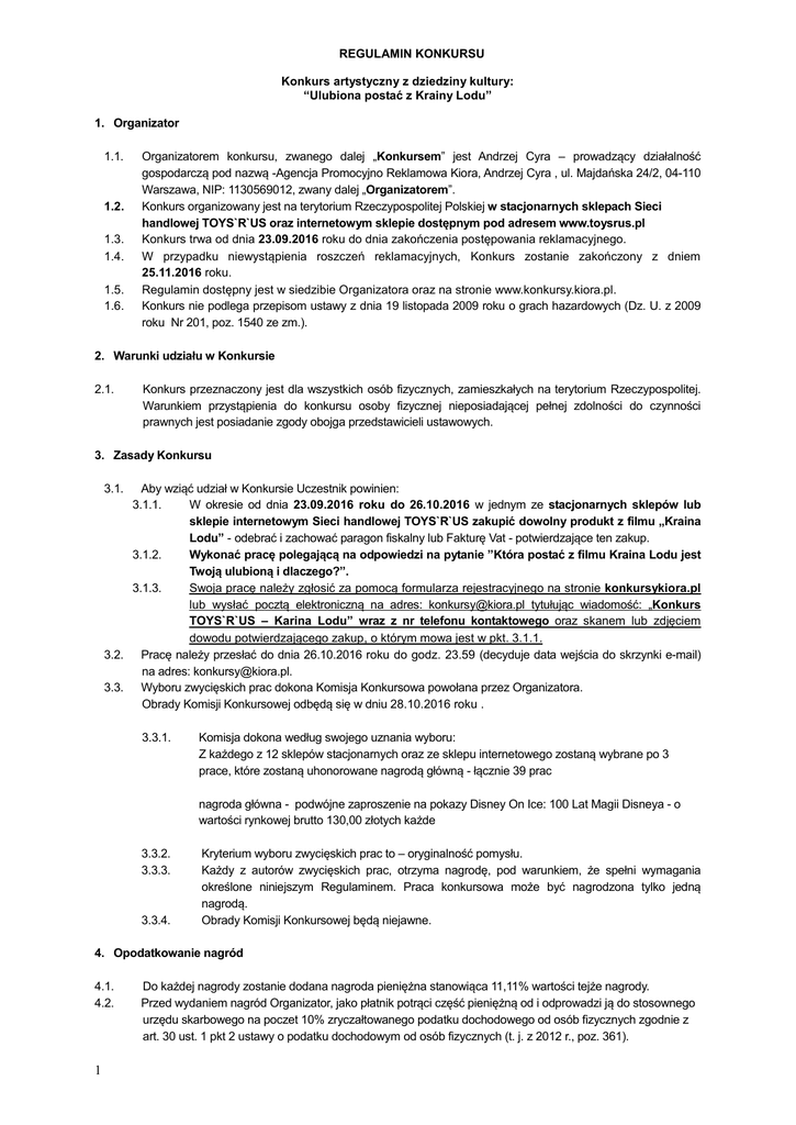 REGULAMIN KONKURSU Konkurs artystyczny z dziedziny kultury: “Ulubiona postać z Krainy Lodu” 1. Organizator 1.1. 1.2. 1.3. 1.4. 1.5. 1.6. Organizatorem konkursu, zwanego dalej „Konkursem” jest Andrzej Cyra – prowadzący działalność gospodarczą pod nazwą -Agencja Promocyjno Reklamowa Kiora, Andrzej Cyra , ul. Majdańska 24/2, 04-110 Warszawa, NIP: 1130569012, zwany dalej „Organizatorem”. Konkurs organizowany jest na terytorium Rzeczypospolitej Polskiej w stacjonarnych sklepach Sieci handlowej TOYS`R`US oraz internetowym sklepie dostępnym pod adresem www.toysrus.pl Konkurs trwa od dnia 23.09.2016 roku do dnia zakończenia postępowania reklamacyjnego. W przypadku niewystąpienia roszczeń reklamacyjnych, Konkurs zostanie zakończony z dniem 25.11.2016 roku. Regulamin dostępny jest w siedzibie Organizatora oraz na stronie www.konkursy.kiora.pl. Konkurs nie podlega przepisom ustawy z dnia 19 listopada 2009 roku o grach hazardowych (Dz. U. z 2009 roku Nr 201, poz. 1540 ze zm.). 2. Warunki udziału w Konkursie 2.1. Konkurs przeznaczony jest dla wszystkich osób fizycznych, zamieszkałych na terytorium Rzeczypospolitej. Warunkiem przystąpienia do konkursu osoby fizycznej nieposiadającej pełnej zdolności do czynności prawnych jest posiadanie zgody obojga przedstawicieli ustawowych. 3. Zasady Konkursu Aby wziąć udział w Konkursie Uczestnik powinien: 3.1.1. W okresie od dnia 23.09.2016 roku do 26.10.2016 w jednym ze stacjonarnych sklepów lub sklepie internetowym Sieci handlowej TOYS`R`US zakupić dowolny produkt z filmu „Kraina Lodu” - odebrać i zachować paragon fiskalny lub Fakturę Vat - potwierdzające ten zakup. 3.1.2. Wykonać pracę polegającą na odpowiedzi na pytanie ”Która postać z filmu Kraina Lodu jest Twoją ulubioną i dlaczego?”. 3.1.3. Swoja pracę należy zgłosić za pomocą formularza rejestracyjnego na stronie konkursykiora.pl lub wysłać pocztą elektroniczną na adres: [email protected] tytułując wiadomość: „Konkurs TOYS`R`US – Karina Lodu” wraz z nr telefonu kontaktowego oraz skanem lub zdjęciem dowodu potwierdzającego zakup, o którym mowa jest w pkt. 3.1.1. 3.2. Pracę należy przesłać do dnia 26.10.2016 roku do godz. 23.59 (decyduje data wejścia do skrzynki e-mail) na adres: [email protected]. 3.3. Wyboru zwycięskich prac dokona Komisja Konkursowa powołana przez Organizatora. Obrady Komisji Konkursowej odbędą się w dniu 28.10.2016 roku . 3.1. 3.3.1. Komisja dokona według swojego uznania wyboru: Z każdego z 12 sklepów stacjonarnych oraz ze sklepu internetowego zostaną wybrane po 3 prace, które zostaną uhonorowane nagrodą główną - łącznie 39 prac nagroda główna - podwójne zaproszenie na pokazy Disney On Ice: 100 Lat Magii Disneya - o wartości rynkowej brutto 130,00 złotych każde 3.3.2. 3.3.3. 3.3.4. Kryterium wyboru zwycięskich prac to – oryginalność pomysłu. Każdy z autorów zwycięskich prac, otrzyma nagrodę, pod warunkiem, że spełni wymagania określone niniejszym Regulaminem. Praca konkursowa może być nagrodzona tylko jedną nagrodą. Obrady Komisji Konkursowej będą niejawne. 4. Opodatkowanie nagród 4.1. 4.2. 1 Do każdej nagrody zostanie dodana nagroda pieniężna stanowiąca 11,11% wartości tejże nagrody. Przed wydaniem nagród Organizator, jako płatnik potrąci część pieniężną od i odprowadzi ją do stosownego urzędu skarbowego na poczet 10% zryczałtowanego podatku dochodowego od osób fizycznych zgodnie z art. 30 ust. 1 pkt 2 ustawy o podatku dochodowym od osób fizycznych (t. j. z 2012 r., poz. 361). 5. Ochrona danych osobowych 5.1. Administratorem danych osobowych zgromadzonych w związku z organizacją Programu jest Organizator, tj. Andrzej Cyra działający pod nazwą Agencja Promocyjno Reklamowa KIORA z siedzibą w Warszawie przy ul. Majdańskiej 24 lok. 2. Dane, o których mowa będą przetwarzane wyłącznie w celach przedmiotowo związanych z przeprowadzeniem Konkursu, w szczególności na potrzeby umożliwienia Uczestnikowi udziału w Konkursie, wydania nagród zwycięzcom i rozpatrywania ewentualnych reklamacji. (t.j. Dz. U. z 2002 roku Nr 101, poz. 926 ze zm.). Podanie danych osobowych oraz udzielenie zgody na ich przetwarzanie w celach przedmiotowo związanych z Konkursem jest dobrowolne ale niezbędne dla wzięcia udziału w Konkursie. 6. Odbiór nagrody 6.1. 6.2. 6.3. Organizator zawiadomi zwycięzców Konkursu o wygranej najpóźniej do dnia 31.10.2016 roku. Zawiadomienie ze strony Organizatora nastąpi drogą telefoniczną, listem poleconym lub listem elektronicznym. Nagrody zostaną wysłane lub wydane Laureatom do dnia 04.11.2016 roku przez Organizatora, po wcześniejszym uzgodnieniu ze zwycięzcą formy przekazania. Laureatom nie przysługuje prawo żądania wymiany nagród na inne nagrody rzeczowe lub pieniężne. Laureaci Konkursu nie mogą przenieść prawa do uzyskania Nagrody na osoby trzecie. 7. Reklamacje 7.1. Uczestnikowi przysługuje prawo wnoszenia reklamacji do dnia 16.11.2016 roku dotyczących zasad przeprowadzenia Konkursu z podaniem w szczególności swojego imienia i nazwiska, adresu, zakresu żądania oraz rodzaju naruszenia regulaminu Konkursu. Reklamacja musi zostać wysłana listem poleconym na adres Agencja Promocyjno – Reklamowa KIORA, 04-110 Warszawa , ul. Majdańska 24/2. Niniejszy Regulamin podlega ochronie prawa autorskiego. Wszelkie prawa do niniejszego regulaminu przysługują Agencji Promocyjno - Reklamowej Kiora. Publikowanie oraz rozpowszechnianie niniejszego regulaminu wymaga pisemnej zgody Agencji Promocyjno Reklamowej Kiora. 2