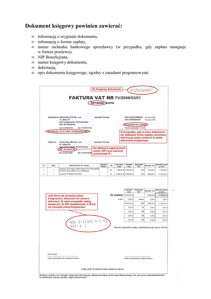 Dokument księgowy powinien zawierać: • • • • • • • informację o oryginale dokumentu, informację o formie zapłaty, numer rachunku bankowego sprzedawcy (w przypadku, gdy zapłata następuje w formie przelewu), NIP Beneficjenta, numer księgowy dokumentu, dekretację, opis dokumentu księgowego, zgodny z zasadami programowymi. Opis dokumentu księgowego powinien zawierać: • • • • • • • • • nazwę (tytuł) projektu wynikającą z umowy o dofinansowanie, datę zawarcia i numer umowy o dofinansowanie, opis związku wydatku z zawartą umową o dofinansowanie, informację o współfinansowaniu wydatku z Europejskiego Funduszu Rozwoju Regionalnego, dekretację, numer księgowy, informację o poprawności formalnej i merytorycznej, adnotację o sposobie zapłaty (w przypadku, gdy powyższe nie wynika z dokumentu księgowego), na fakturach wyrażonych w walucie obcej należy dodatkowo wskazać kurs waluty zastosowany przez bank dokonujący płatności w dniu jej dokonania. Opis dokumentów księgowych dotyczący poszczególnych Działań PO IG wskazany jest w treści umowy o dofinansowanie. Opis dokumentów księgowych musi być umieszczony na oryginale dokumentów. Dokumentację dostarczaną do RIF należy obustronnie poświadczyć "za zgodność z oryginałem". Poświadczenie dokumentacji "od strony … do strony …" dopuszczalne jest jedynie w przypadku, gdy dokumentacja posiada własną numerację stron.