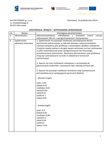 ALLTER POWER sp. z o.o. ul. Chałubińskiego 8 00-613 Warszawa Warszawa, 13 października 2014 r SPECYFIKACJA SPRZĘTU – WYPOSAŻENIE LAORATORIUM Lp. 1. Nazwa Mineralizator. 2. Spektrometr absorpcji atomowej Wymagane parametry/opis Jednostanowiskowy, mikrofalowy z zestawem trzech naczyń teflonowych 100 ml, z oprogramowaniem i komputerem. 1. Spektrometr ma posiadać możliwość zainstalowania dwóch atomizerów jednocześnie, w zakresie dostawy należy przewidzieć również kompletny piec grafitowy z zamkniętym układem chłodzenia. Przejście między jednym a drugim typem atomizacji ma być realizowane w pełni automatycznie przez oprogramowanie bez fizycznego przemieszczania atomizerów. Atomizery płomieniowy i piec grafitowy mają być zainstalowane na stałe w oddzielnych komorach pomiarowych. 2. Aparat ma mieć możliwość rozbudowy o przystawkę do generowania wodorków i oznaczania rtęci metodą zimnych par. 3. Aparat ma posiadać możliwość określania niżej wymienionych pierwiastków przy następujących granicach detekcji. - płomień (mg/l): selen 0.01 kobalt 0.01 molibden 0.02 wanad 0.06 nikiel 0.01 wolfram 1 żelazo 0.01 - kuweta (ug/l): selen 0.3 kobalt 0.02 molibden 0.08 wanad 0.1 nikiel 0.04 wolfram żelazo 0.01 1 4. Podstawowe wymagania techniczne dla spektrometru: - minimum 6-pozycyjny zmieniacz lamp z automatyczną adjustacją, z 6oma niezależnymi zasilaczami lamp, z rozpoznawaniem lamp kodowanych lub jedna lampa emitująca ciągłe źródło promieniowania - dwuwiązkowy układ optyczny z podwójnym monochromatorem o dyspersji liniowej nie gorszej niż 0,5nm/mm z szerokopasmowym powielaczem w zakresie 190-900 nm lub dla aparatów z jedną lampą emitująca ciągłe źródło promieniowania - podwójny monochromator - komputerowo sterowane wybieranie długości fali z automatycznym wyszukiwaniem pików a dla aparatów z lampami katodowymi dodatkowo z doborem szerokości spektralnej w zakresie 0,2; 0,5; 1,0 nm - 2 korekcje tła: zmodyfikowana elektronicznie 200 Hz lampa D2 w obu komorach pomiarowych, dodatkowo korekcja tła Zeemana w kuwecie grafitowej, możliwość pracy w trybie mieszanej korekcji tła a aparatów z jedną lampą emitująca ciągłe źródło promieniowania korekcja metodą referencyjnych pikseli w obu technikach - możliwość zainstalowania przystawki do generowania wodorków w prawej lub lewej komorze pomiarowej - komputerowy system programowania i kontroli przepływu gazów z automatyczną optymalizacją stechiometrii płomienia - palnik tytanowy 50 mm do pracy z wszystkimi rodzajami płomienia - oprogramowanie PC w polskiej wersji językowej komunikujące się ze spektrometrem przez port USB - piec grafitowy z max temp co najmniej 3000 C, z optyczną kontrolą temperatury, wbudowaną kamerą telewizyjną do podglądu wnętrza kuwety, automatycznym podajnikiem prób na 60 pozycji, z automatyczną optymalizacją programu temperaturowego pieca - w zestawie ponadto: kompresor powietrza, 10 kuwet grafitowych o przedłużonej trwałości, reduktor do acetylenu, reduktor do argonu, reduktor do podtlenku azotu, 8 lamp kodowanych lub jedna lampa ksenonowa dla aparatów z jedną lampą emitująca ciągłe źródło promieniowania, 1000 naczynek do autosamplera, 10 rurek kapilarnych/wężyków do autosamplera, śruba mikrometryczna do regulacji kulki rozpryskowej lub automat. 3. Miernik wieloparametrowy 1. Wersja przenośna. 2. Wyposażony w elektrody do pomiaru temperatury, pH, potencjału REDOX i przewodności. 3. Przystosowany do wykonywania pomiarów w ściekach i osadach. 2 4. Demineralizator wody 1. Urządzenie dedykowane do analiz śladowych - jakość 0,1 mikrosiemensa, wydajność minimalna 7l/h 2. Demineralizator ma być wyposażony w sterownik mikroprocesorowy z wyświetlaczem graficznym i klawiaturą umożliwiającą ustawienie parametrów pracy. Wyświetlane powinny być następujące parametry: - przewodność i temperatura wody oczyszczonej z możliwością wyboru wyświetlanej jednostki μS/cm lub MΩ/cm z kompensacją temperatury lub bez - ikony informujące o stanie pracy urządzenia (płukanie/produkcja wody UP/napełnienie zbiornika) - komunikaty alarmowe takie jak (uszkodzenie czujnika temperatury, uszkodzenie czujnika przewodności, uszkodzenie pakietu UP) - komunikaty ostrzegawcze (brak wody na zasilaniu, przepalenie bezpiecznika elektrozaworów, konieczność wymiany filtrów wstępnych, konieczność wymiany pakietu ze złożem jonowymiennym) - komunikat o przekroczeniu zadanej przewodności - komunikat o konieczności przeglądu serwisowego - data oraz czas rzeczywisty 5. Wagosuszarka 6. Dygestorium 7. Kolorymetr Dopuszczalna masa próbki - powyżej 50g Dokładność – 1 mg Dygestorium z blatem z litej ceramiki o szerokości 1200 mm, z wykładką komory z ceramiki wielkogabarytowej z zlewem, armaturą wody, szafką podblatową wentylowaną do przechowywania chemikaliów, z elektronicznym czujnikiem przepływu powietrza. Podstawowe wymagania dla kolorymetru: Titrator - przystosowany do pracy z gotowymi testami fotometrycznymi - dostosowany do pracy z kuwetami 1 i 5 cm - zakres spektralny od 190 do 1100nm Podstawowe wymagania dla titratora: 8. - dedykowany do oznaczeń kwasowości, zasadowości i chlorków - możliwość współpracy z komputerem celem analizy i archiwizacji danych pomiarowych – dostawa winna obejmować oprogramowanie wraz z kablem 9. Pipeta automatyczna Zmienna objętość do 10 ml 3