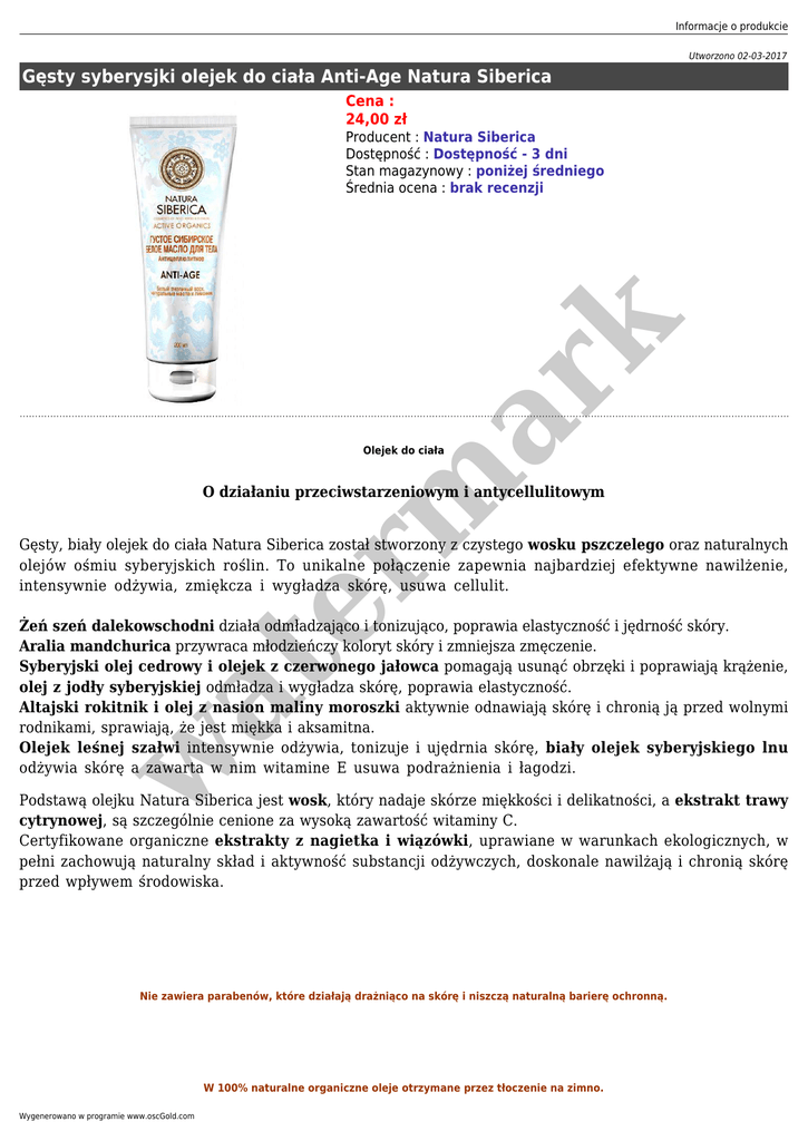 Informacje o produkcie Utworzono 02-03-2017 Gęsty syberysjki olejek do ciała Anti-Age Natura Siberica Cena : 24,00 zł er m ar k Producent : Natura Siberica Dostępność : Dostępność - 3 dni Stan magazynowy : poniżej średniego Średnia ocena : brak recenzji Olejek do ciała O działaniu przeciwstarzeniowym i antycellulitowym Gęsty, biały olejek do ciała Natura Siberica został stworzony z czystego wosku pszczelego oraz naturalnych olejów ośmiu syberyjskich roślin. To unikalne połączenie zapewnia najbardziej efektywne nawilżenie, intensywnie odżywia, zmiękcza i wygładza skórę, usuwa cellulit. w at Żeń szeń dalekowschodni działa odmładzająco i tonizująco, poprawia elastyczność i jędrność skóry. Aralia mandchurica przywraca młodzieńczy koloryt skóry i zmniejsza zmęczenie. Syberyjski olej cedrowy i olejek z czerwonego jałowca pomagają usunąć obrzęki i poprawiają krążenie, olej z jodły syberyjskiej odmładza i wygładza skórę, poprawia elastyczność. Altajski rokitnik i olej z nasion maliny moroszki aktywnie odnawiają skórę i chronią ją przed wolnymi rodnikami, sprawiają, że jest miękka i aksamitna. Olejek leśnej szałwi intensywnie odżywia, tonizuje i ujędrnia skórę, biały olejek syberyjskiego lnu odżywia skórę a zawarta w nim witamine E usuwa podrażnienia i łagodzi. Podstawą olejku Natura Siberica jest wosk, który nadaje skórze miękkości i delikatności, a ekstrakt trawy cytrynowej, są szczególnie cenione za wysoką zawartość witaminy C. Certyfikowane organiczne ekstrakty z nagietka i wiązówki, uprawiane w warunkach ekologicznych, w pełni zachowują naturalny skład i aktywność substancji odżywczych, doskonale nawilżają i chronią skórę przed wpływem środowiska. Nie zawiera parabenów, które działają drażniąco na skórę i niszczą naturalną barierę ochronną. W 100% naturalne organiczne oleje otrzymane przez tłoczenie na zimno. Wygenerowano w programie www.oscGold.com Sposób użycia: Nanieść olejek na skórę delikatnie masując, szczególnie uwzględniając obszary problemowe. Skład: Aqua with infusions of: marigold, meadowsweet, lemongrass oil, cocoa butter, glycerin, glyceryl stearate, beeswax, oil of Siberian cedar, red juniper, Siberian fir, Altai buckthorn, cloudberry seed, sage, forest, Daurian rose, Siberian white linen, vitamin E, neolon , Perfume. Pojemność: 200 ml er m ar k PRODUKTY FIRMY NATURA SIBERICA Natura Siberica oferuje kompletną linię produktów dla zdrowia i urody stworzonych z zebranych dzikich ziół syberyjskich i unikalnych materiałów naturalnych w celu zwiększenia właściwości wszystkich składników aktywnych. Zioła stosowane były tradycyjnie używane przez Sybiraków od niezliczonych lat, i były dodawane do eliksirów zdrowia i urody dla rosyjskiej rodziny królewskiej. Ich nowoczesna historia zaczęła się w 1940 roku, kiedy rosyjski botanicy Lazarev i Brekhram zbadali ponad 4.000 roślin i ziół i wreszcie zidentyfikowali dwanaście z nich bardzo szczególnych jako adaptogenów. Te unikalne rośliny przetrwały epokę lodowcową, dostosowując się do jednego z najtrudniejszych środowisk: Syberia. W rezultacie, posiadły cechy, które pomagają w zwiększaniu ogólnego samopoczucia i stosowane terapeutycznie, są znane na spowolnienie procesów starzenia skóry. w at Ze względu na ekstremalne warunki, Syberia oferuje światu rośliny o unikalnej korzyści dla zdrowia i urody, jakie trudno znaleźć gdziekolwiek indziej na świecie. Aby przetrwać, syberyjskie zioła i rośliny, syntetyzują wysoce ochronne składniki aktywne i mają niezwykłe właściwości przeciwutleniające. Używając wszystkich tych unikalnych właściwości roślin syberyjskich stworzono kosmetyki, które napełnią Twoją skórę niezwykle życiową siłą. Natura Siberica - dar od natury.