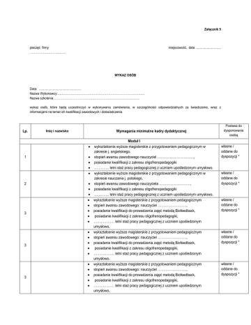 Załącznik 5 pieczęć firmy ………………………….…. miejscowość, data ...................... ...... WYKAZ OSÓB Data: ................................................. Nazwa Wykonawcy:………………………………………………………………………… Nazwa szkolenia:……………………………………………………………………….. wykaz osób, które będą uczestniczyć w wykonywaniu zamówienia, w szczególności odpowiedzialnych za świadczenie, wraz z informacjami na temat ich kwalifikacji zawodowych i doświadczenia Lp. 1 2 3 3 3 Imię i nazwisko Wymagania minimalne kadry dydaktycznej Moduł I wykształcenie wyższe magisterskie z przygotowaniem pedagogicznym w zakresie j. angielskiego, stopień awansu zawodowego nauczyciel ………………………….., posiadanie kwalifikacji z zakresu oligofrenopedagogiki …………. letni staż pracy pedagogicznej z uczniem upośledzonym umysłowo. wykształcenie wyższe magisterskie z przygotowaniem pedagogicznym w zakresie nauczania j. polskiego, stopień awansu zawodowego nauczyciela ………………………, posiadanie kwalifikacji z zakresu oligofrenopedagogiki …………. letni staż pracy pedagogicznej z uczniem upośledzonym umysłowo, wykształcenie wyższe magisterskie z przygotowaniem pedagogicznym stopień awansu zawodowego: nauczyciel ……………………., posiadanie kwalifikacji do prowadzenia zajęć metodą Biofeedback, posiadanie kwalifikacji z zakresu oligofrenopedagogiki, ……………… letni staż pracy pedagogicznej z uczniem upośledzonym umysłowo, wykształcenie wyższe magisterskie z przygotowaniem pedagogicznym stopień awansu zawodowego: nauczyciel ……………………., posiadanie kwalifikacji do prowadzenia zajęć metodą Biofeedback, posiadanie kwalifikacji z zakresu oligofrenopedagogiki, ……………… letni staż pracy pedagogicznej z uczniem upośledzonym umysłowo, wykształcenie wyższe magisterskie z przygotowaniem pedagogicznym stopień awansu zawodowego: nauczyciel ……………………., posiadanie kwalifikacji do prowadzenia zajęć metodą Biofeedback, posiadanie kwalifikacji z zakresu oligofrenopedagogiki, ……………… letni staż pracy pedagogicznej z uczniem upośledzonym umysłowo, Postawa do dysponowania osobą własne / oddane do dyspozycji * własne / oddane do dyspozycji * własne / oddane do dyspozycji * własne / oddane do dyspozycji * własne / oddane do dyspozycji * wykształcenie wyższe magisterskie z przygotowaniem pedagogicznym stopień awansu zawodowego: nauczyciel ……………………., posiadanie kwalifikacji do prowadzenia zajęć metodą Biofeedback, posiadanie kwalifikacji z zakresu oligofrenopedagogiki, ……………… letni staż pracy pedagogicznej z uczniem upośledzonym umysłowo, terapeuta integracji sensorycznej z co najmniej rocznym doświadczeniem w terapii Integracji Sensorycznej, wykształcenie wyższe magisterskie, ……………… letni staż pracy z osobami niepełnosprawnymi. wykształcenie wyższe magisterskie z przygotowaniem pedagogicznym stopień awansu zawodowego: nauczyciel ………………………..., posiadanie kwalifikacji z zakresu oligofrenopedagogiki, …………letni staż pracy pedagogicznej z uczniem upośledzonym umysłowo, wykształcenie wyższe magisterskie z przygotowaniem pedagogicznym stopień awansu zawodowego: nauczyciel ………………………..., posiadanie kwalifikacji z zakresu oligofrenopedagogiki, …………letni staż pracy pedagogicznej z uczniem upośledzonym umysłowo, wykształcenie wyższe magisterskie z przygotowaniem pedagogicznym stopień awansu zawodowego: nauczyciel ………………………..., posiadanie kwalifikacji z zakresu oligofrenopedagogiki, …………letni staż pracy pedagogicznej z uczniem upośledzonym umysłowo, wykształcenie wyższe magisterskie z przygotowaniem pedagogicznym stopień awansu zawodowego: nauczyciel ………………………..., posiadanie kwalifikacji z zakresu oligofrenopedagogiki, …………letni staż pracy pedagogicznej z uczniem upośledzonym umysłowo, minimum 4 osoby, z których każda musi posiadać co najmniej: wykształcenie wyższe magisterskie z przygotowaniem pedagogicznym posiadanie minimum stopnia awansu zawodowego: nauczyciel kontraktowy. posiadanie kwalifikacji z zakresu oligofrenopedagogiki, minimum 3 letni staż pracy pedagogicznej z uczniem upośledzonym umysłowo, Moduł II 3 4 5 5 5 5 6 Lp. 1 1 2 Imię i nazwisko Wymagania minimalne kadry dydaktycznej wykształcenie ………………………………………… doświadczenie w przeprowadzeniu minimum jednego szkolenia grupowego z tematu będącego przedmiotem zamówienia. Uprawnienia pedagogiczne wykształcenie ………………………………………… doświadczenie w przeprowadzeniu minimum jednego szkolenia grupowego z tematu będącego przedmiotem zamówienia. Uprawnienia pedagogiczne wykształcenie ………………………….. doświadczenie w prowadzeniu warsztatów z danego zakresu w jednym szkoleniu grupowym. Uprawnienia pedagogiczne tak/nie ** własne / oddane do dyspozycji * własne / oddane do dyspozycji * własne / oddane do dyspozycji * własne / oddane do dyspozycji * własne / oddane do dyspozycji * własne / oddane do dyspozycji * własne / oddane do dyspozycji * własne / oddane do dyspozycji * własne / oddane do dyspozycji * własne / oddane do dyspozycji * własne / oddane do dyspozycji * wykształcenie ………………………….. doświadczenie w prowadzeniu warsztatów grupowym. Uprawnienia pedagogiczne tak/nie ** wykształcenie ………………………….. doświadczenie w prowadzeniu warsztatów grupowym. Uprawnienia pedagogiczne tak/nie ** wykształcenie wyższe ………………………. doświadczenie w prowadzeniu warsztatów grupowym. Uprawnienia pedagogiczne tak/nie ** wykształcenie wyższe ………………………. doświadczenie w prowadzeniu warsztat