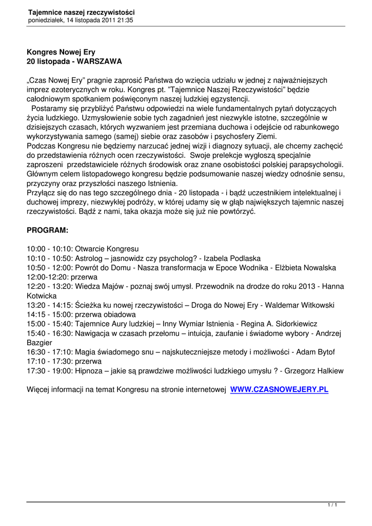 Tajemnice naszej rzeczywistości poniedziałek, 14 listopada 2011 21:35 Kongres Nowej Ery 20 listopada - WARSZAWA „Czas Nowej Ery” pragnie zaprosić Państwa do wzięcia udziału w jednej z najważniejszych imprez ezoterycznych w roku. Kongres pt. ”Tajemnice Naszej Rzeczywistości” będzie całodniowym spotkaniem poświęconym naszej ludzkiej egzystencji. Postaramy się przybliżyć Państwu odpowiedzi na wiele fundamentalnych pytań dotyczących życia ludzkiego. Uzmysłowienie sobie tych zagadnień jest niezwykle istotne, szczególnie w dzisiejszych czasach, których wyzwaniem jest przemiana duchowa i odejście od rabunkowego wykorzystywania samego (samej) siebie oraz zasobów i psychosfery Ziemi. Podczas Kongresu nie będziemy narzucać jednej wizji i diagnozy sytuacji, ale chcemy zachęcić do przedstawienia różnych ocen rzeczywistości. Swoje prelekcje wygłoszą specjalnie zaproszeni przedstawiciele różnych środowisk oraz znane osobistości polskiej parapsychologii. Głównym celem listopadowego kongresu będzie podsumowanie naszej wiedzy odnośnie sensu, przyczyny oraz przyszłości naszego Istnienia. Przyłącz się do nas tego szczególnego dnia - 20 listopada - i bądź uczestnikiem intelektualnej i duchowej imprezy, niezwykłej podróży, w której udamy się w głąb największych tajemnic naszej rzeczywistości. Bądź z nami, taka okazja może się już nie powtórzyć. PROGRAM: 10:00 - 10:10: Otwarcie Kongresu 10:10 - 10:50: Astrolog – jasnowidz czy psycholog? - Izabela Podlaska 10:50 - 12:00: Powrót do Domu - Nasza transformacja w Epoce Wodnika - Elżbieta Nowalska 12:00-12:20: przerwa 12:20 - 13:20: Wiedza Majów - poznaj swój umysł. Przewodnik na drodze do roku 2013 - Hanna Kotwicka 13:20 - 14:15: Ścieżka ku nowej rzeczywistości – Droga do Nowej Ery - Waldemar Witkowski 14:15 - 15:00: przerwa obiadowa 15:00 - 15:40: Tajemnice Aury ludzkiej – Inny Wymiar Istnienia - Regina A. Sidorkiewicz 15:40 - 16:30: Nawigacja w czasach przełomu – intuicja, zaufanie i świadome wybory - Andrzej Bazgier 16:30 - 17:10: Magia świadomego snu – najskuteczniejsze metody i możliwości - Adam Bytof 17:10 - 17:30: przerwa 17:30 - 19:00: Hipnoza – jakie są prawdziwe możliwości ludzkiego umysłu ? - Grzegorz Halkiew Więcej informacji na temat Kongresu na stronie internetowej WWW.CZASNOWEJERY.PL 1/1