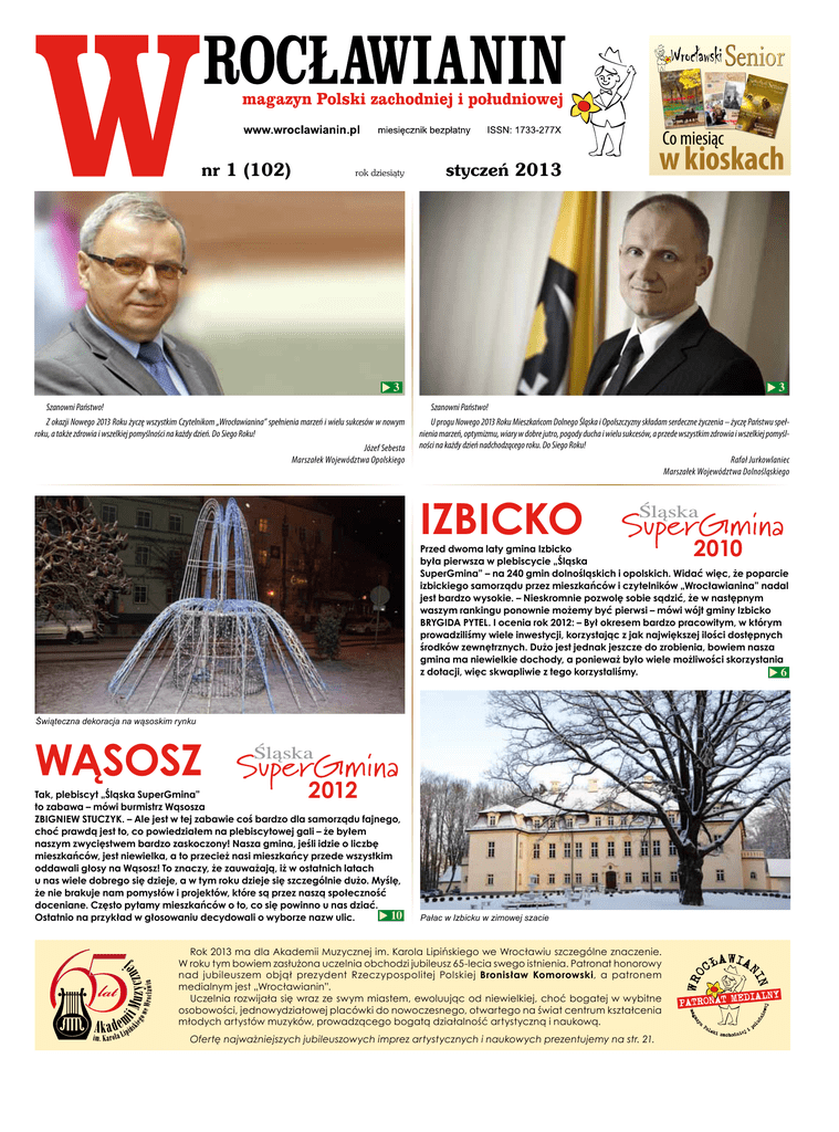 Co miesiąc nr 1 (102) rok dziesiąty styczeń 2013 w kioskach 3 Szanowni Państwo! Z okazji Nowego 2013 Roku życzę wszystkim Czytelnikom „Wrocławianina” spełnienia marzeń i wielu sukcesów w nowym roku, a także zdrowia i wszelkiej pomyślności na każdy dzień. Do Siego Roku! Józef Sebesta Marszałek Województwa Opolskiego 3 Szanowni Państwo! U progu Nowego 2013 Roku Mieszkańcom Dolnego Śląska i Opolszczyzny składam serdeczne życzenia – życzę Państwu spełnienia marzeń, optymizmu, wiary w dobre jutro, pogody ducha i wielu sukcesów, a przede wszystkim zdrowia i wszelkiej pomyślności na każdy dzień nadchodzącego roku. Do Siego Roku! Rafał Jurkowlaniec Marszałek Województwa Dolnośląskiego IZBICKO 2010 Przed dwoma laty gmina Izbicko była pierwsza w plebiscycie „Śląska SuperGmina” – na 240 gmin dolnośląskich i opolskich. Widać więc, że poparcie izbickiego samorządu przez mieszkańców i czytelników „Wrocławianina” nadal jest bardzo wysokie. – Nieskromnie pozwolę sobie sądzić, że w następnym waszym rankingu ponownie możemy być pierwsi – mówi wójt gminy Izbicko Brygida Pytel. I ocenia rok 2012: – Był okresem bardzo pracowitym, w którym prowadziliśmy wiele inwestycji, korzystając z jak największej ilości dostępnych środków zewnętrznych. Dużo jest jednak jeszcze do zrobienia, bowiem nasza gmina ma niewielkie dochody, a ponieważ było wiele możliwości skorzystania z dotacji, więc skwapliwie z tego korzystaliśmy. 6 Świąteczna dekoracja na wąsoskim rynku WĄSOSZ 2012 Tak, plebiscyt „Śląska SuperGmina” to zabawa – mówi burmistrz Wąsosza Zbigniew Stuczyk. – Ale jest w tej zabawie coś bardzo dla samorządu fajnego, choć prawdą jest to, co powiedziałem na plebiscytowej gali – że byłem naszym zwycięstwem bardzo zaskoczony! Nasza gmina, jeśli idzie o liczbę mieszkańców, jest niewielka, a to przecież nasi mieszkańcy przede wszystkim oddawali głosy na Wąsosz! To znaczy, że zauważają, iż w ostatnich latach u nas wiele dobrego się dzieje, a w tym roku dzieje się szczególnie dużo. Myślę, że nie brakuje nam pomysłów i projektów, które są przez naszą społeczność doceniane. Często pytamy mieszkańców o to, co się powinno u nas dziać. 10 Ostatnio na przykład w głosowaniu decydowali o wyborze nazw ulic. Pałac w Izbicku w zimowej szacie Rok 2013 ma dla Akademii Muzycznej im. Karola Lipińskiego we Wrocławiu szczególne znaczenie. W roku tym bowiem zasłużona uczelnia obchodzi jubileusz 65-lecia swego istnienia. Patronat honorowy nad jubileuszem objął prezydent Rzeczypospolitej Polskiej Bronisław Komorowski, a patronem medialnym jest „Wrocławianin”. Uczelnia rozwijała się wraz ze swym miastem, ewoluując od niewielkiej, choć bogatej w wybitne osobowości, jednowydziałowej placówki do nowoczesnego, otwartego na świat centrum kształcenia młodych artystów muzyków, prowadzącego bogatą działalność artystyczną i naukową. Ofertę najważniejszych jubileuszowych imprez artystycznych i naukowych prezentujemy na str. 21. 2 W ROCŁAWIANIN nr 1 (102) st yczeń 2013 Mity, fakty, opowiastki Do Siego Roku!!! Czego życzyć dolnośląskim i opolskim włodarzom gmin w roku 2013 – poza tradycyjnymi życzeniami zdrowia i szczęścia? Przede wszystkim – wytrwałości i konsekwencji w pracy na rzecz lokalnych społeczności. Dobrych pomysłów i umiejętności korzystania ze sprawdzonych już wzorców i podpowiedzi. Mądrych, niezacietrzewionych radnych i poparcia mieszkańców gmin. Nowoczesnego podejścia do zarządzania gminami i umiejętnej decentralizacji tegoż zarządzania. Uśmiechu, pozytywnej energii, optymizmu i przeświadczenia, że praca – nawet ta najtrudniejsza – da wreszcie satysfakcjonujące owoce. Zgody w gminach, urzędach i radach gmin, bowiem jak niegdyś mówili starożytni Rzymianie – gdzie zgoda, tam zwycięstwo. Kindersztuby, skromności i uprzejmości, bo bez tego sprawnie rządzić się nie da. Zreformowania baz oświatowych i w miarę łagodnego wprowadzenia ustawy o utrzymaniu czystości i porządku w gminach. Aby rząd RP zdał sobie wreszcie sprawę z tego, że część jego polityki nie powinna polegać tylko na zrzucaniu na barki samorządów niewygodnych problemów, bez odpowiedniej finansowej rekompensaty. Nieustającej chęci niwelowania zaszłości i jak największego czerpania ze zdobyczy cywilizacyjnych. Otwartych głów na niegłupie, ekologiczne inwestycje mające przed sobą przyszłość. Niezłomnej wiary w to, że zarządzane przez nich gminy są najpiękniejsze, najgospodarniejsze i że w większości są zamieszkane przez mądrych, prawych i pracowitych ludzi. Bezbolesnej spłaty długów i umiejętnego pozyskiwania środków zewnętrznych. Równorzędnego i sprawiedliwego traktowania przez władze wojewódzkie i urzędy marszałkowskie. Większej otwartości na świat, nowinki i promowanie swoich gmin, bo bez tego trudno mówić o innowacyjności, rozwoju gospodarki, turystyki i pozyskiwaniu nowych miejsc pracy. Sukcesów w rankingach i prestiżowych konkursach, a także umiejętnego korzystania z wolnego czasu i jak najlepszego wypoczynku, gdy tylko jest to możliwe. Szanowne Panie i Panowie Prezydenci, Burmistrzowie i Wójtowie, życzę Państwu – w imieniu redakcji „Wrocławianina” – Do Siego Roku! Sławomir Grymin Legendarny podhalański zbójnik Janosik podobno zabierał bogatym i oddawał biednym, dzisiaj – i nie jest to żadna bajka – zamożne samorządy muszą przekazywać opłaty wyrównawcze gminom, cierpiącym na brak środków finansowych. Od 2003 roku Warszawa wydała na daninę dla uboższych ponad 6 mld zł, a Kraków około 500 mln zł. W tym roku stolica zapłaci prawie 800 mln zł „janosikowego”, a Kraków około 70 mln zł, dlatego nic dziwnego, że właśnie te miasta zaskarżyły do Trybunału Konstytucyjnego niektóre przepisy ustawy o „janosikowym”. Przedstawiciele d